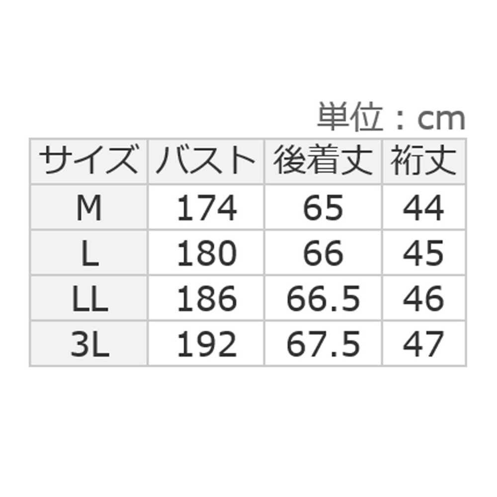 サイズ表記 L LL 3L バスト 180 186 192 後着丈 66 66.5 67.5 裄丈 45 46 47