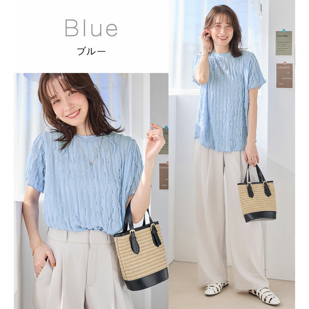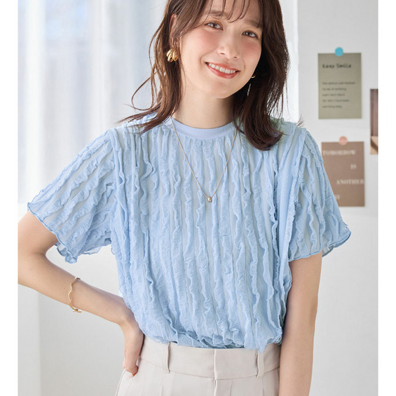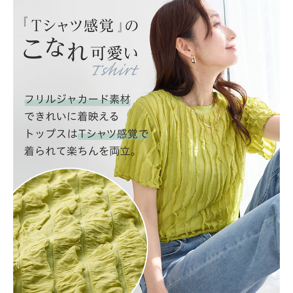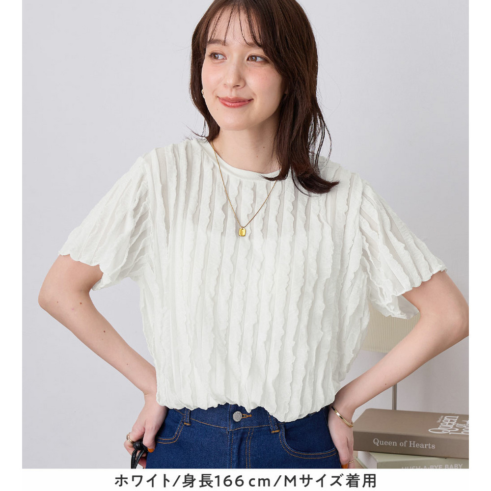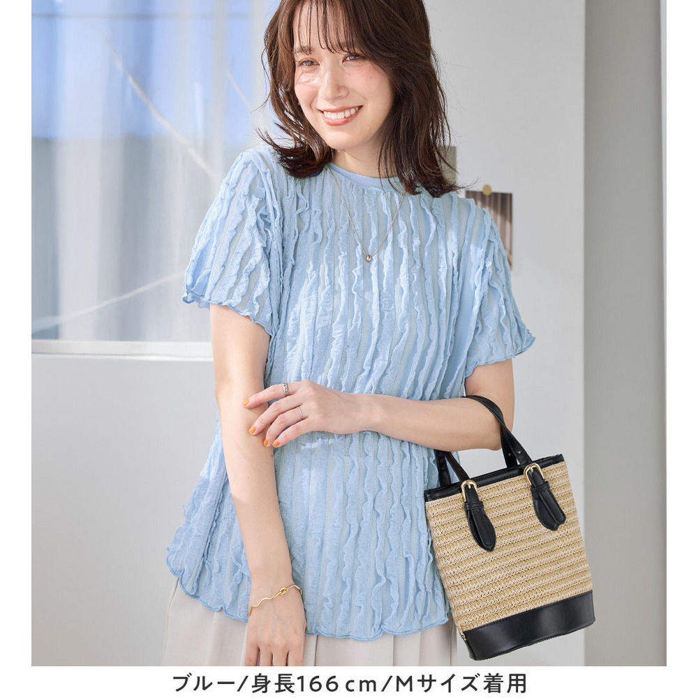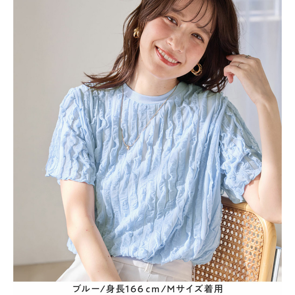 表情豊かなフリル素材:表面に凹凸感(フリル&楊柳のようなシボ感)のある素材を使用。Tシャツ感覚で着られるのにブラウスのような華やかさがあります。