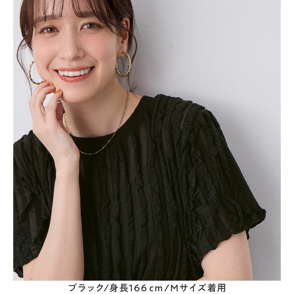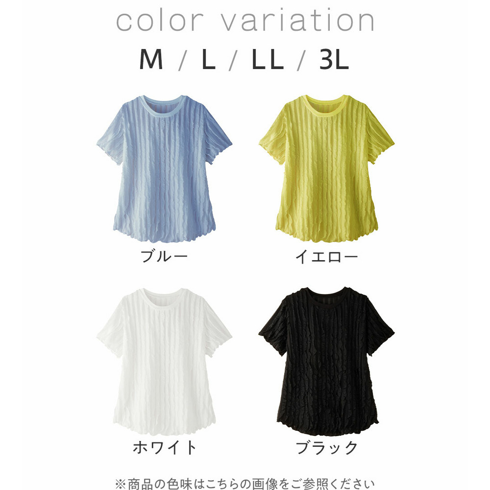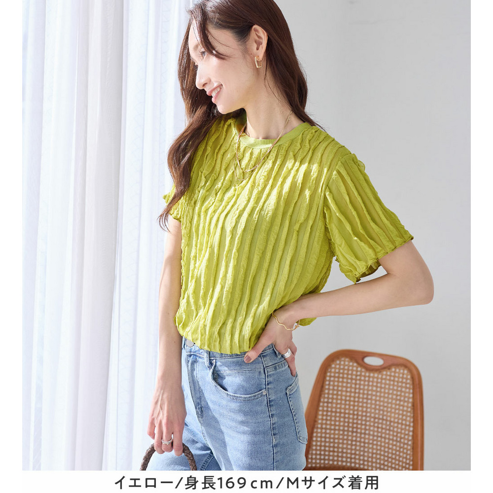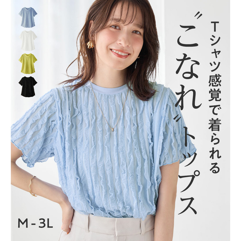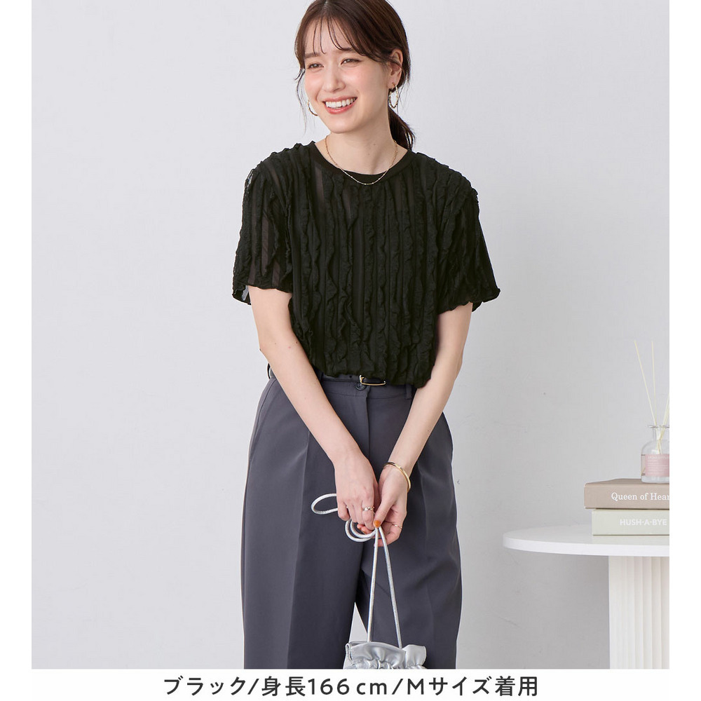 表情豊かなフリル素材:表面に凹凸感(フリル&楊柳のようなシボ感)のある素材を使用。Tシャツ感覚で着られるのにブラウスのような華やかさがあります。