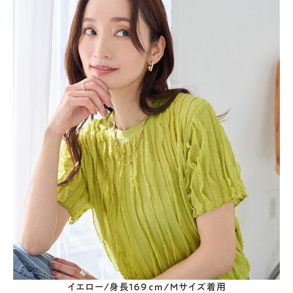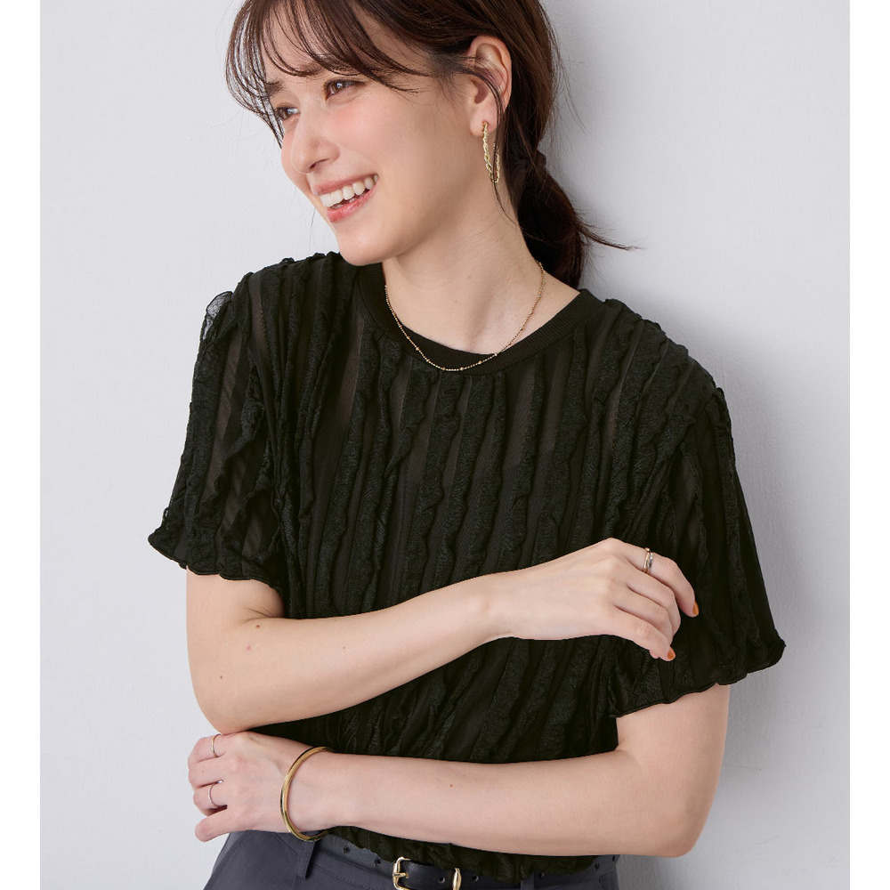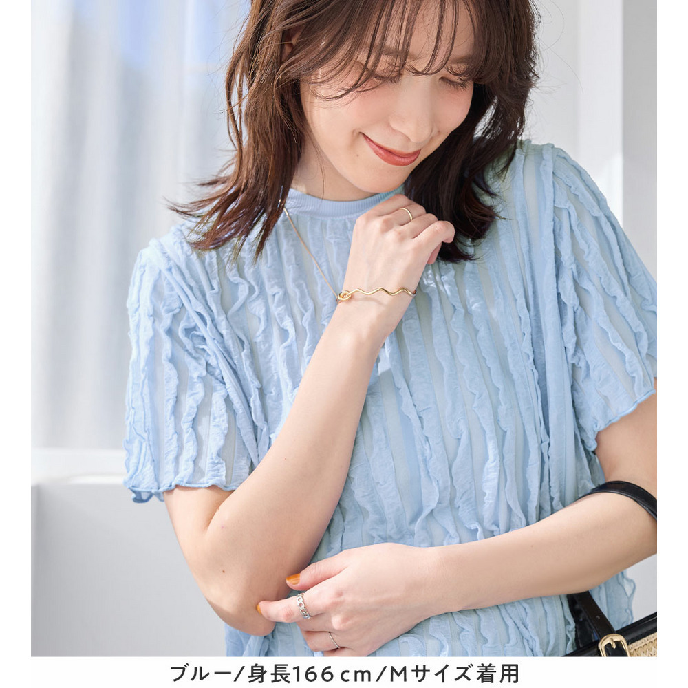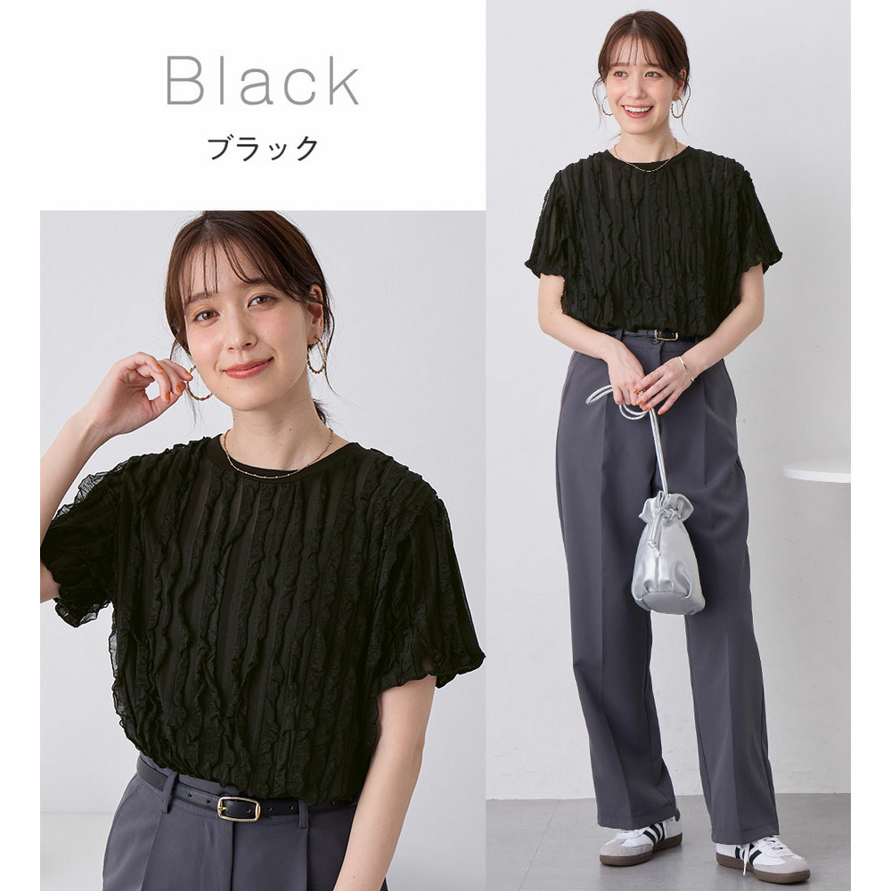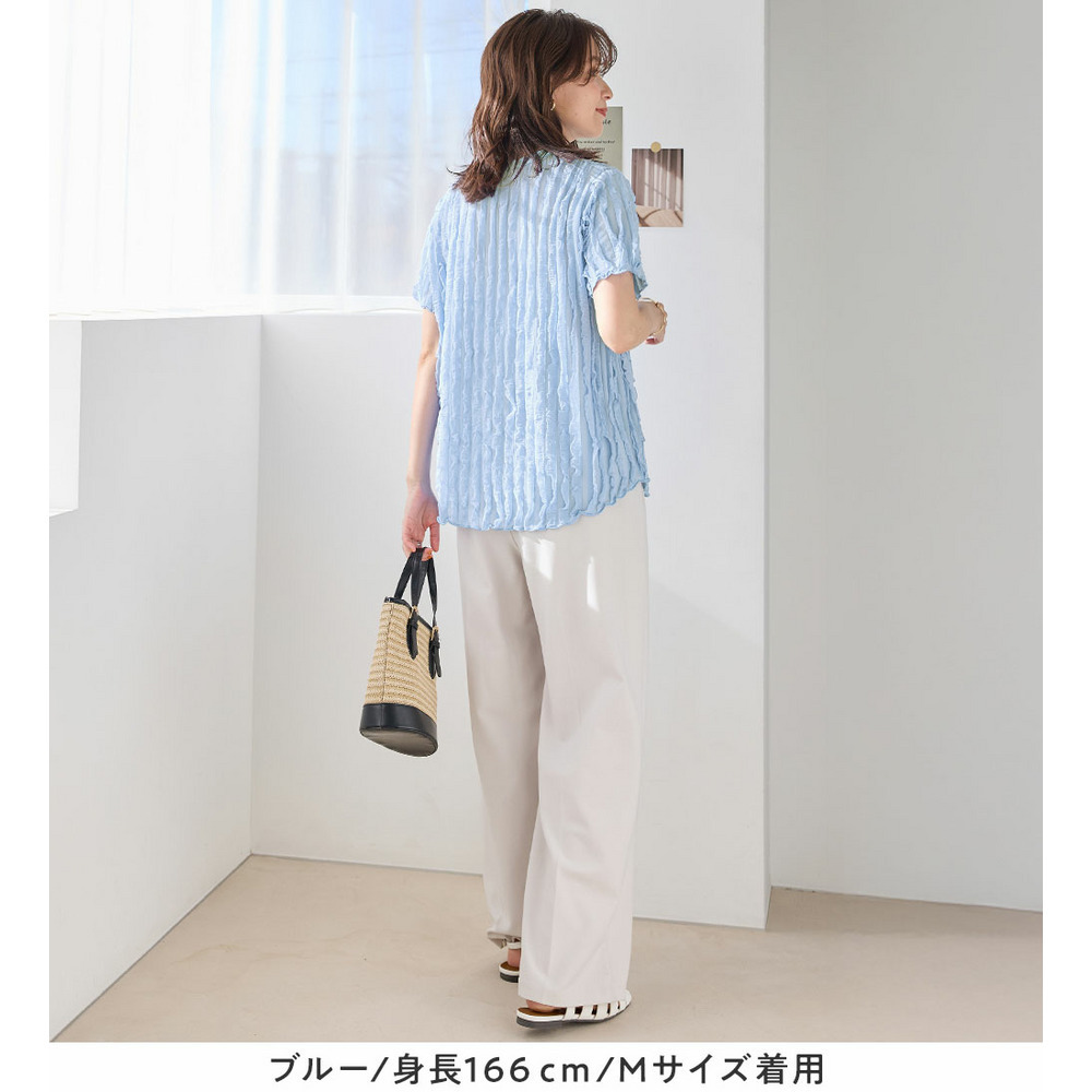 表情豊かなフリル素材:表面に凹凸感(フリル&楊柳のようなシボ感)のある素材を使用。Tシャツ感覚で着られるのにブラウスのような華やかさがあります。