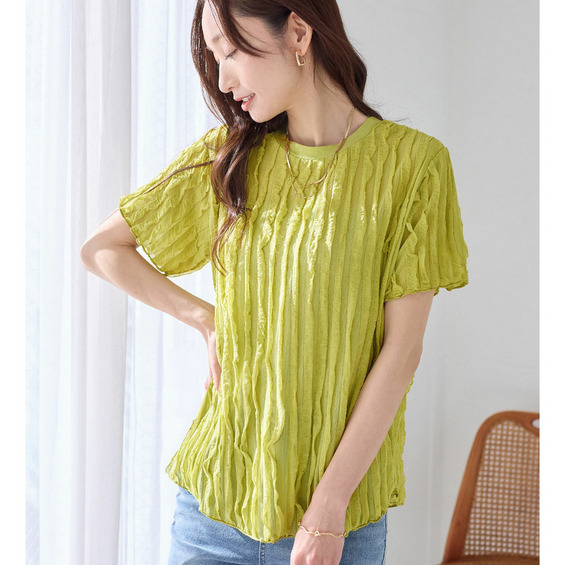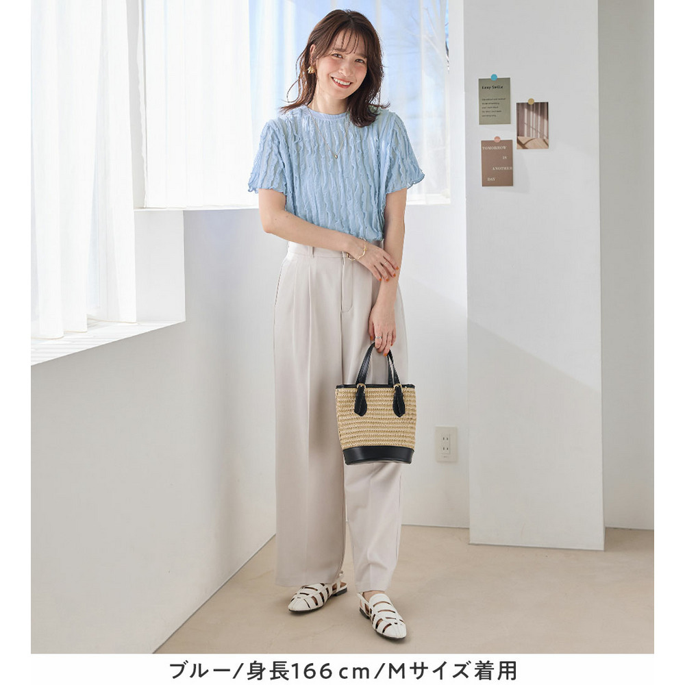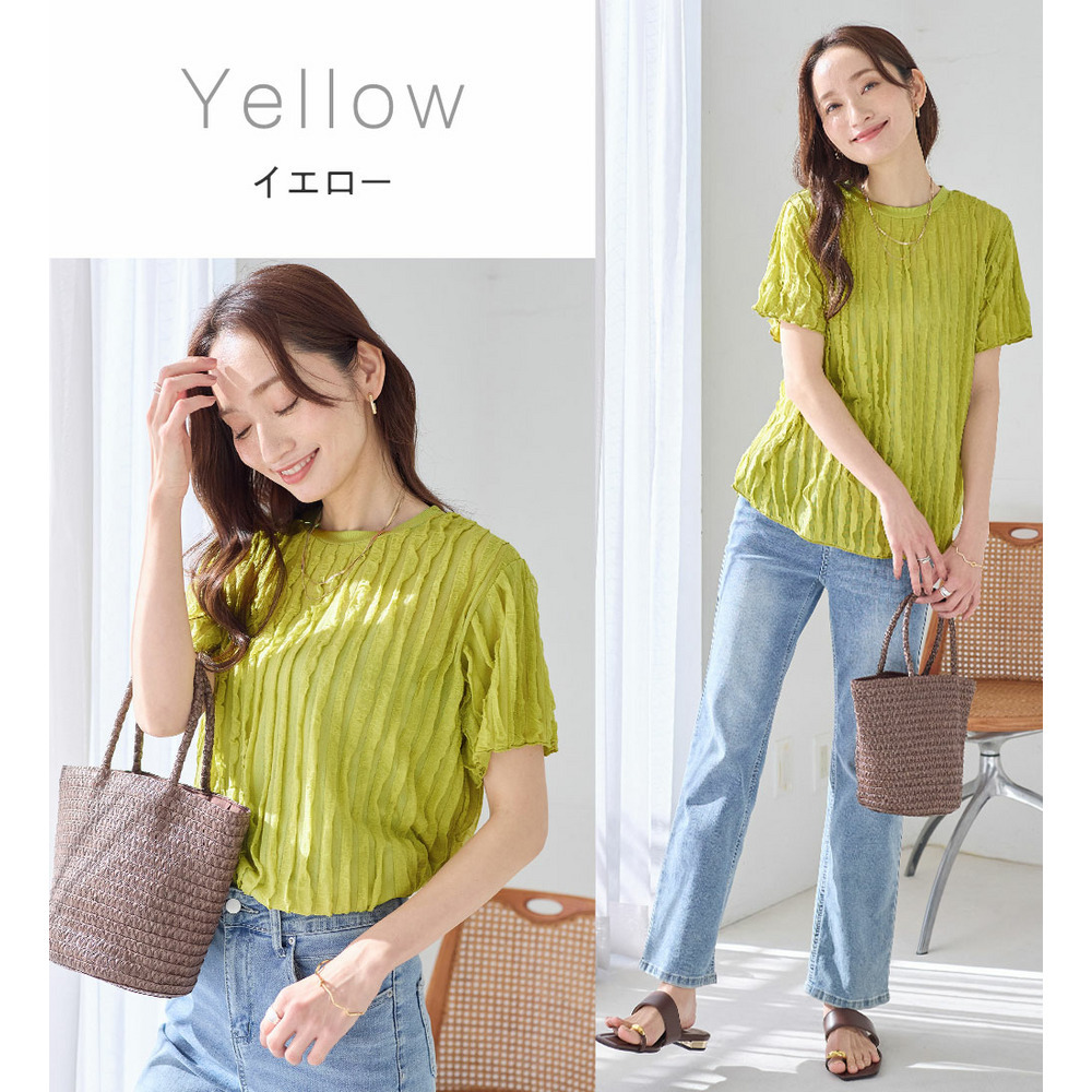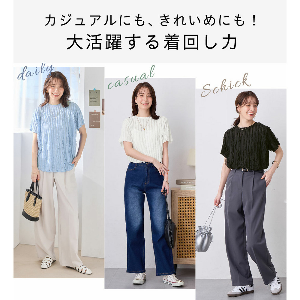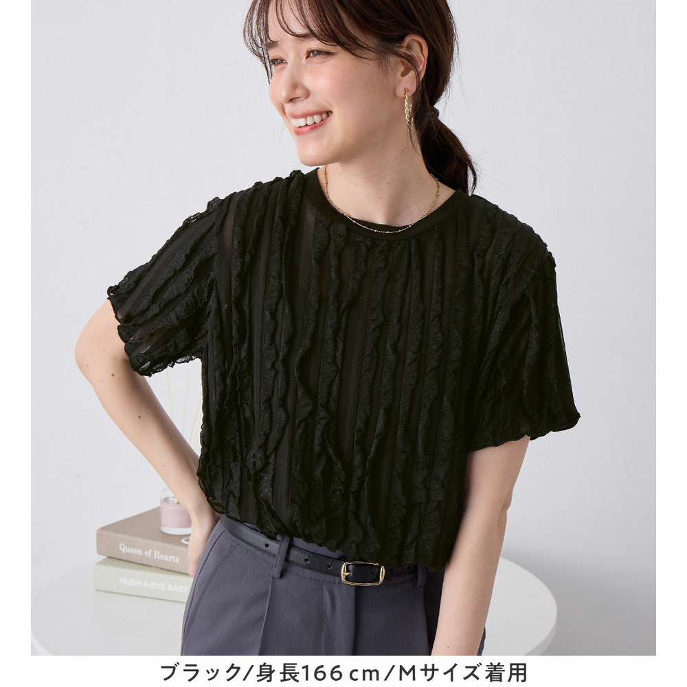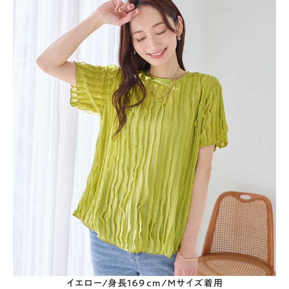 表情豊かなフリル素材:表面に凹凸感(フリル&楊柳のようなシボ感)のある素材を使用。Tシャツ感覚で着られるのにブラウスのような華やかさがあります。