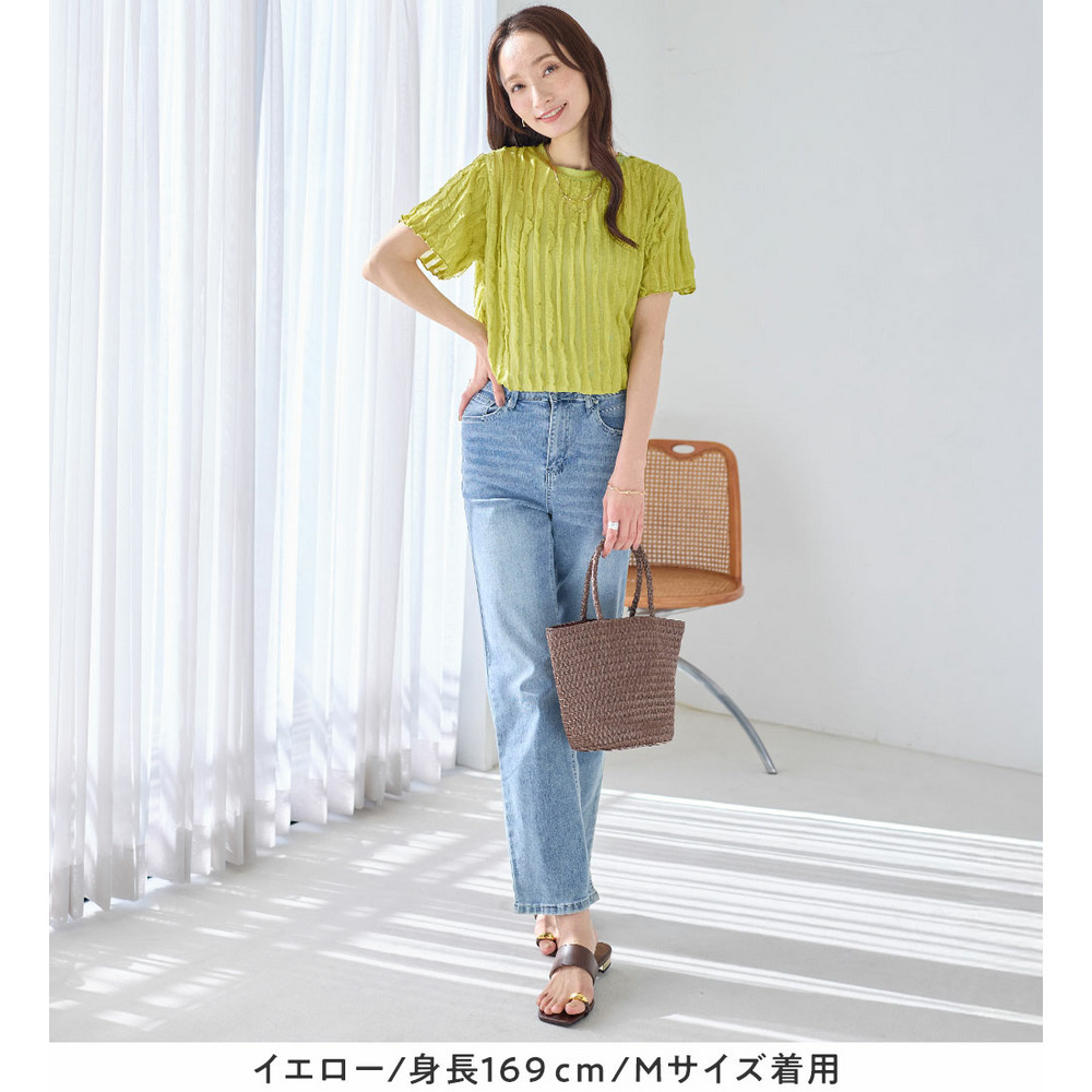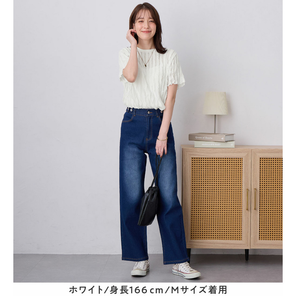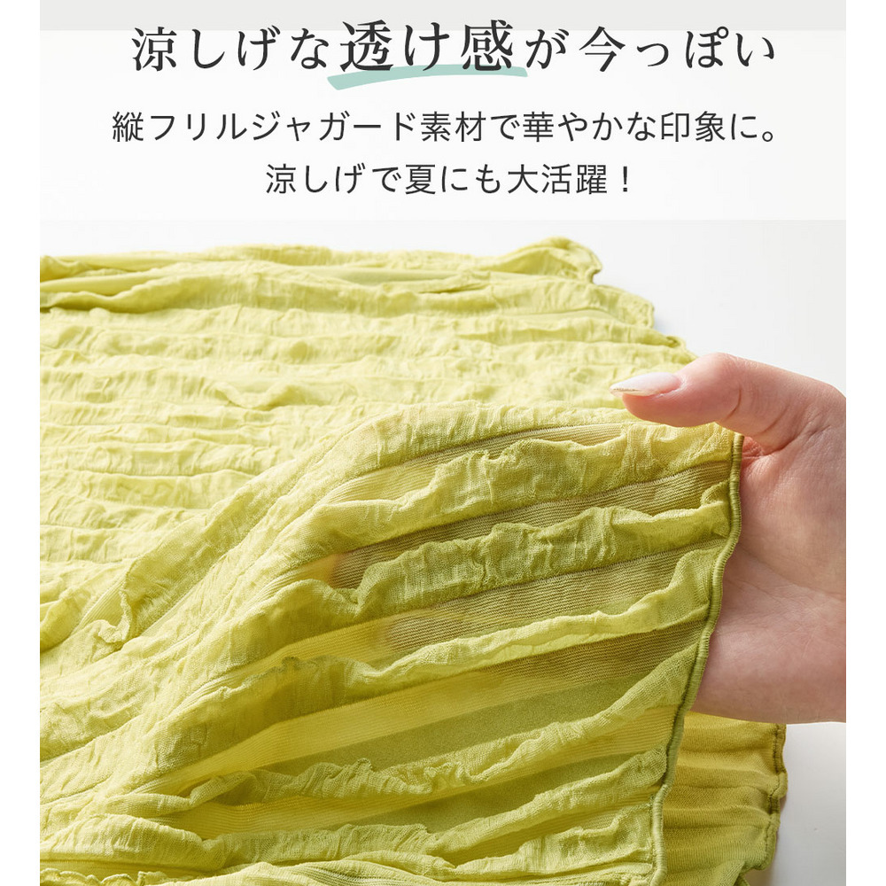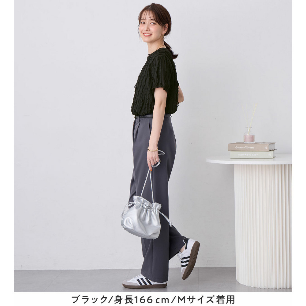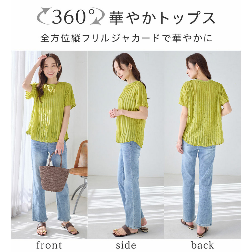 表情豊かなフリル素材:表面に凹凸感(フリル&楊柳のようなシボ感)のある素材を使用。Tシャツ感覚で着られるのにブラウスのような華やかさがあります。