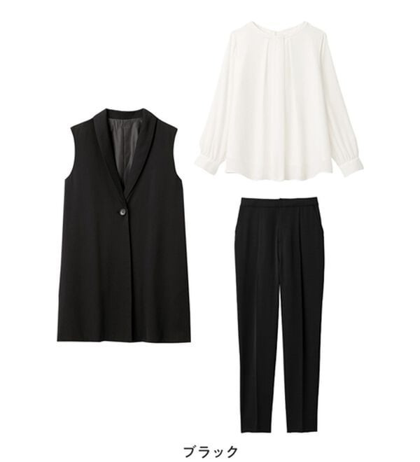 ・簡単に、お洒落見え&キチンと見える、ロングジレ・ブラウス・パンツの3点セットアイテム。