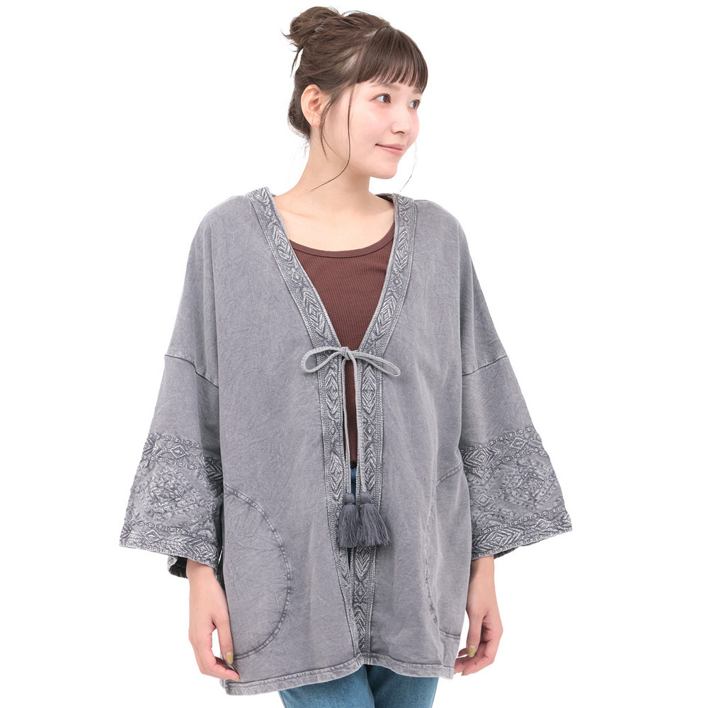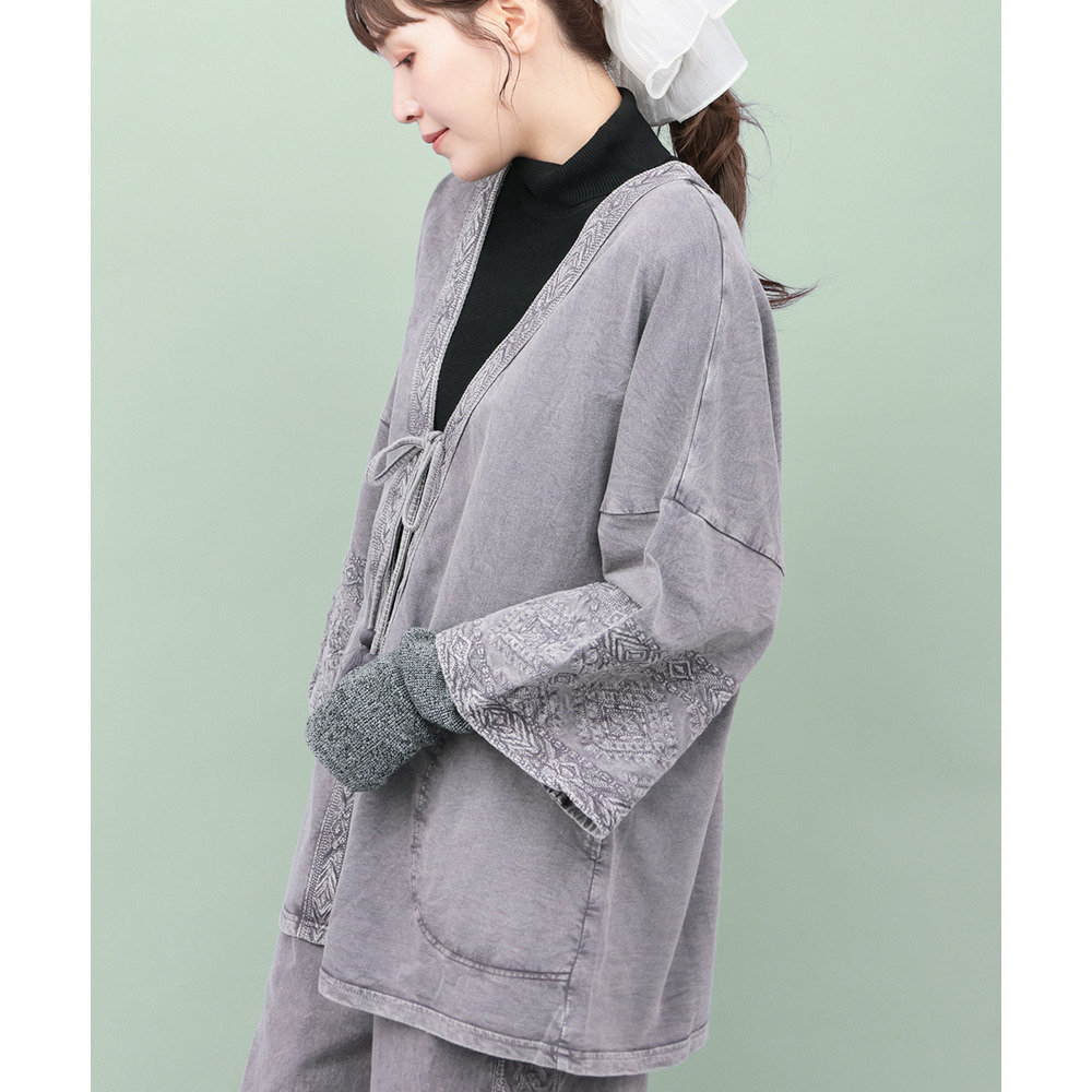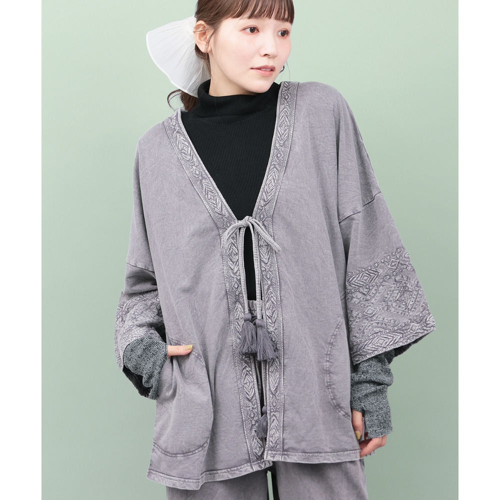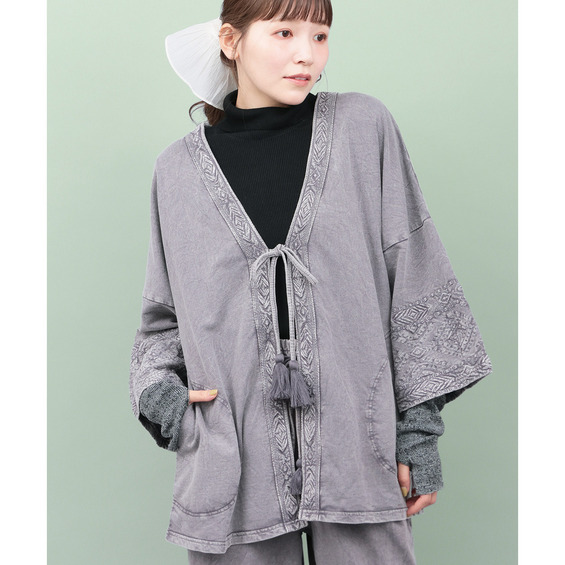 ガウンのように着られてタッセル付きの紐で開け閉めができ、リラックス感のある着こなしが楽しめます。