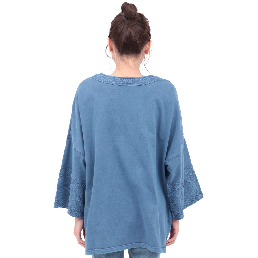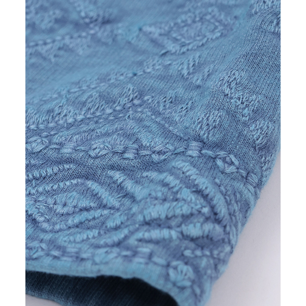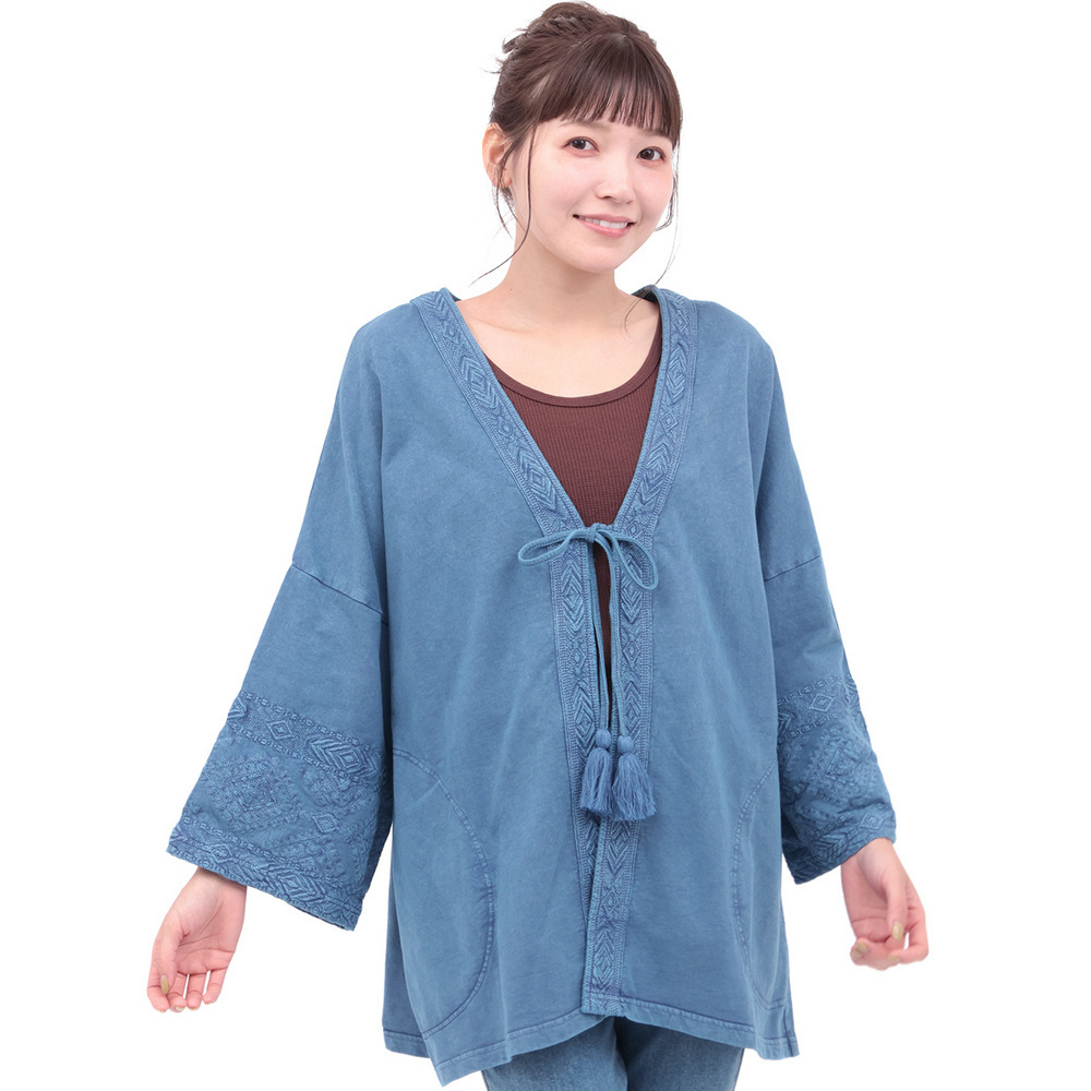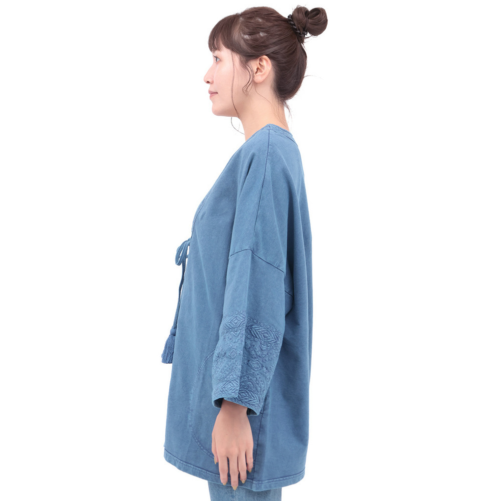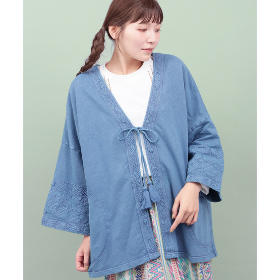 衿と袖にあしらった幾何学刺繍は、グアテマラの民族衣装「ウィピール」の模様をチチカカらしくアレンジしたデザイン。