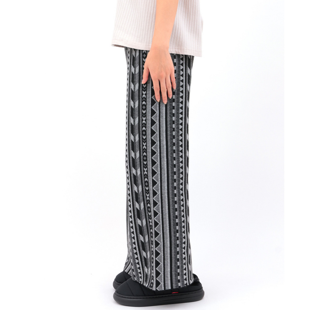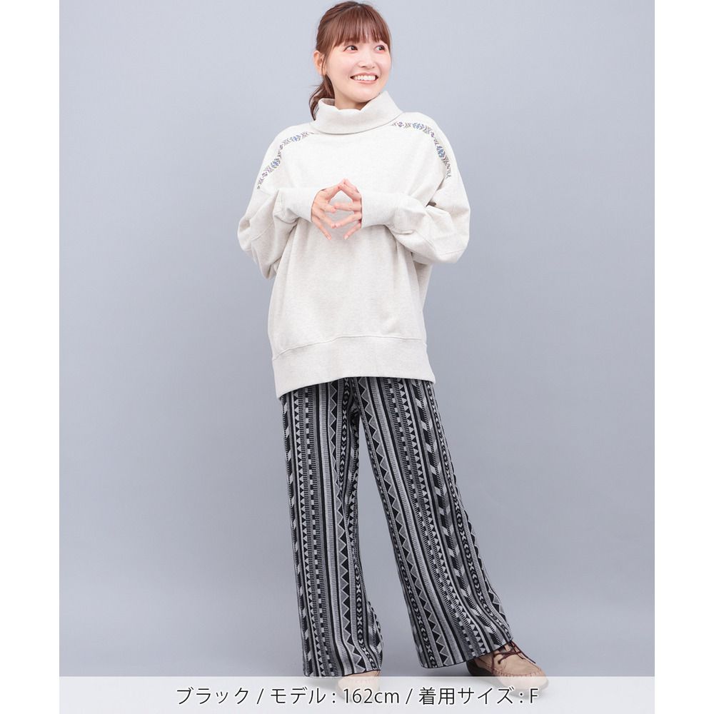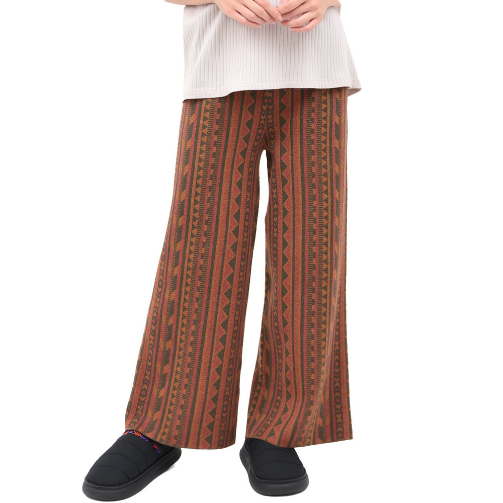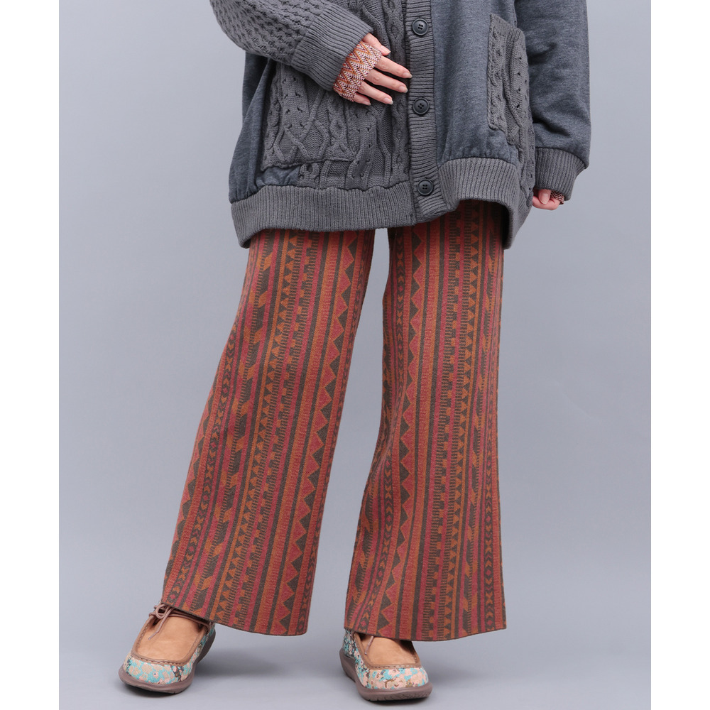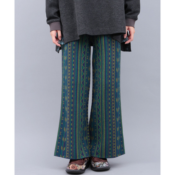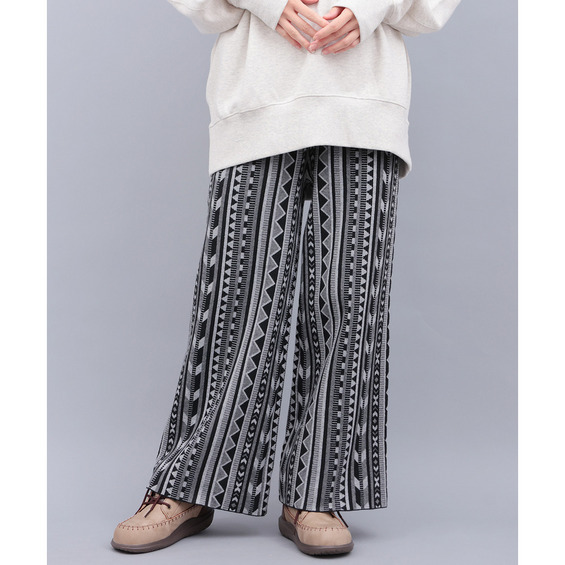 個性的な幾何学柄の総柄が目を惹くワイドパンツ。