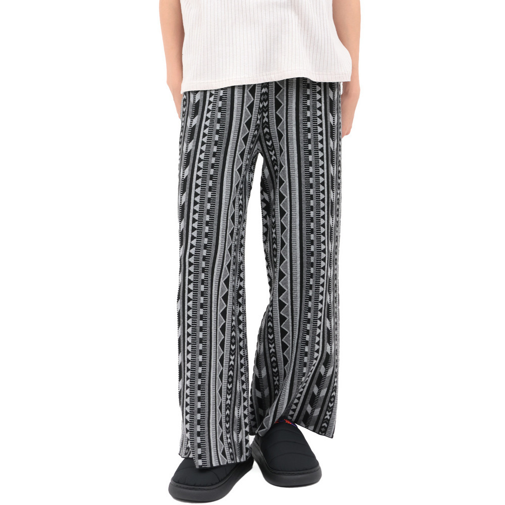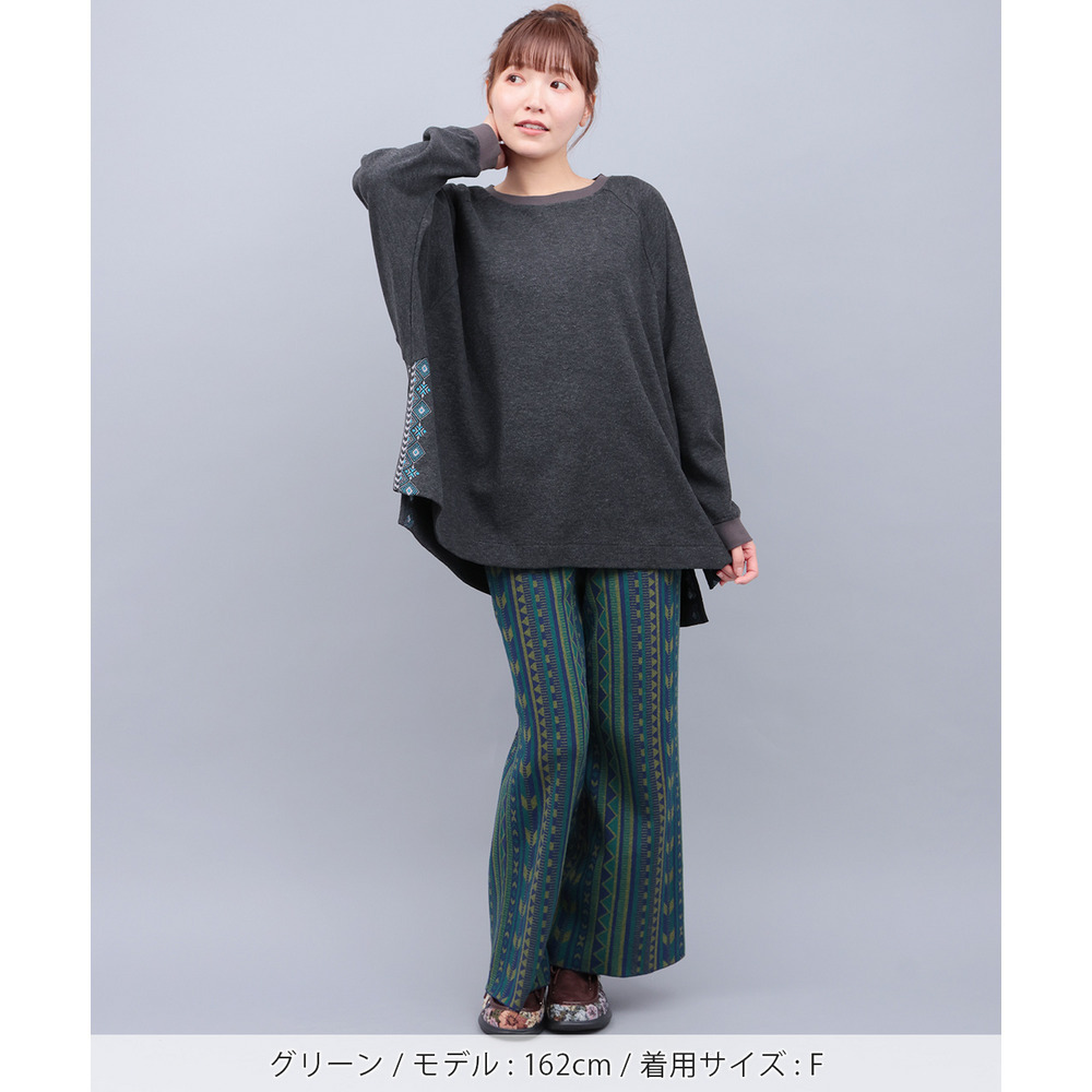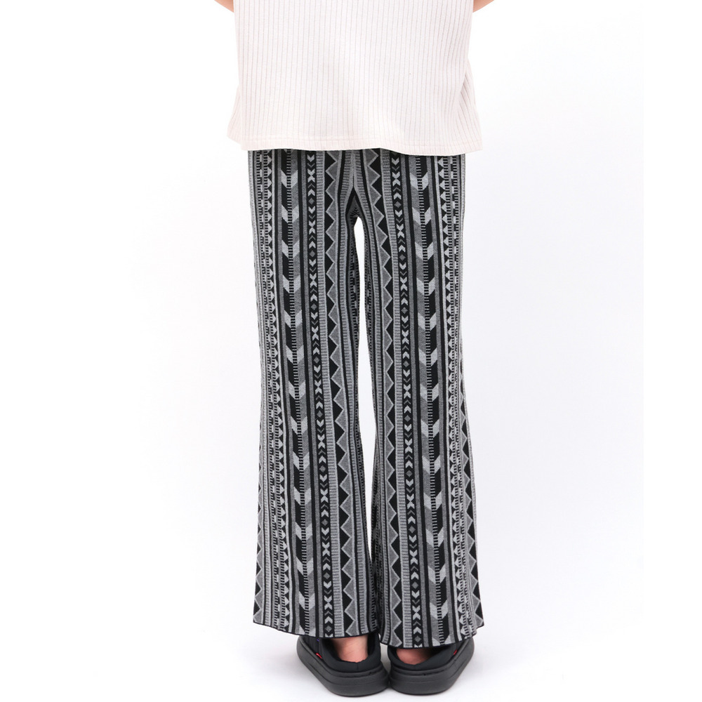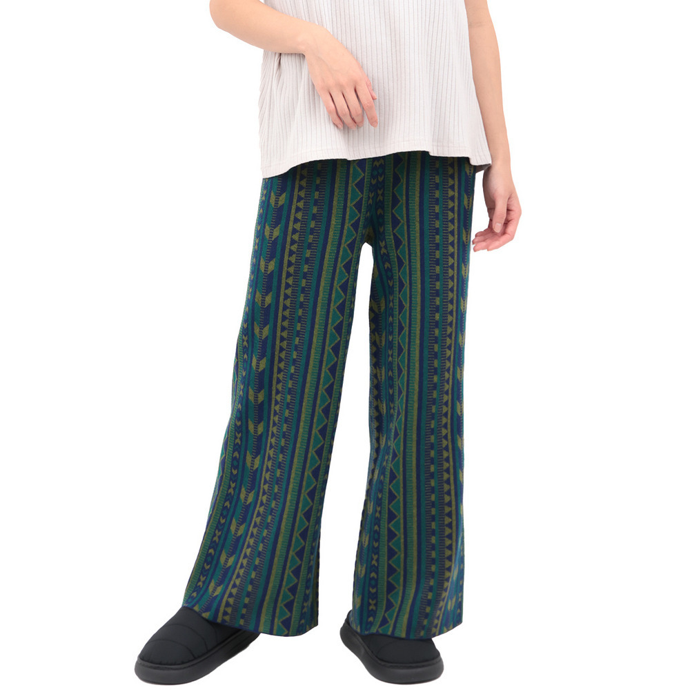 個性的な幾何学柄の総柄が目を惹くワイドパンツ。