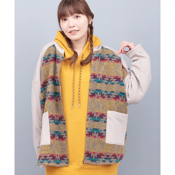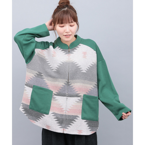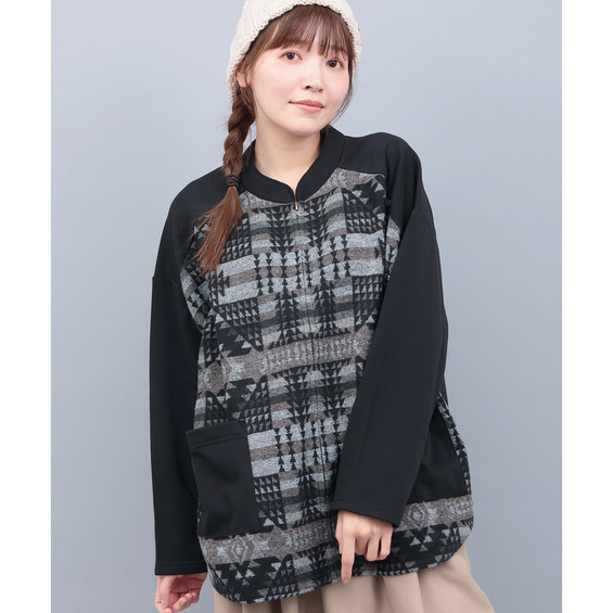 スウェット生地をベースに、身頃部分にはたっぷりとジャカード生地をあしらいました。
