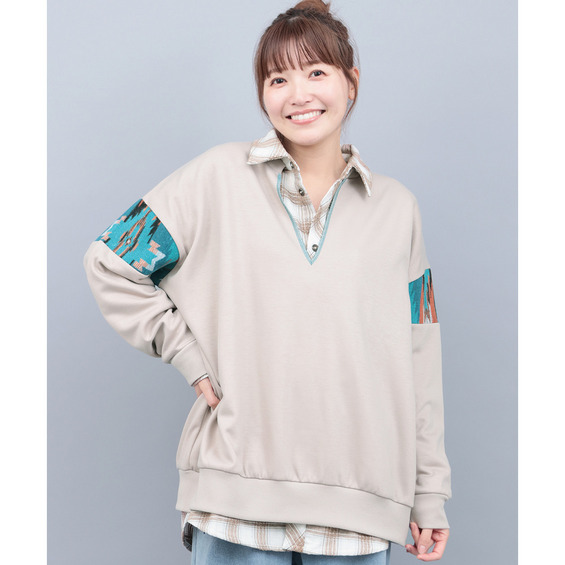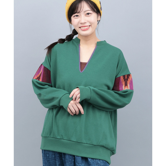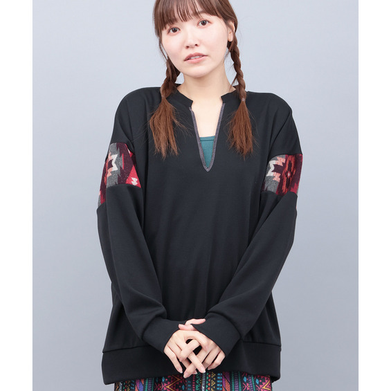 フォークロアな雰囲気漂う、スリットネックプルオーバー