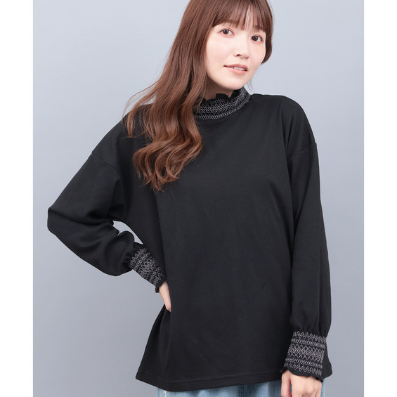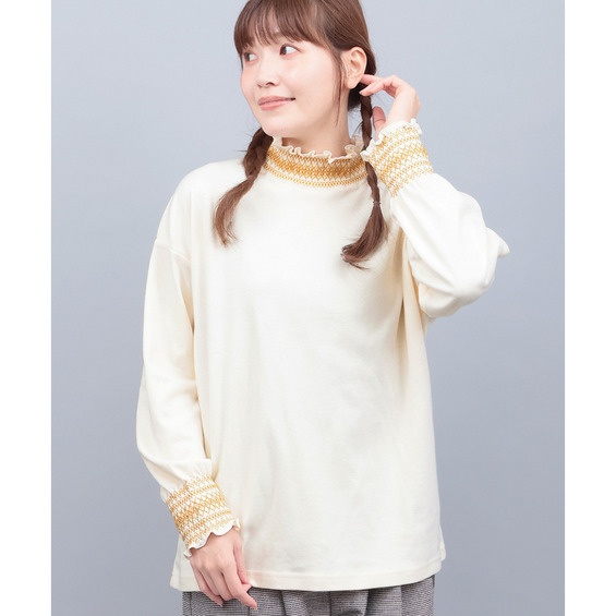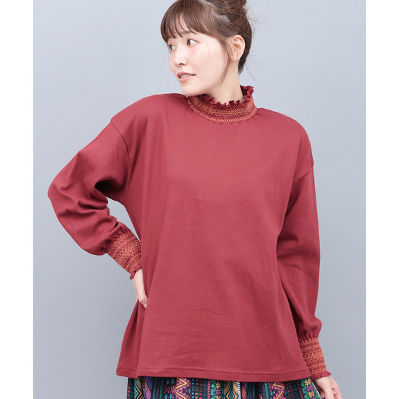 シャーリング部分には配色刺繍を施し、さりげなく華やかな印象に。