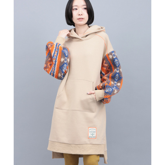 パーカーワンピースの袖をボア生地で切り替えた個性が光る1枚。