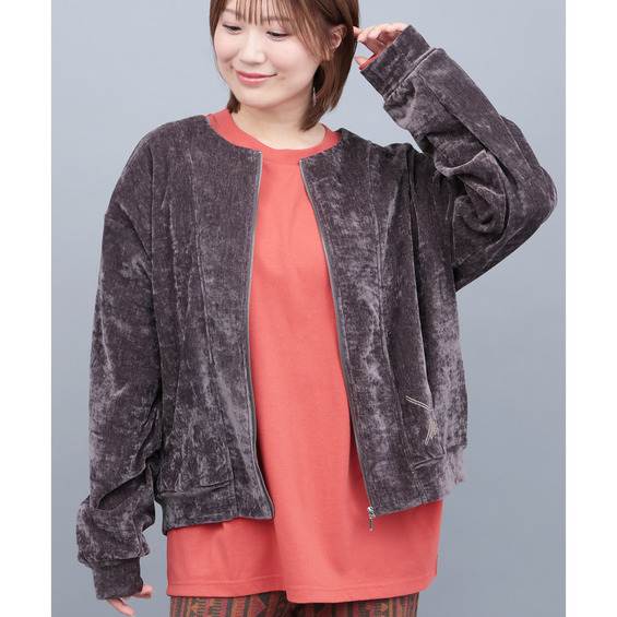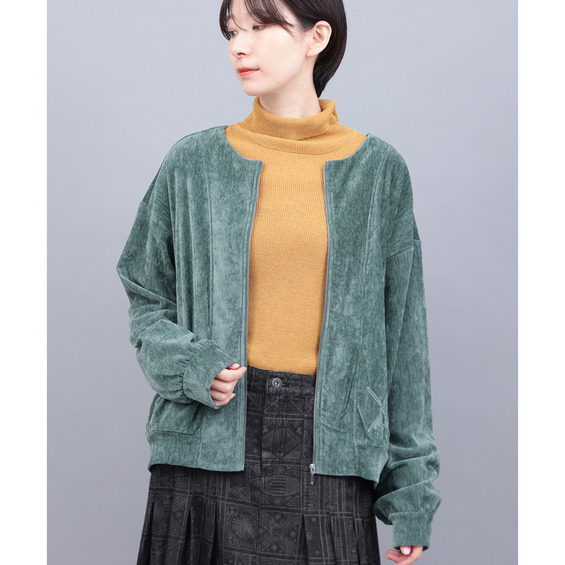 マットな光沢が上品に映えるモール生地のジップカーディガン。
