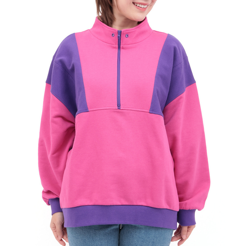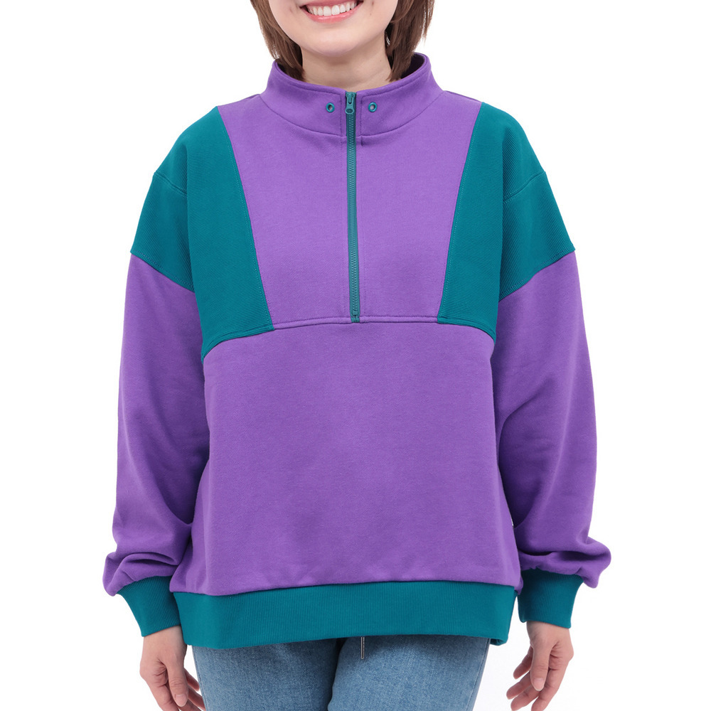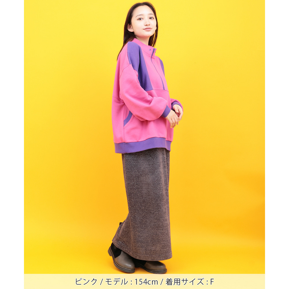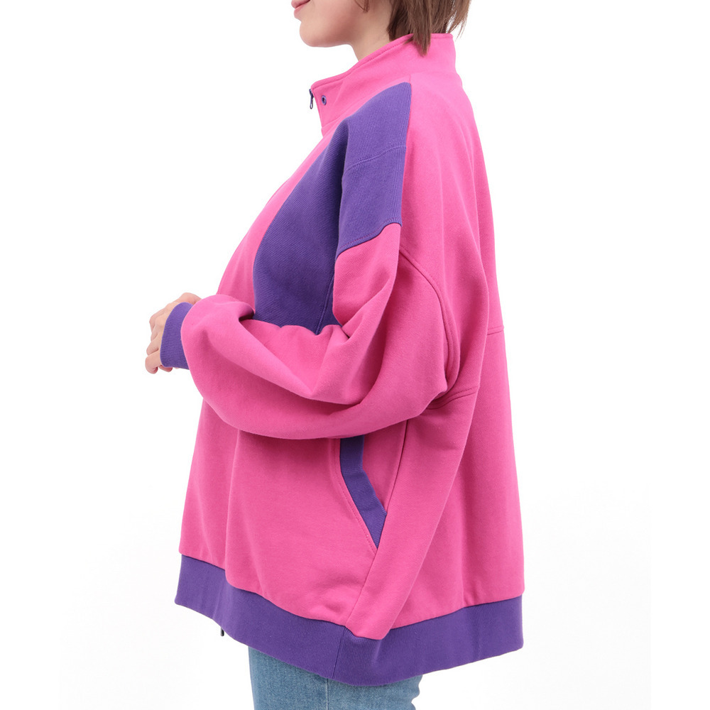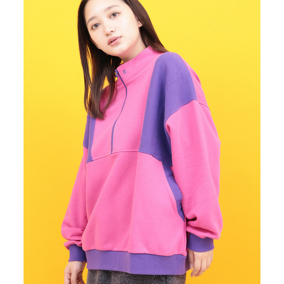 ファスナーとハトメのアクセント、そしてリブに効かせたPOPな配色が魅力のハーフジッププルオーバー。