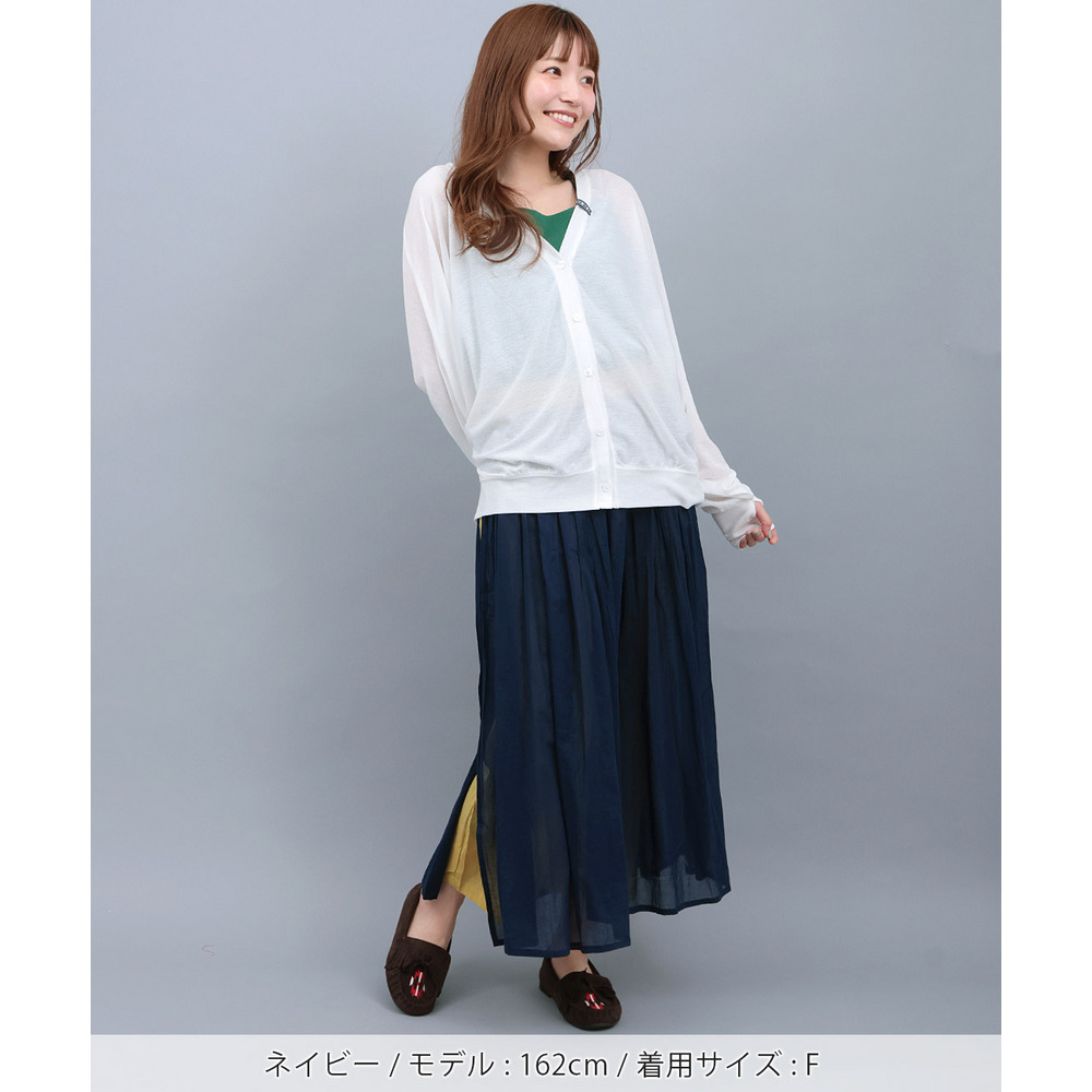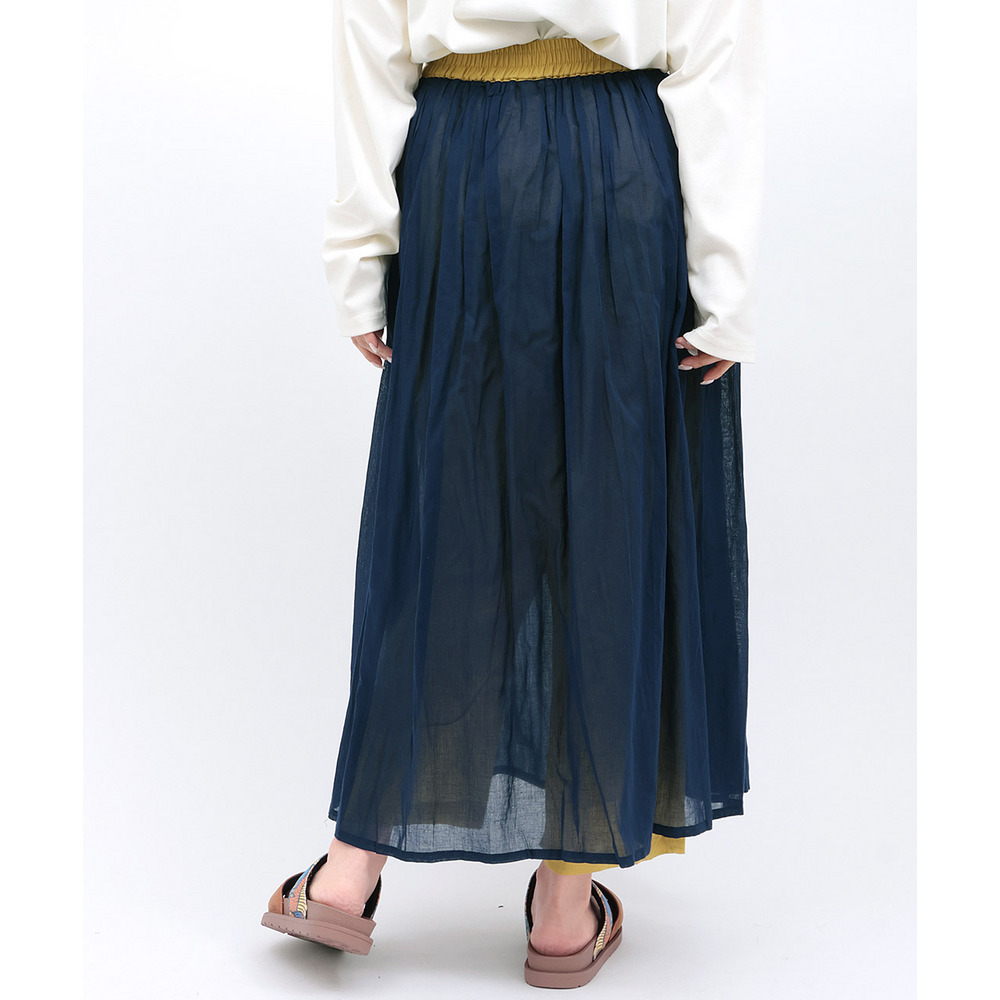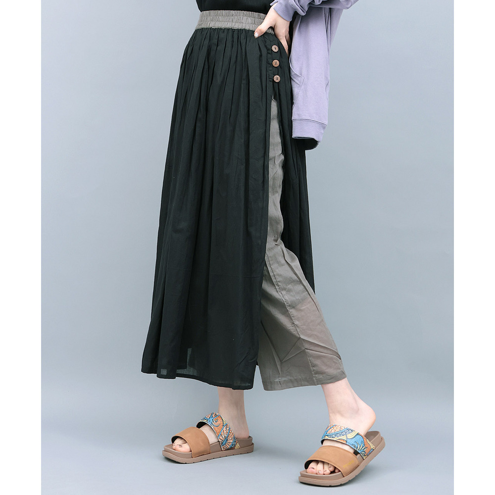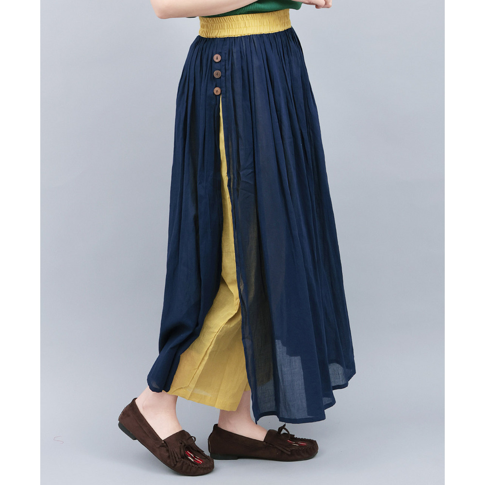 ゆったりとしたワイドパンツの上から、生地が重なったスカート見えする個性的なデザイン。