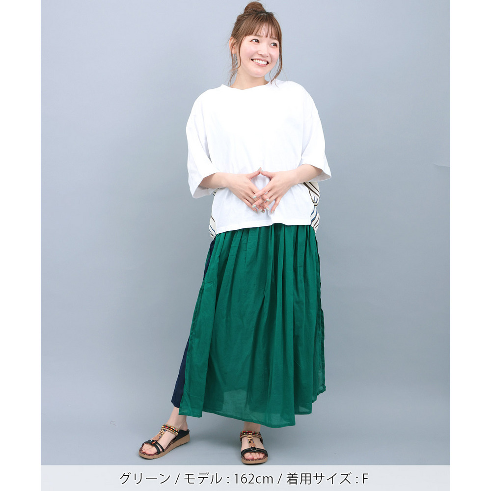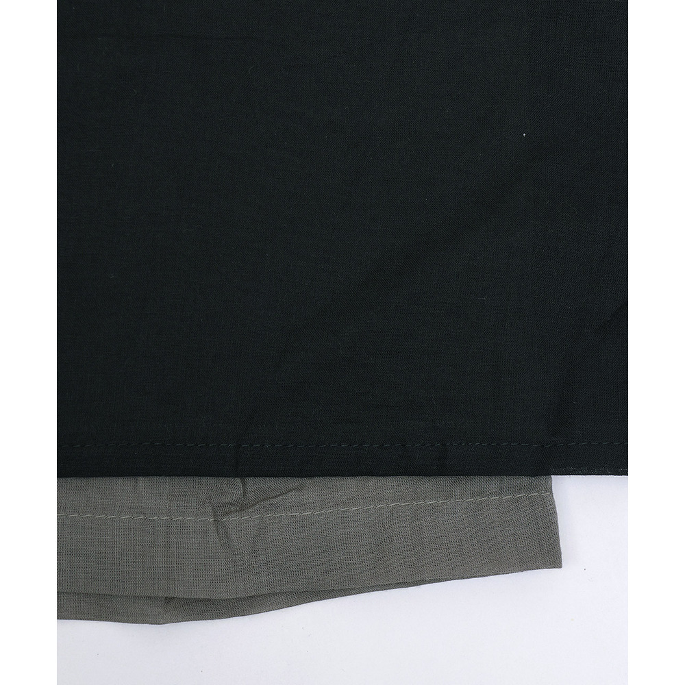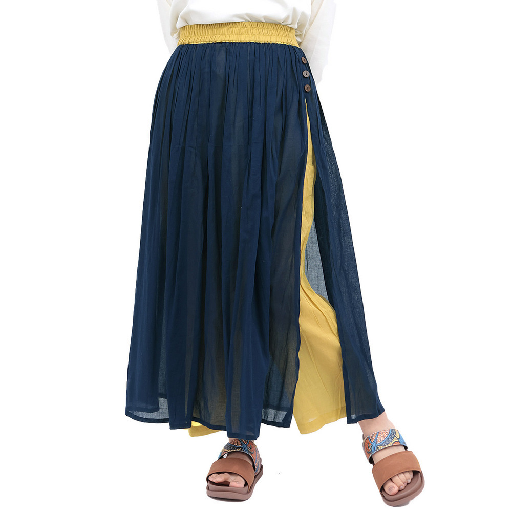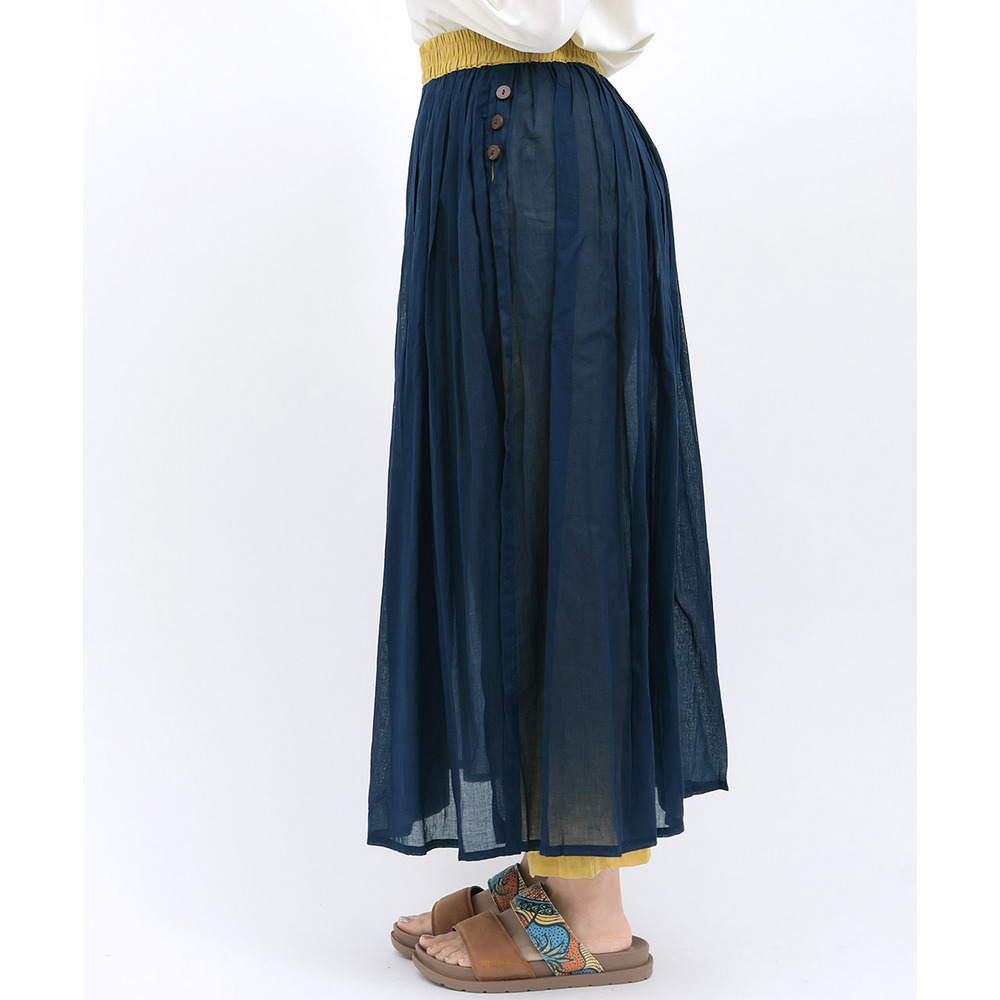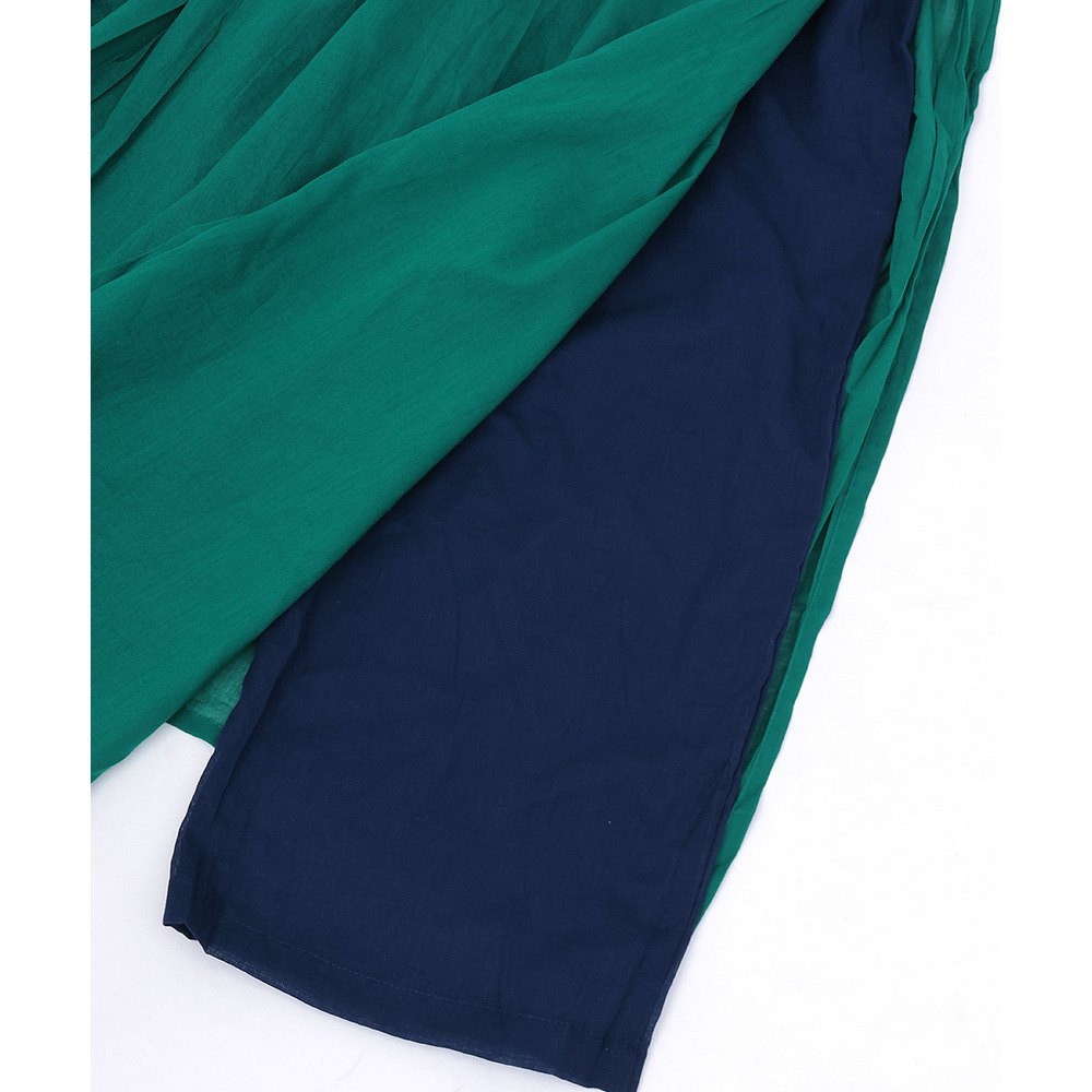 ゆったりとしたワイドパンツの上から、生地が重なったスカート見えする個性的なデザイン。