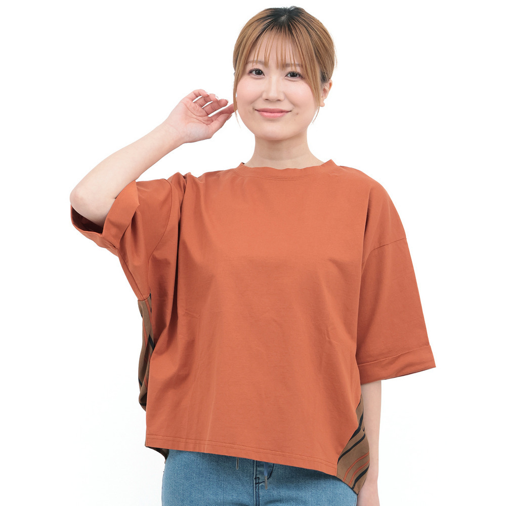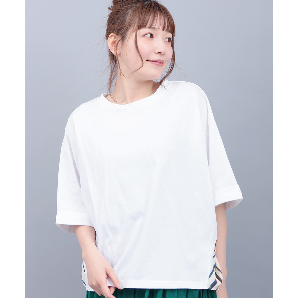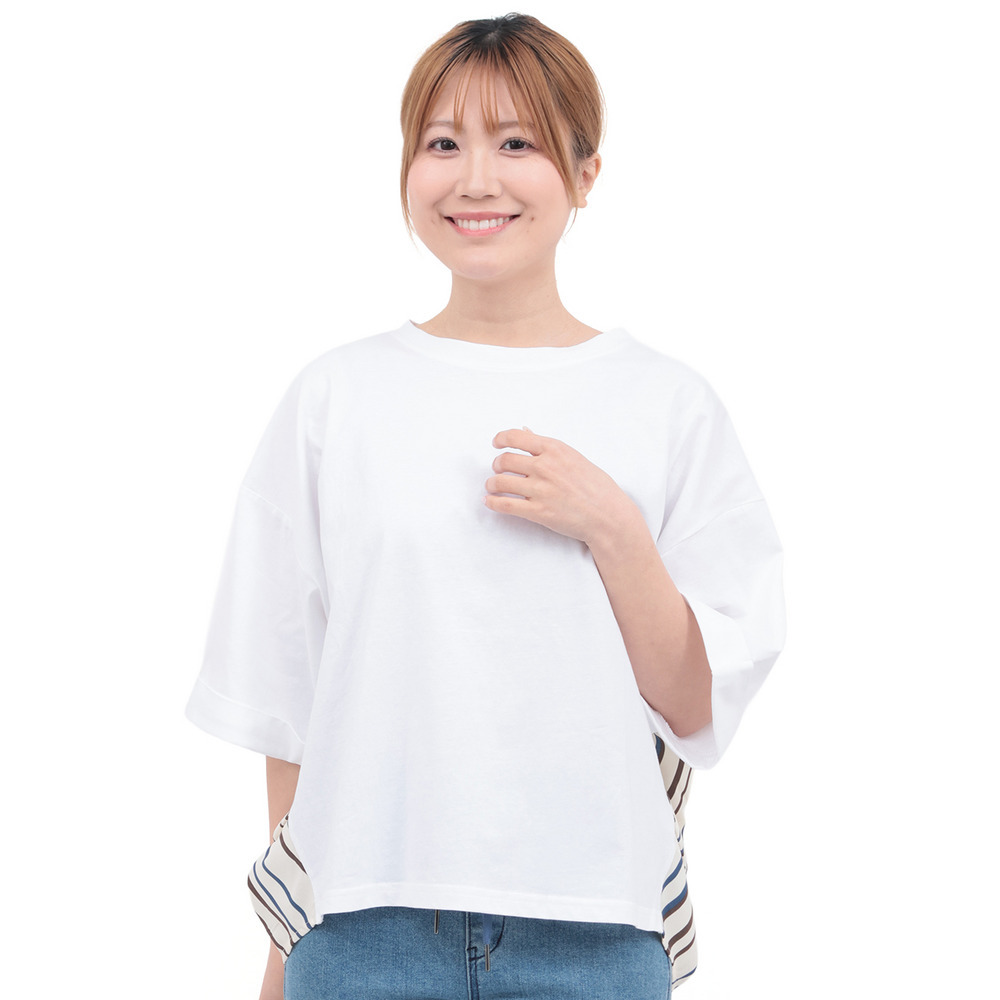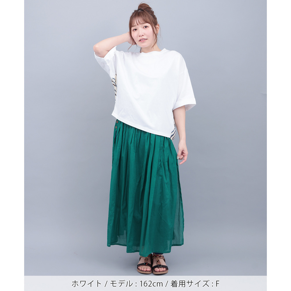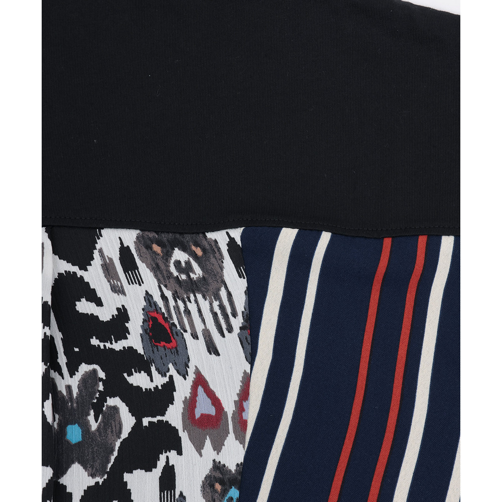 イカット柄部分は軽やかで、プリーツ調のエアリーな素材、ストライプ部分はさらっとした素材の組み合わせです。