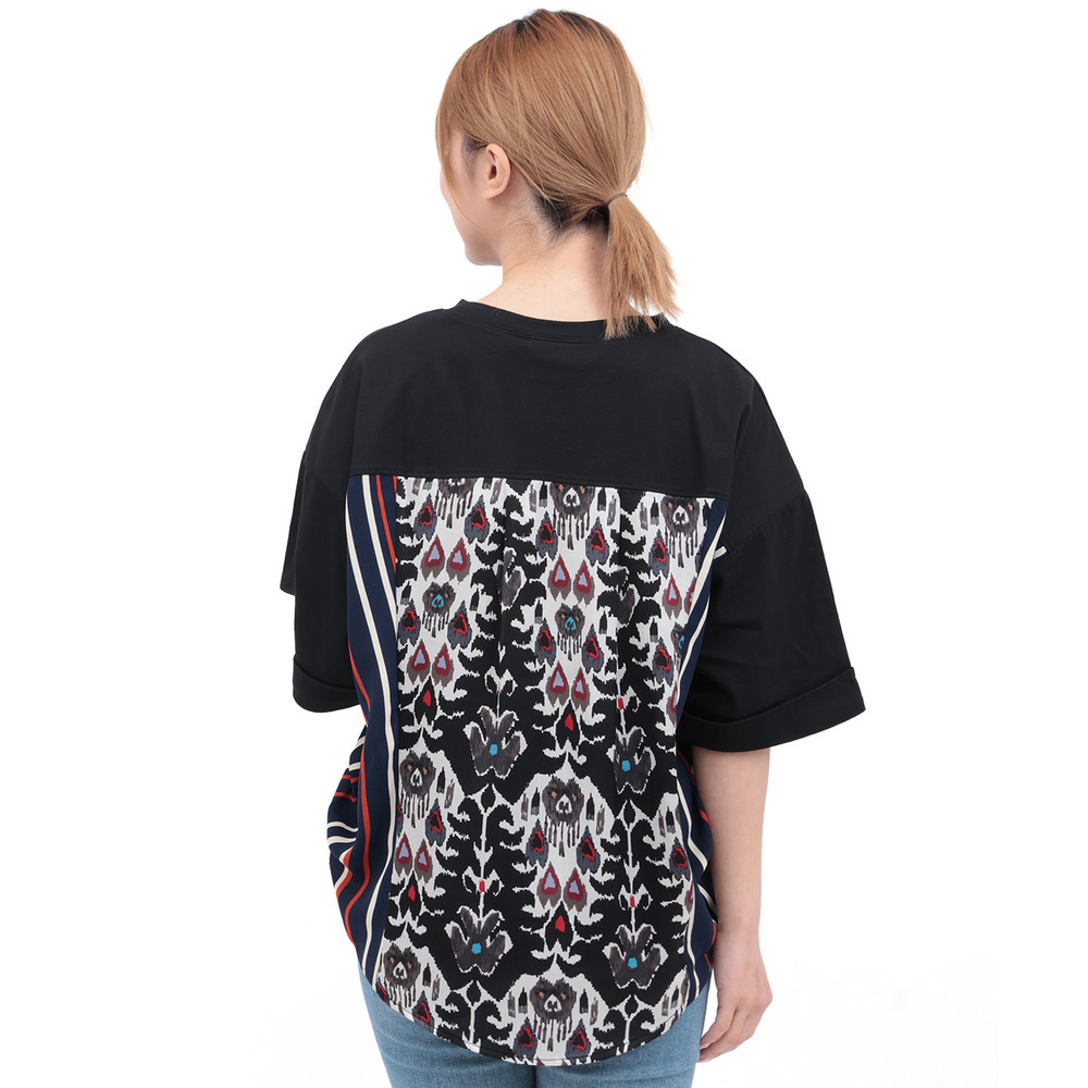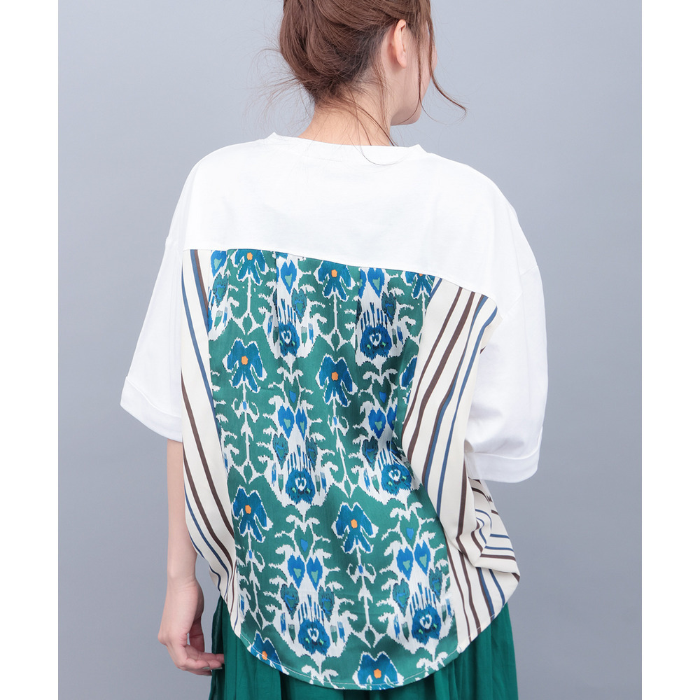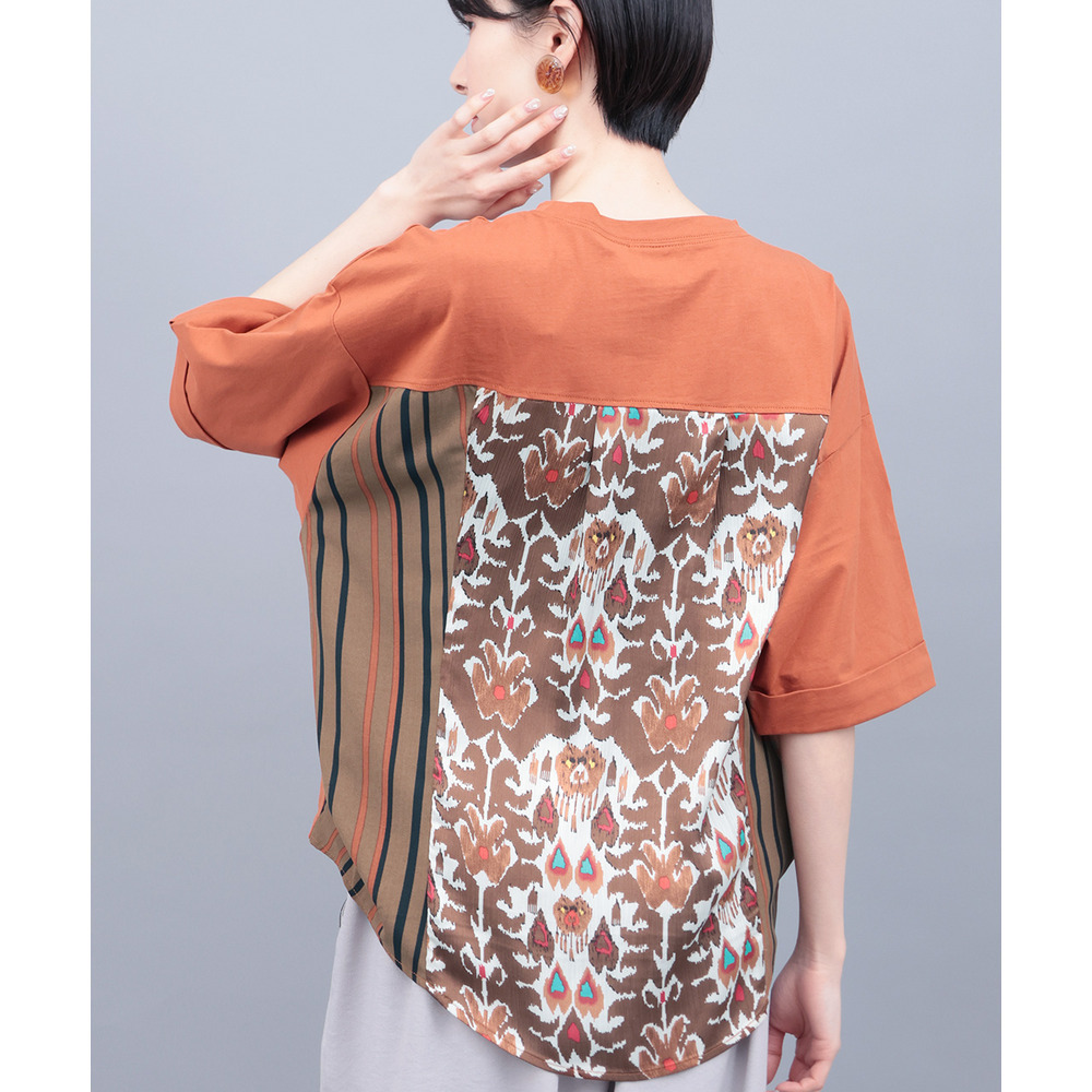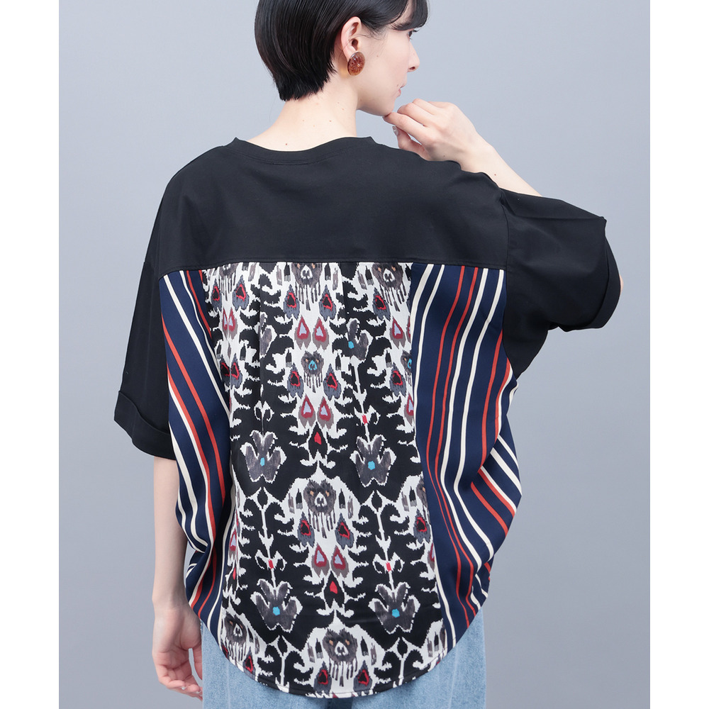 背中に大胆なエスニック柄をあしらった、存在感たっぷりの異素材コンビトップス。