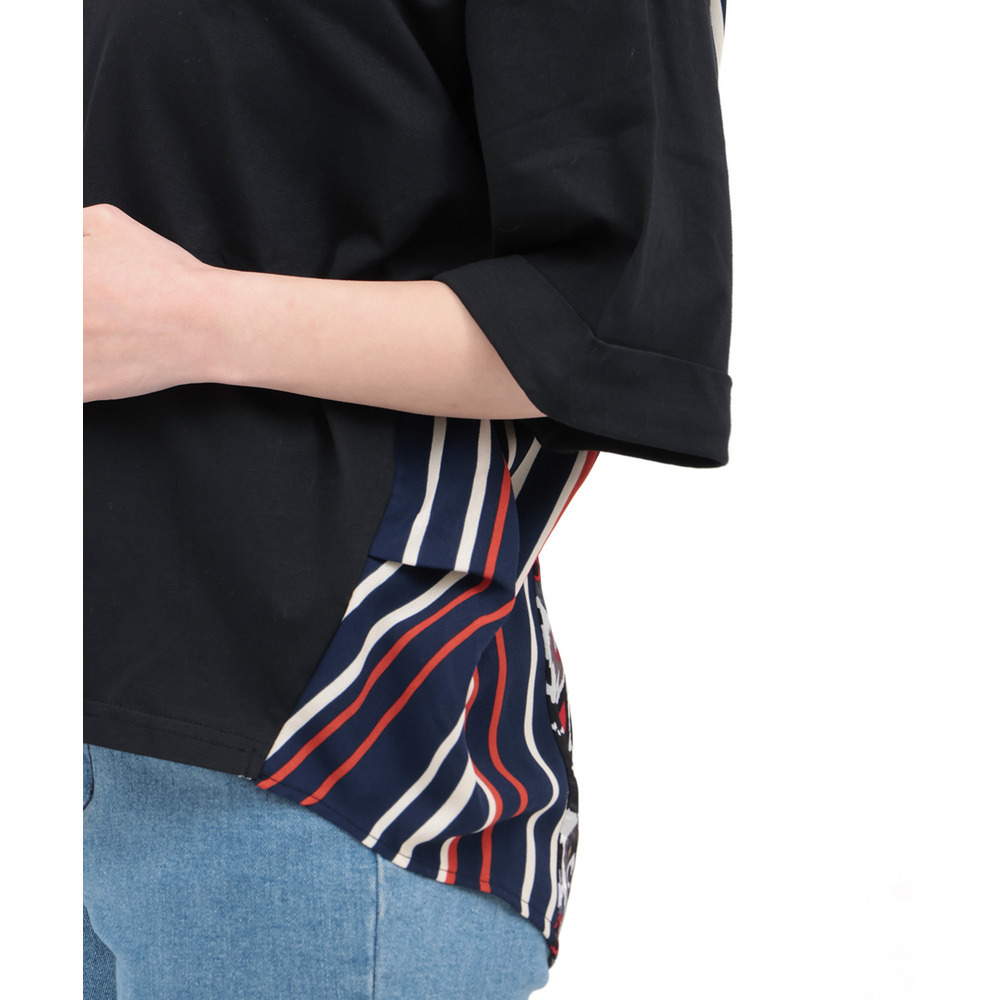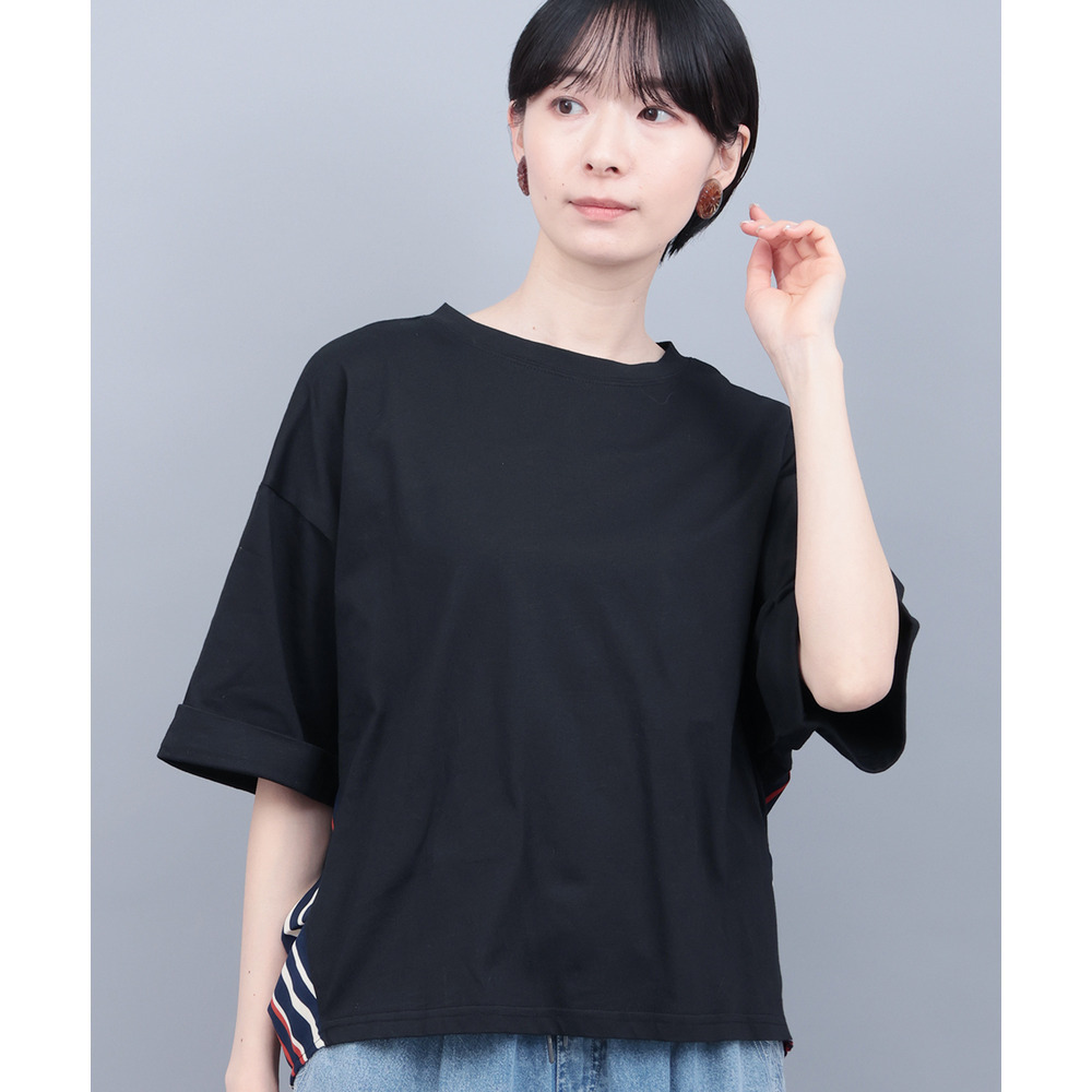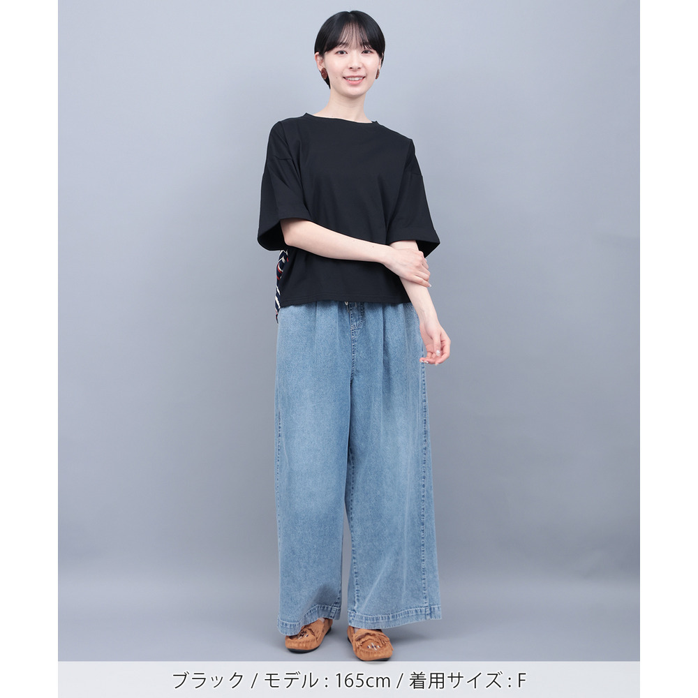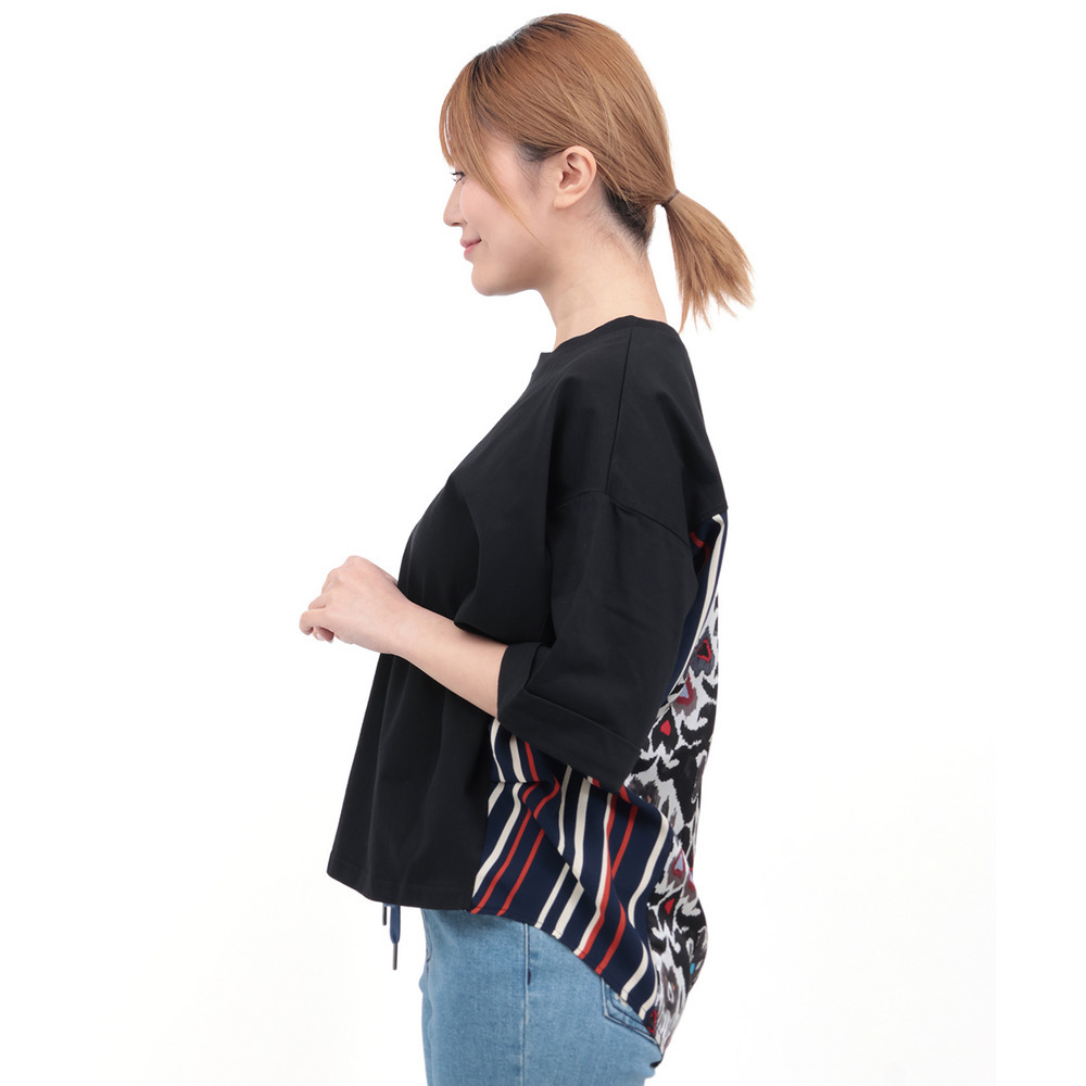 背中に大胆なエスニック柄をあしらった、存在感たっぷりの異素材コンビトップス。
