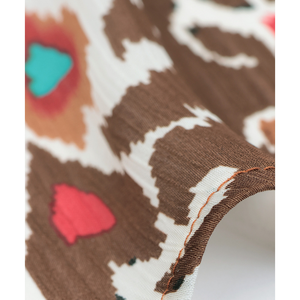 背中からサイドにかけて入ったイカット調の柄が、エスニックムードをぐっと高めます。