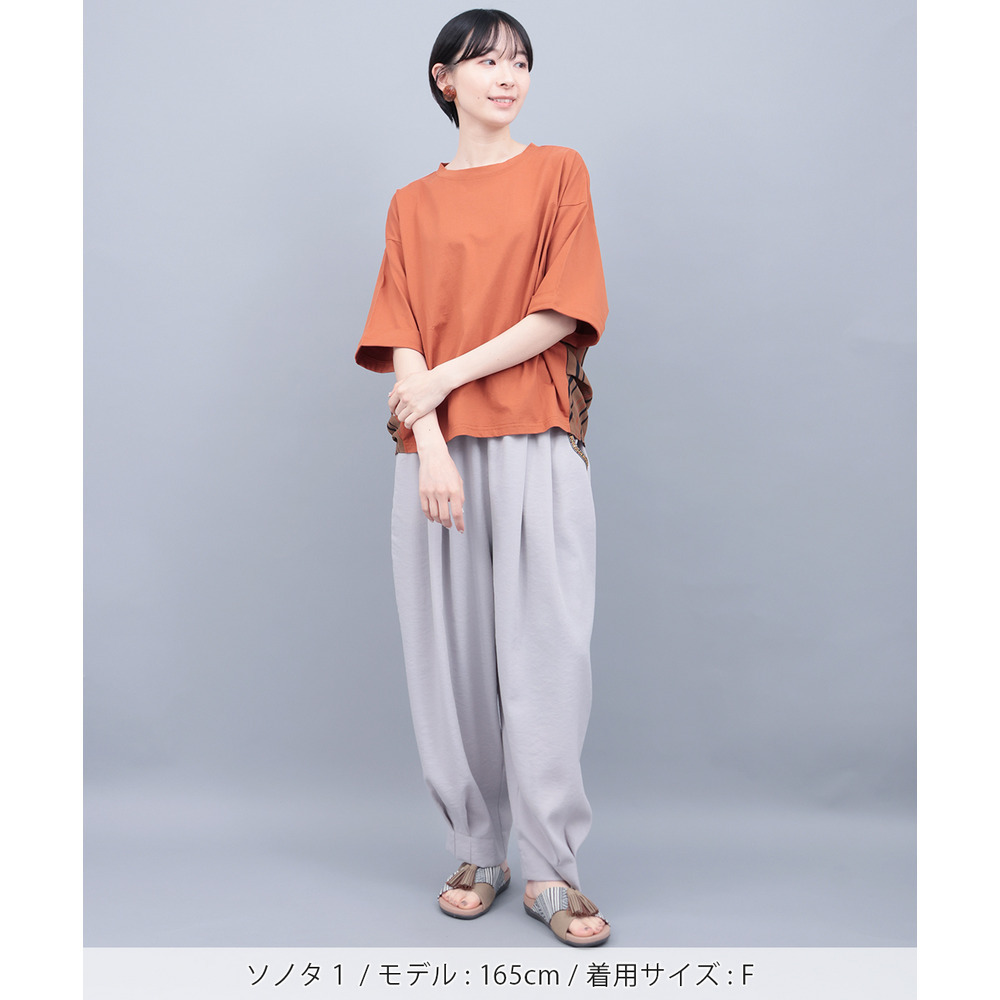 フロントがシンプルなので、柄ボトムスと合わせても程よくまとまり、こなれ感のある着こなしに。