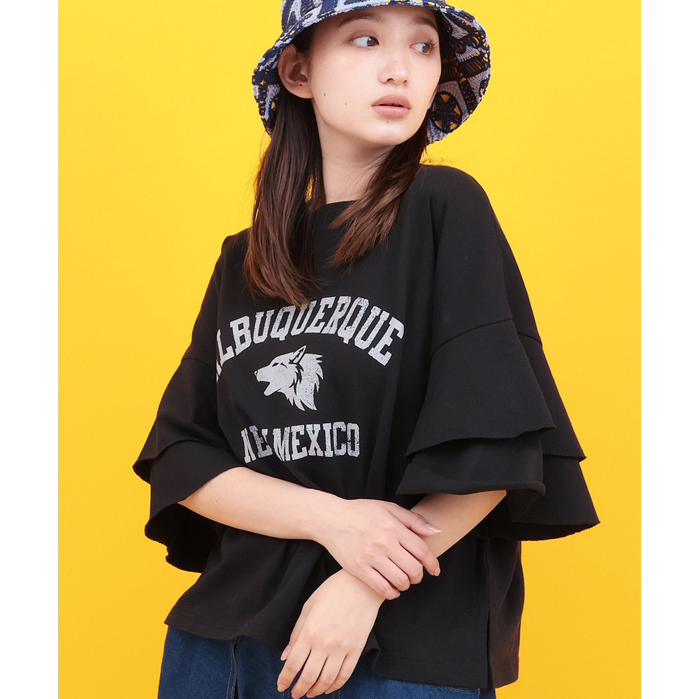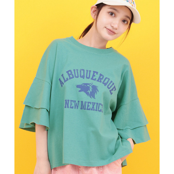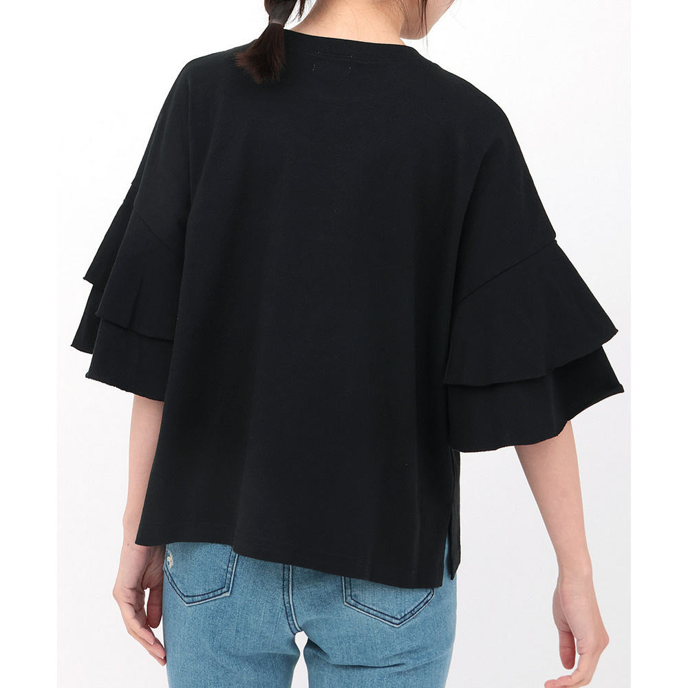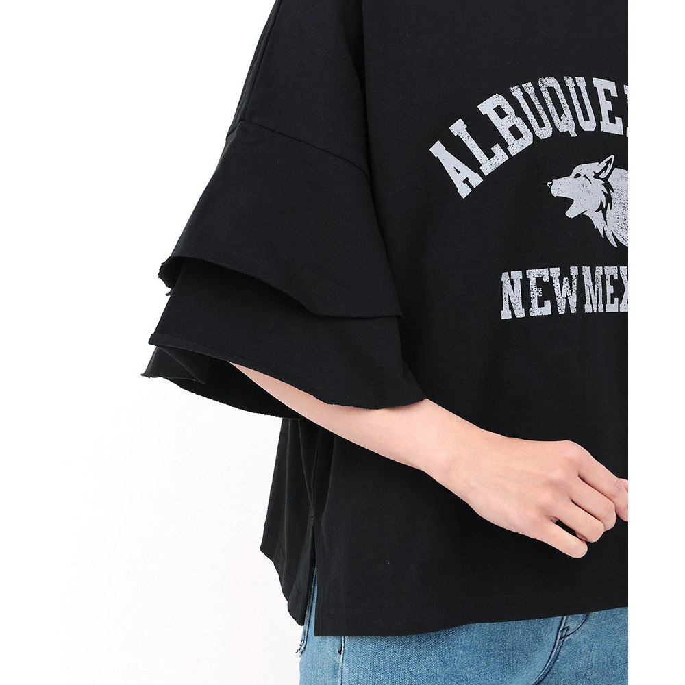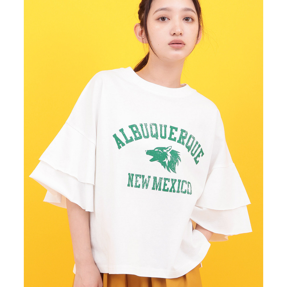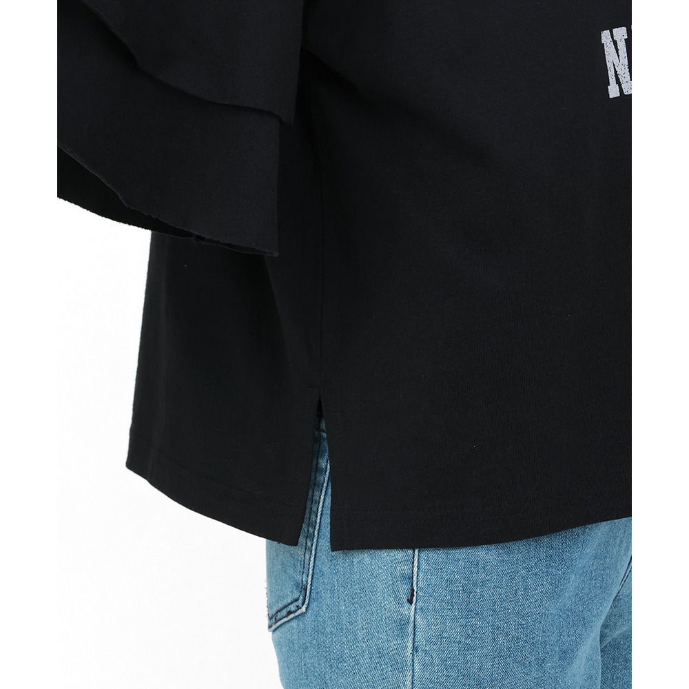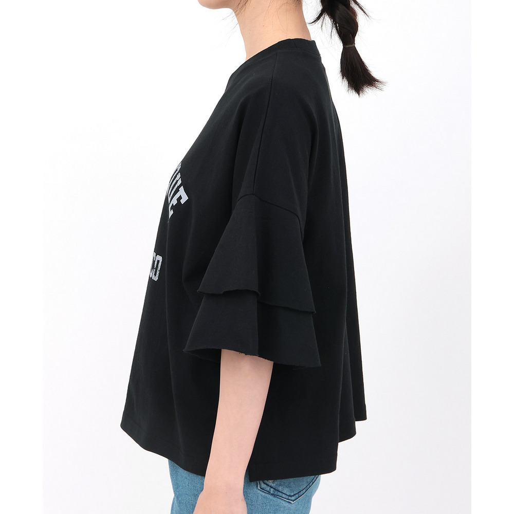 ふんわりとボリュームのある袖ラッフルがポイントのロゴTシャツ。