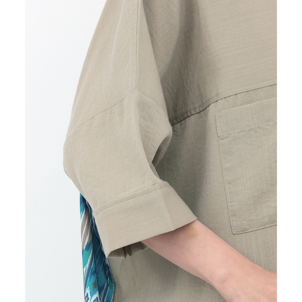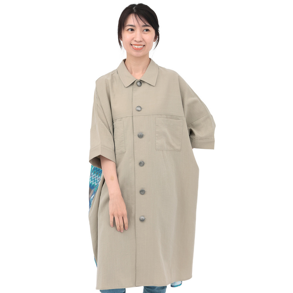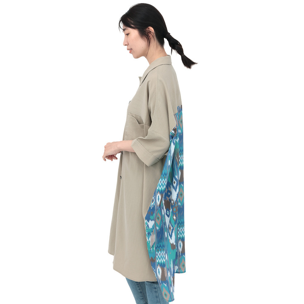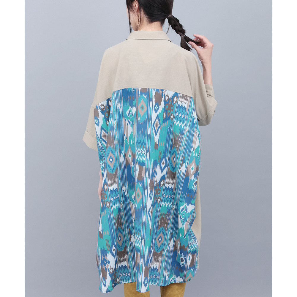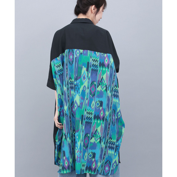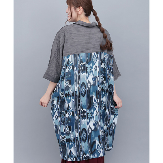 ゆったりとしたシャツワンピースに、イカット柄の切り替えをプラスしたドッキングデザイン。