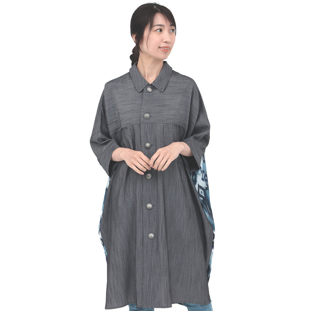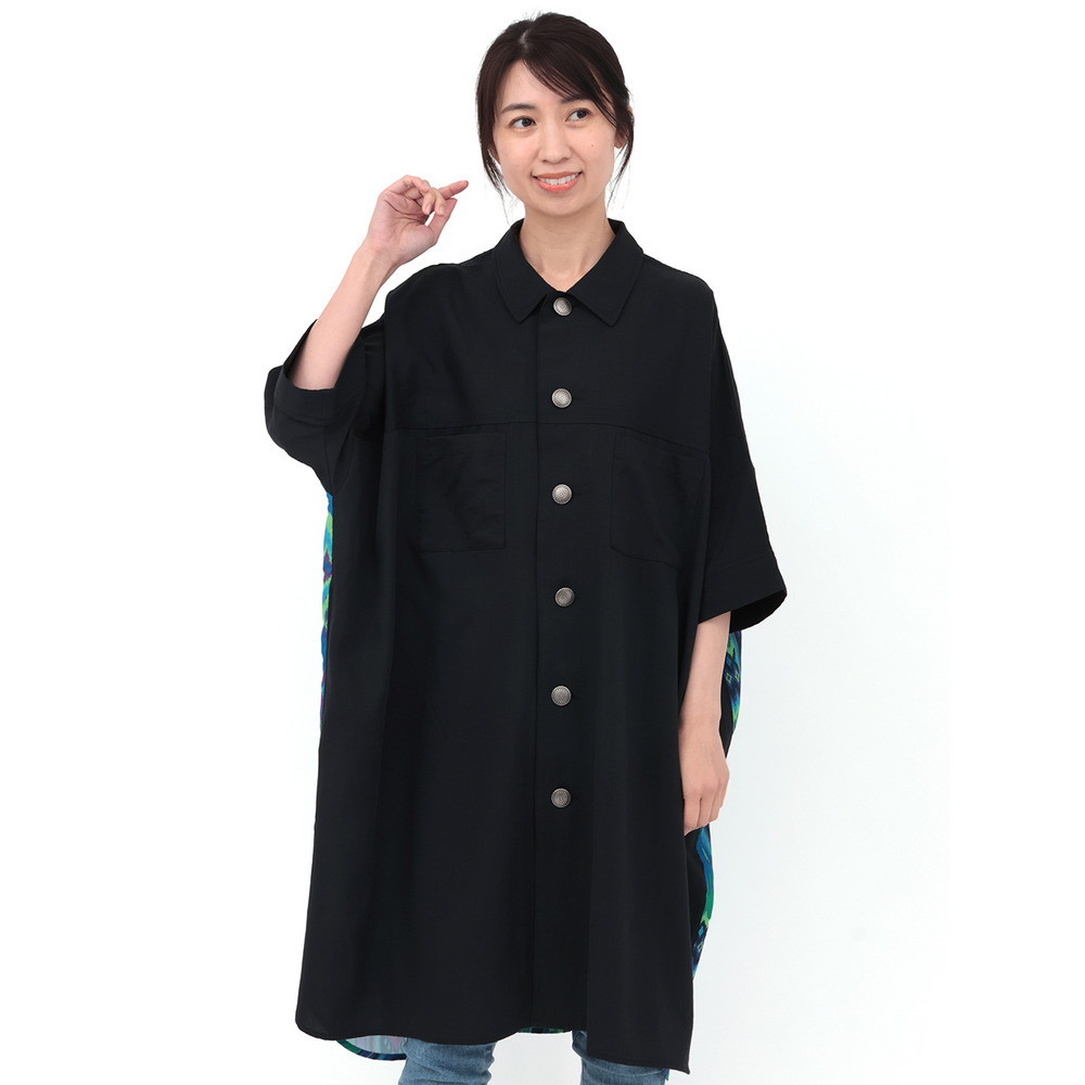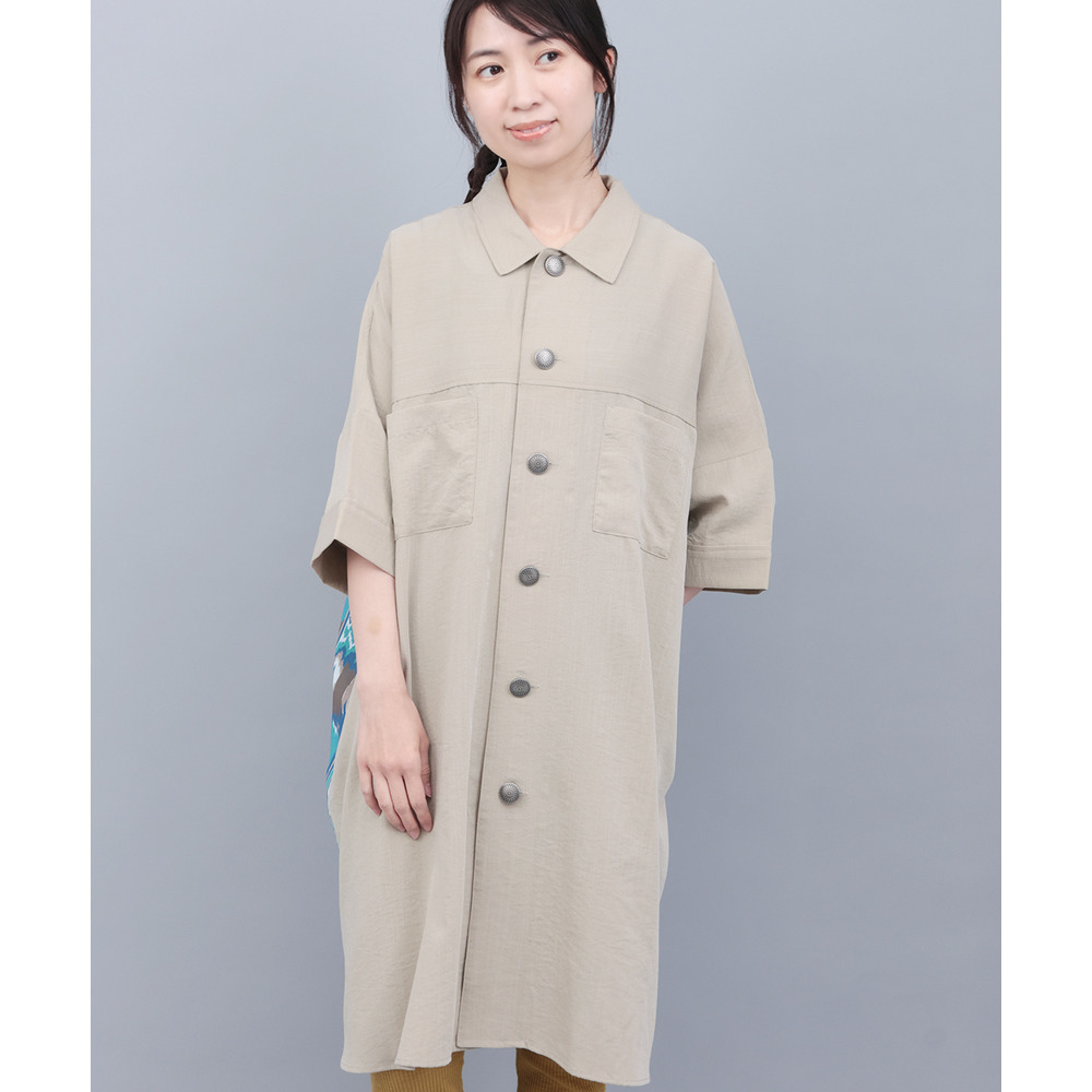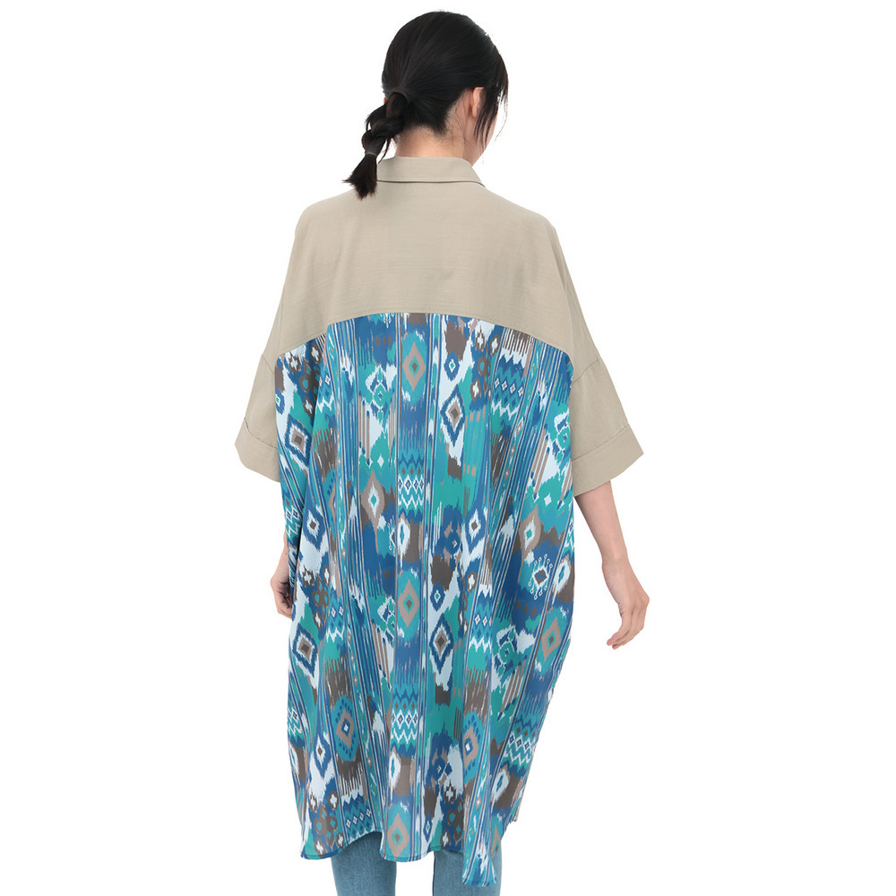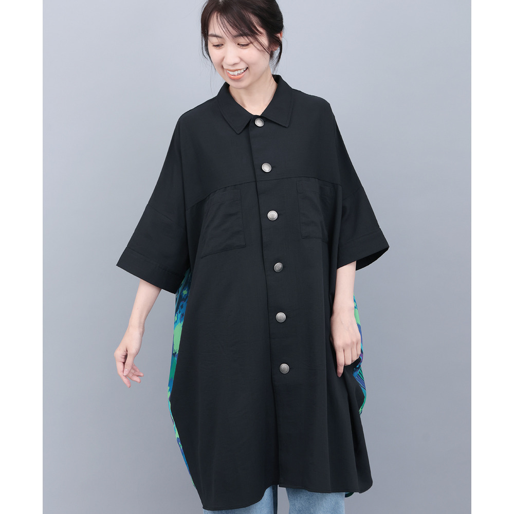 ゆったりとしたシャツワンピースに、イカット柄の切り替えをプラスしたドッキングデザイン。