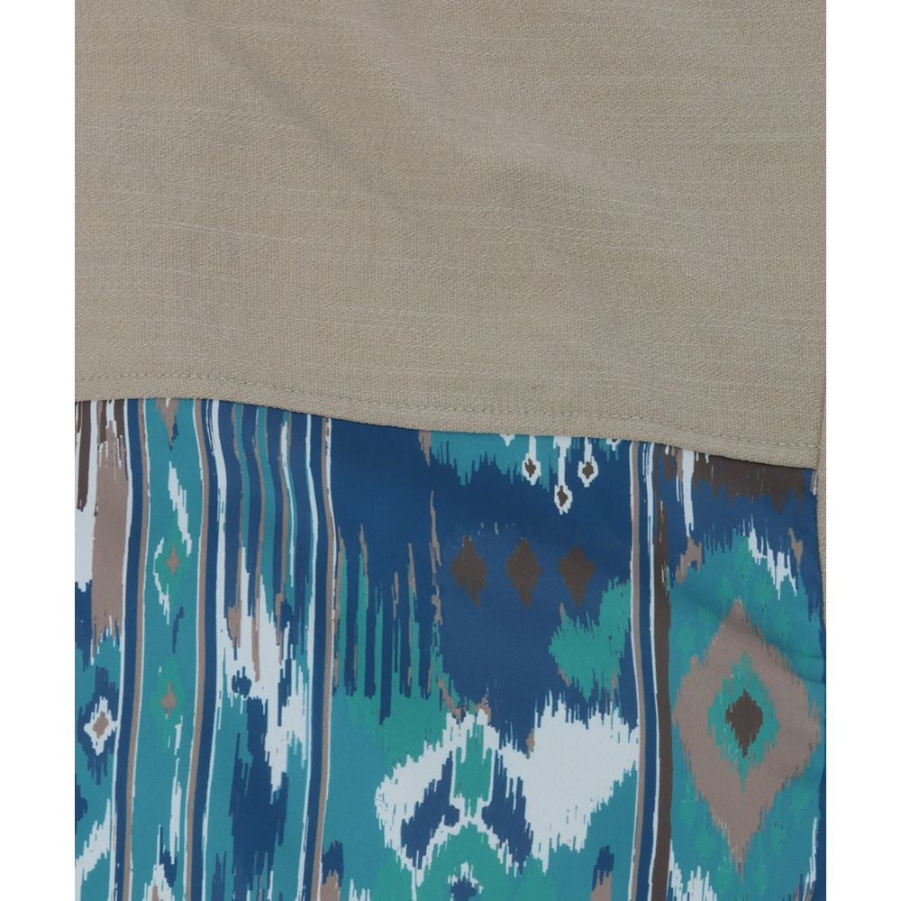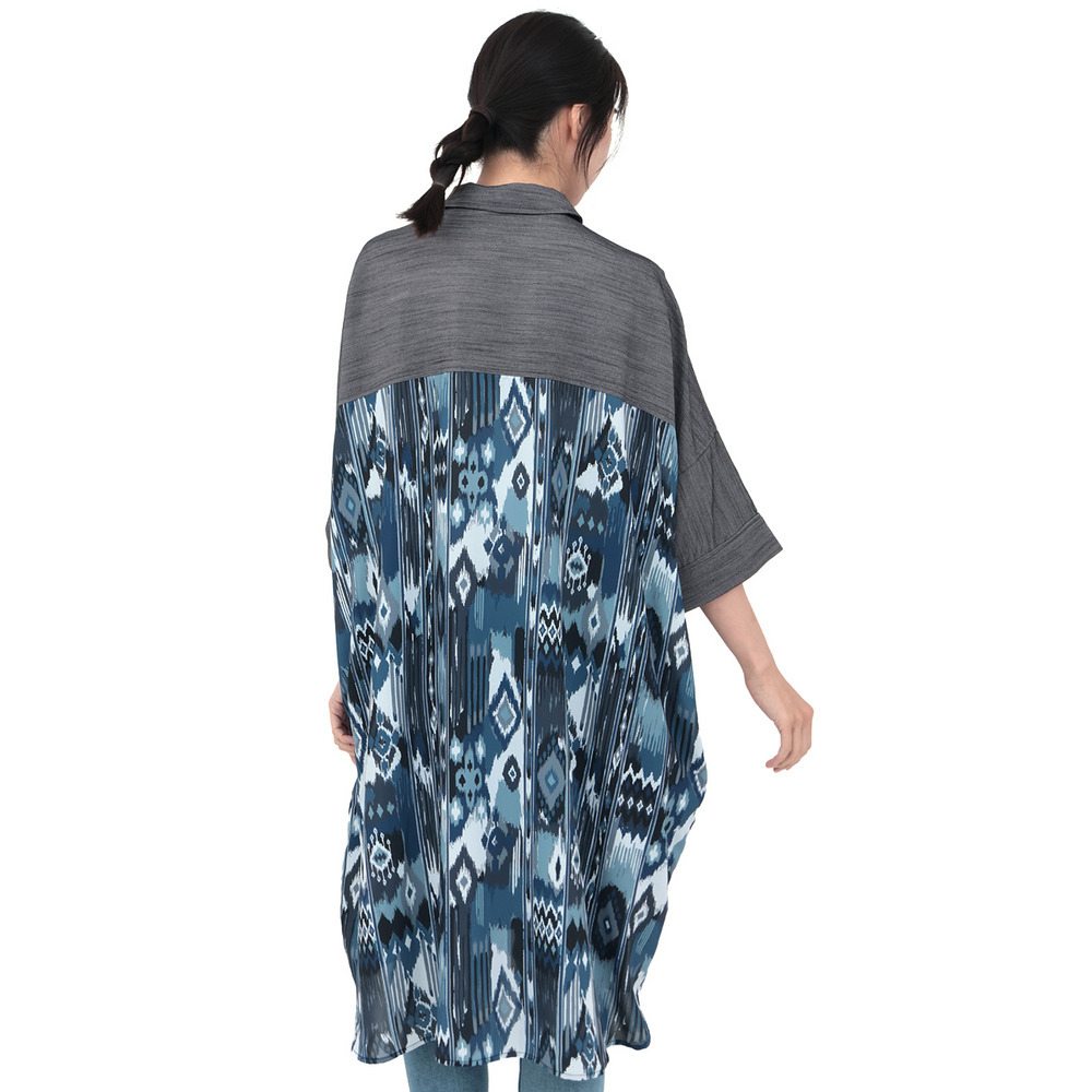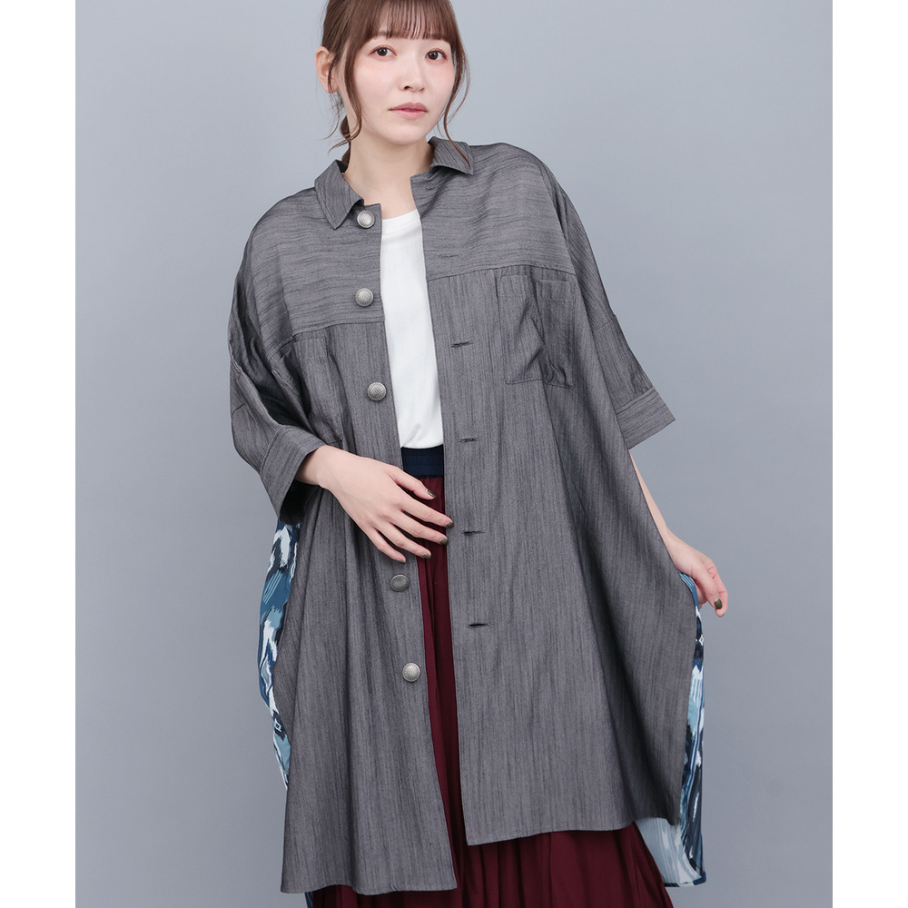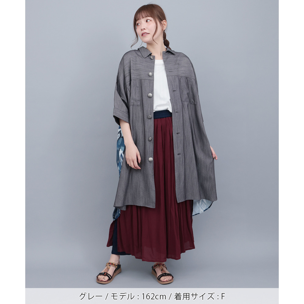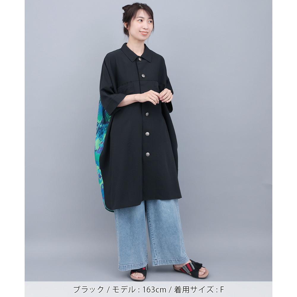 ゆったりとしたシャツワンピースに、イカット柄の切り替えをプラスしたドッキングデザイン。