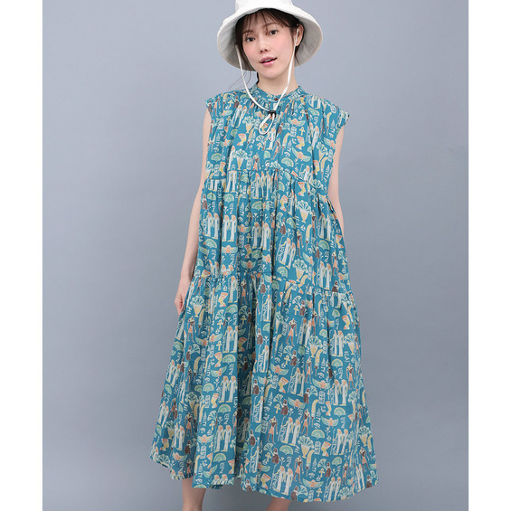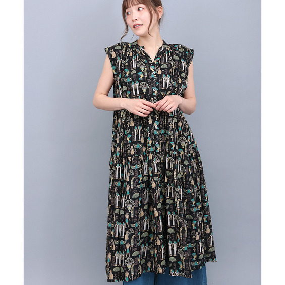 エジプトモチーフの柄が目を引く、涼しげなシャツワンピース。
