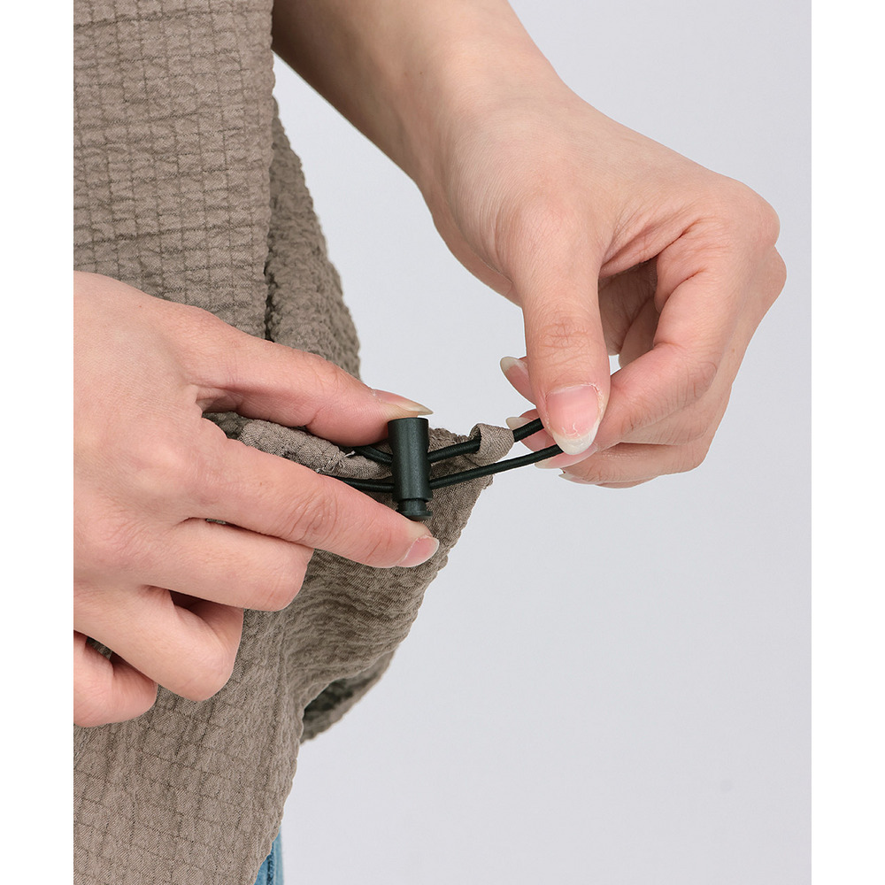 フロントはボタン仕様で着脱しやすく、裾のドローストリングでシルエットの調整も可能です。