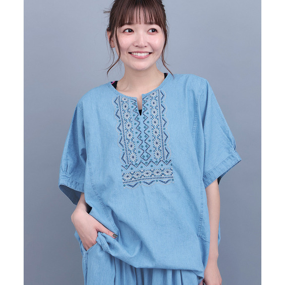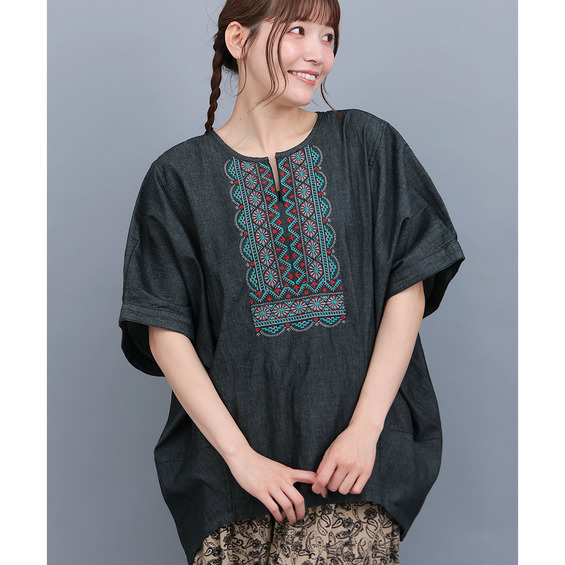 前立て部分にたっぷりと施した刺繍が目を惹くデニムトップス。