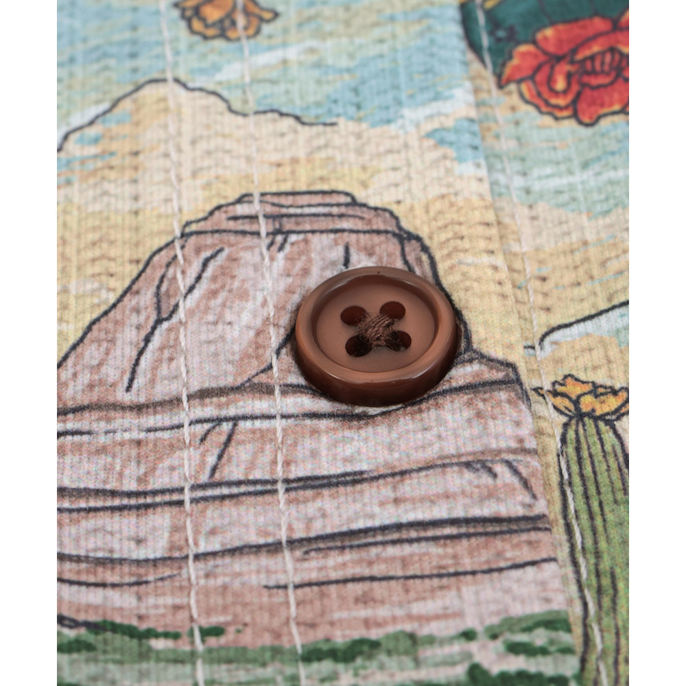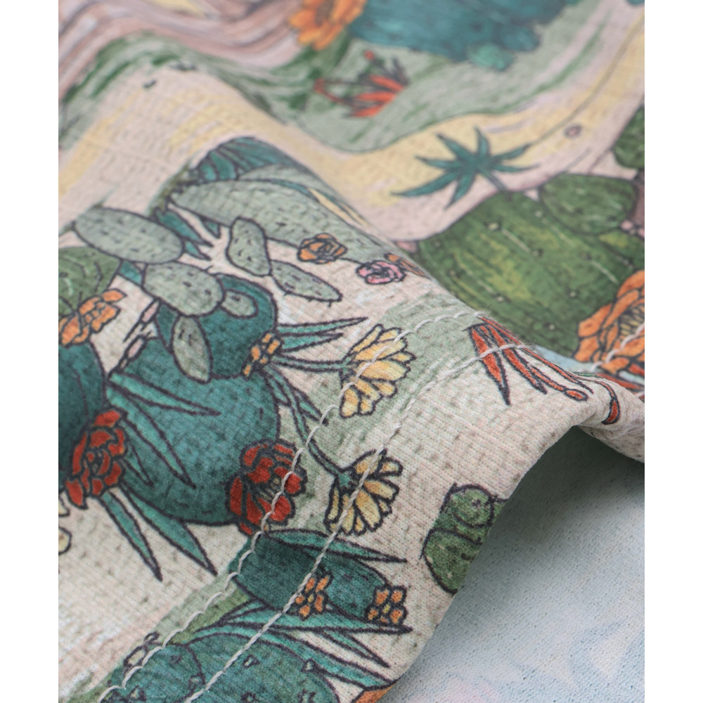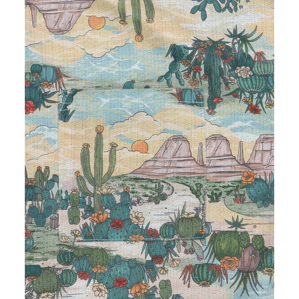 アースカラーでまとめた、落ち着きのあるサボテン柄は山や自然の風景を一緒に描いたデザインで、どこかノスタルジックな雰囲気が魅力です。