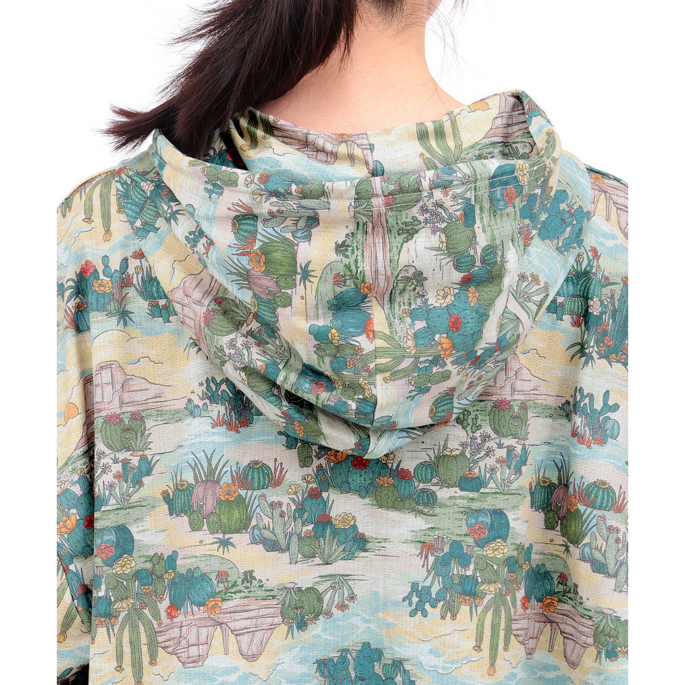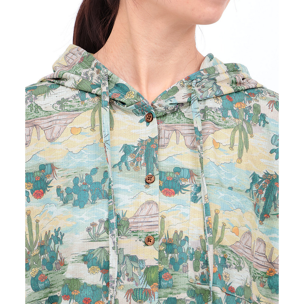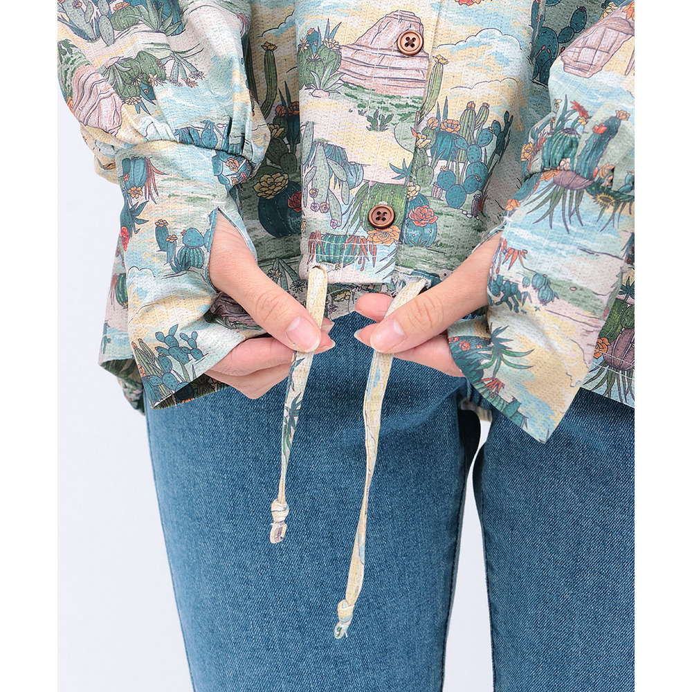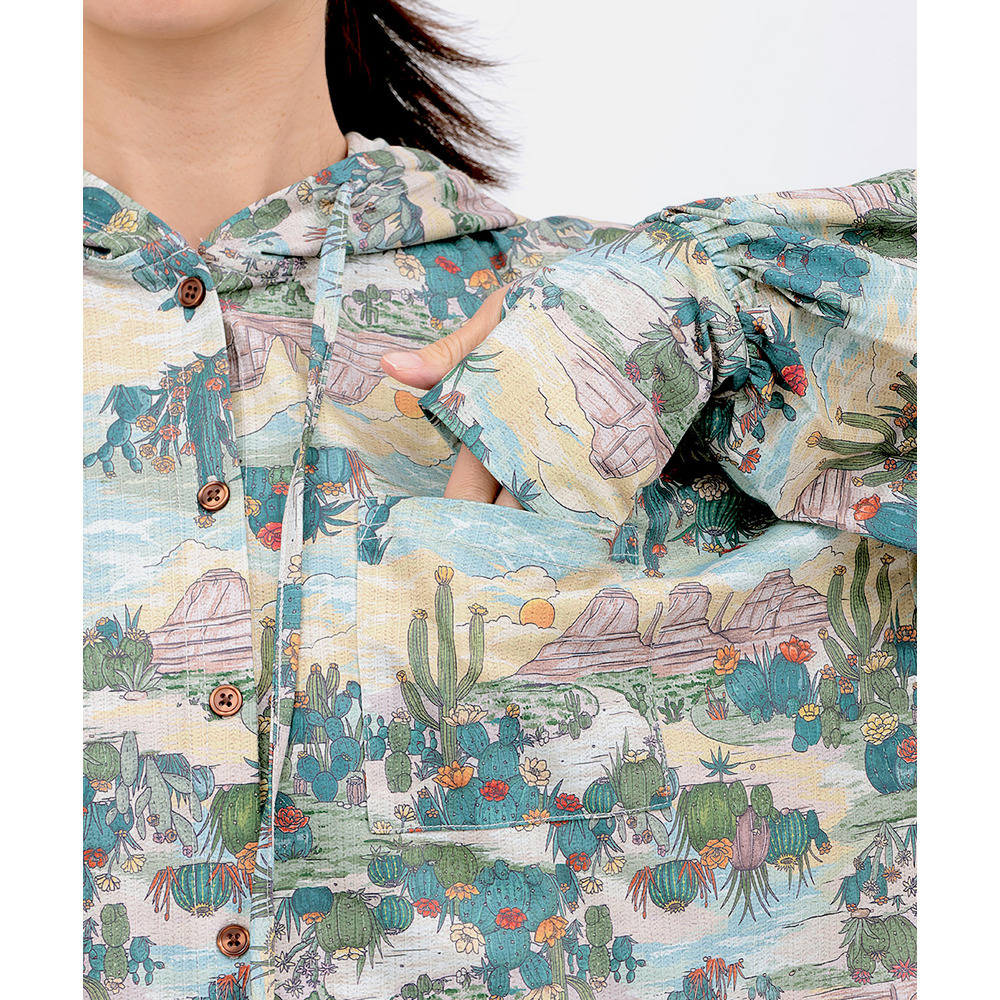 アースカラーでまとめた、落ち着きのあるサボテン柄は山や自然の風景を一緒に描いたデザインで、どこかノスタルジックな雰囲気が魅力です。