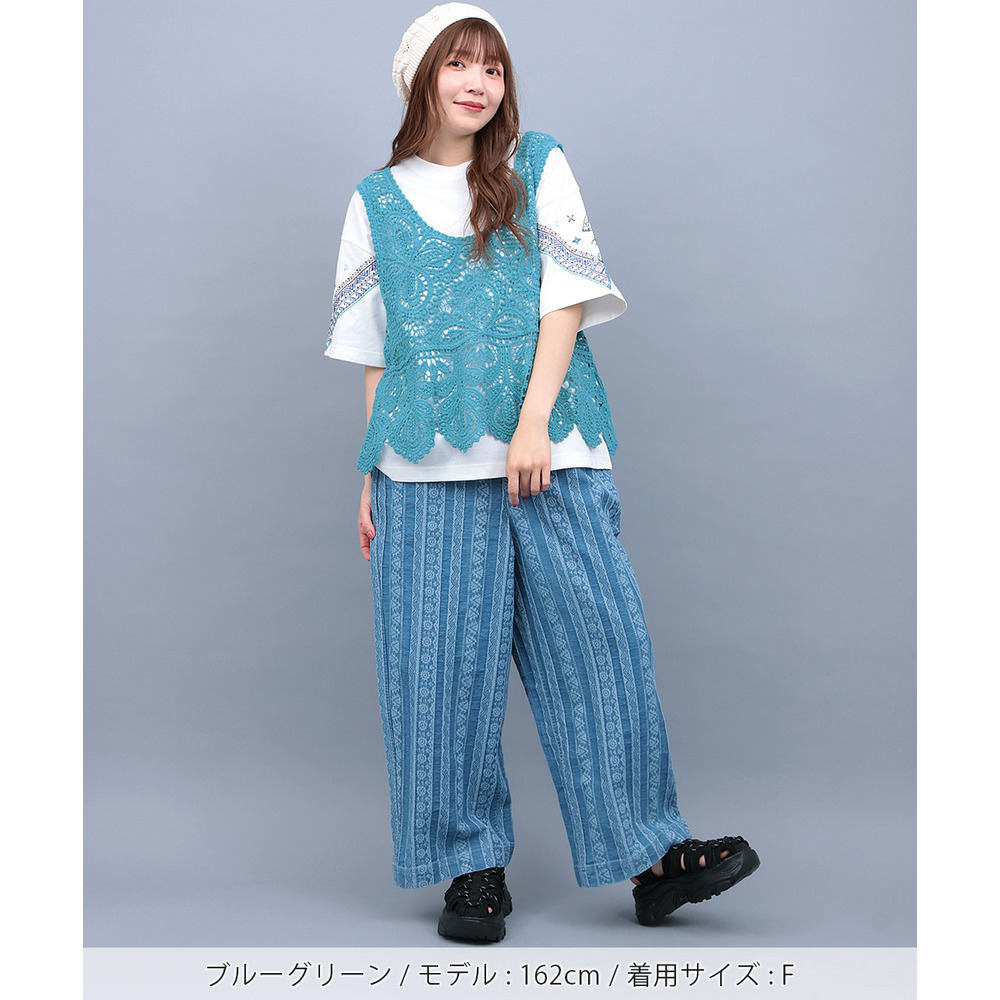 エスニックな編み柄は甘すぎず、Tシャツなどに重ねてカジュアルに着こなせます。