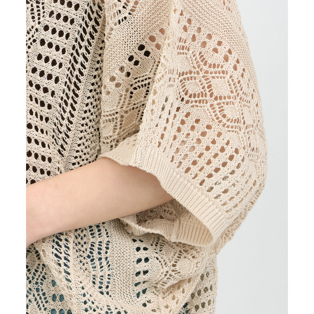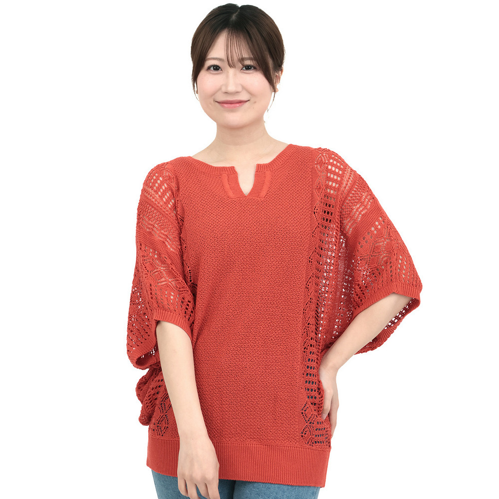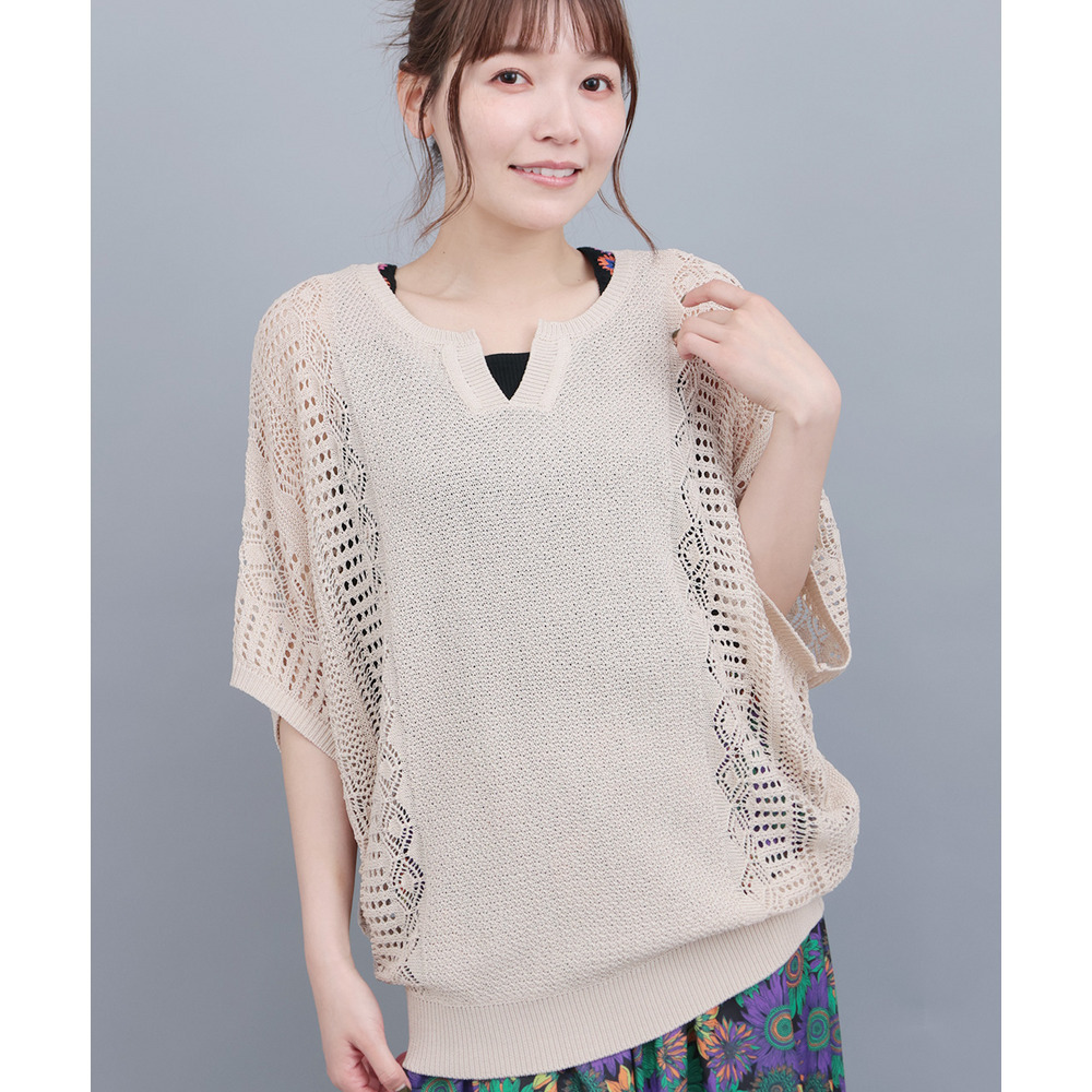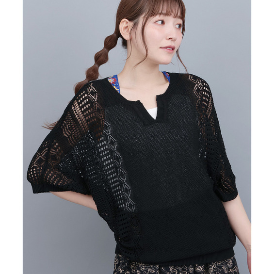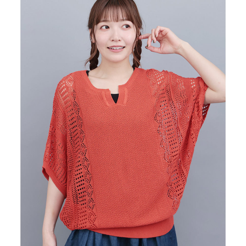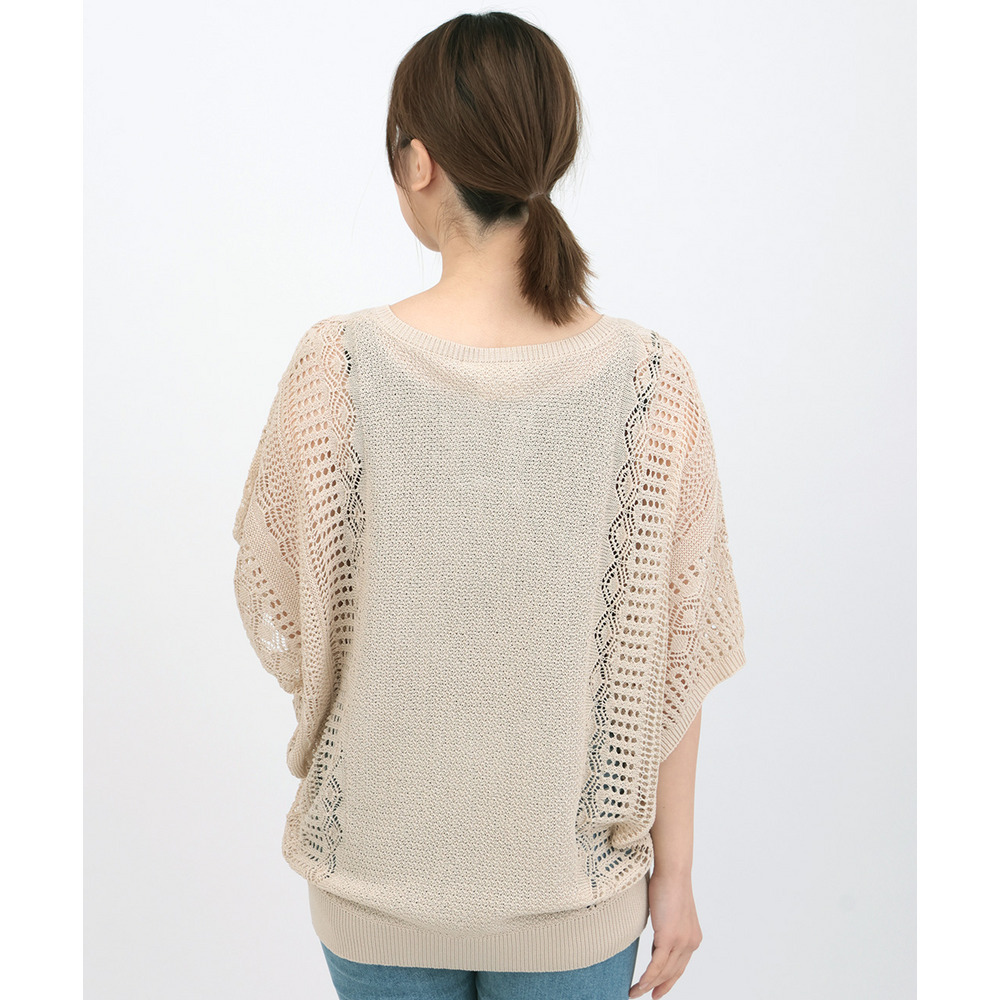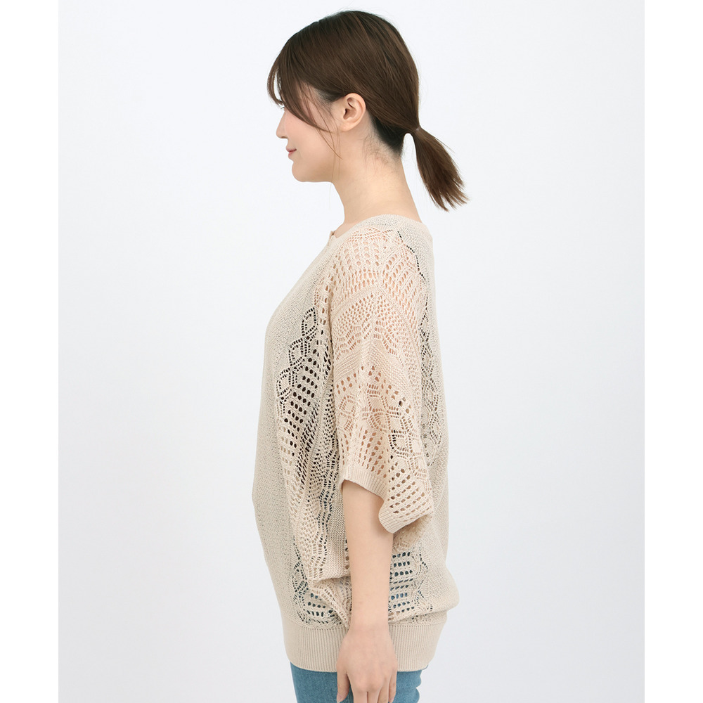大人っぽい透け感が楽しめる、透かし編みドルマンニット。