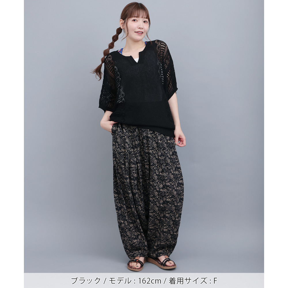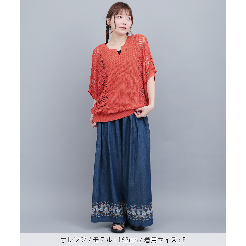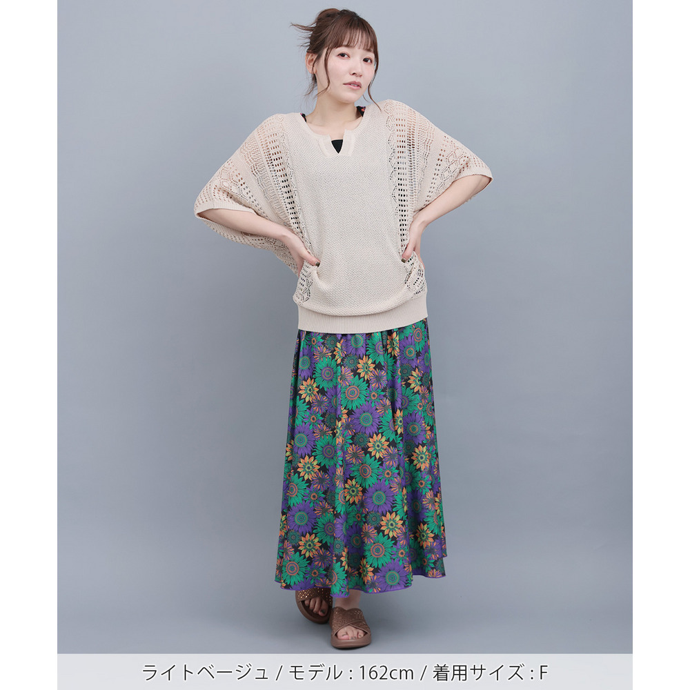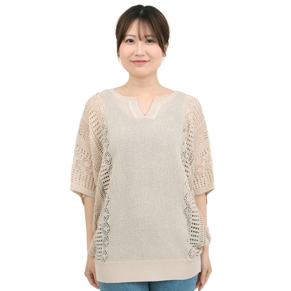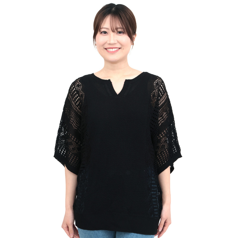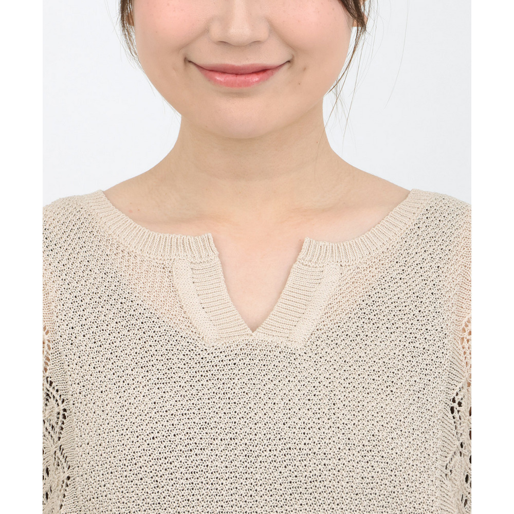 大人っぽい透け感が楽しめる、透かし編みドルマンニット。