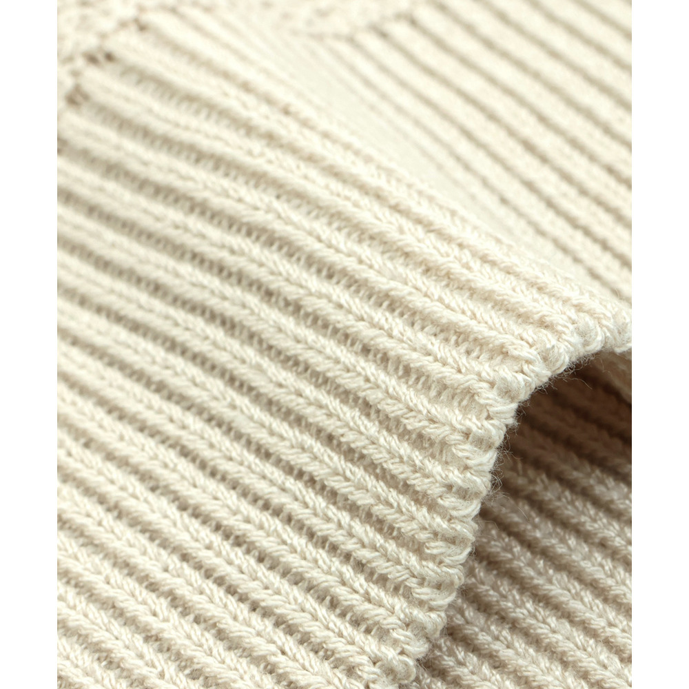 ゆるっとしたドルマンスリーブが二の腕をカバーしつつ、縦ラインの編地でバランスよく着こなせる一枚です。