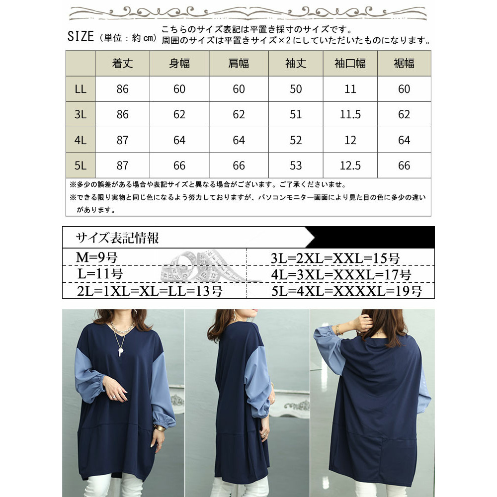 サイズ表記 LL 3L 4L 5L 着丈 86cm 86cm 87cm 87cm 身幅 60cm 62cm 64cm 66cm 肩幅 60cm 62cm 64cm 66cm 袖丈 50cm 51cm 52cm 53cm 袖口幅 11cm 11.5cm 12cm 12.5cm 裾幅 60cm 62cm 64cm 66cm