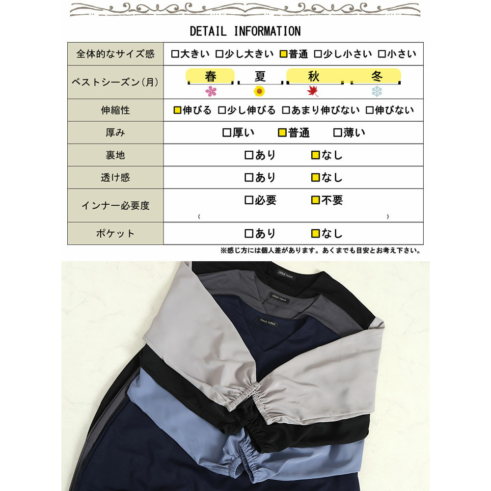 | 素材 | 【布帛】ポリエステル100%【カットソー】ポリエステル95% ポリウレタン5% |