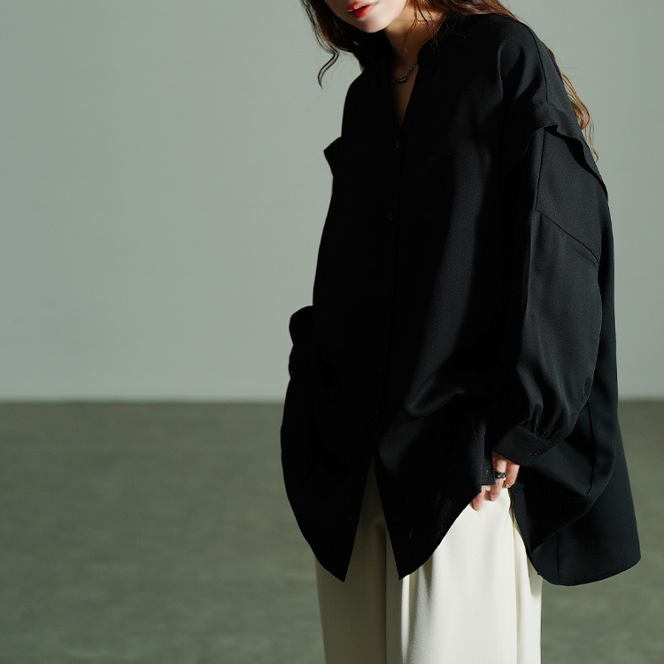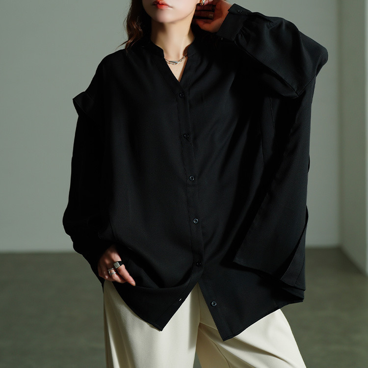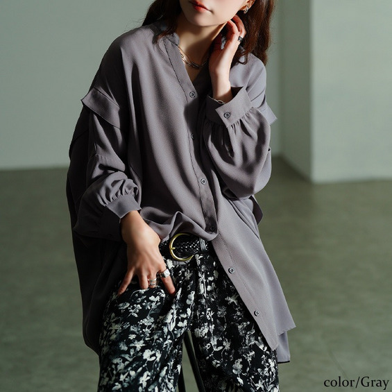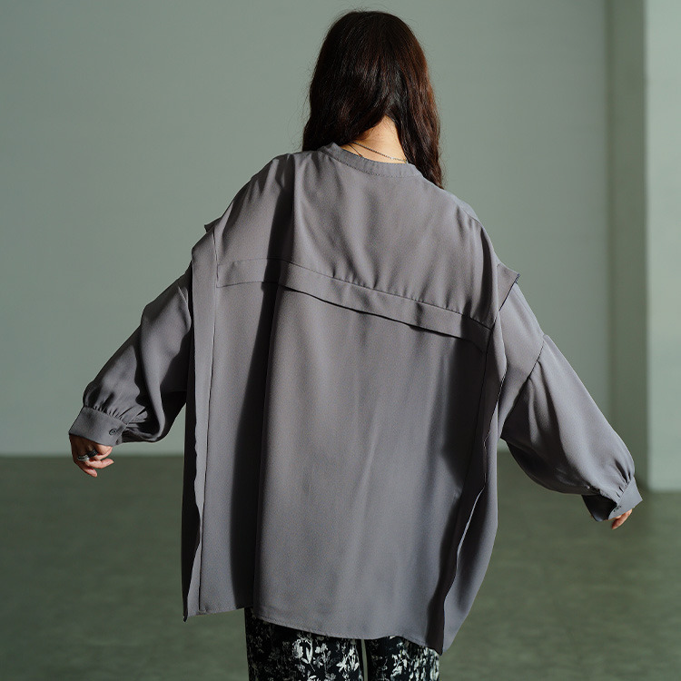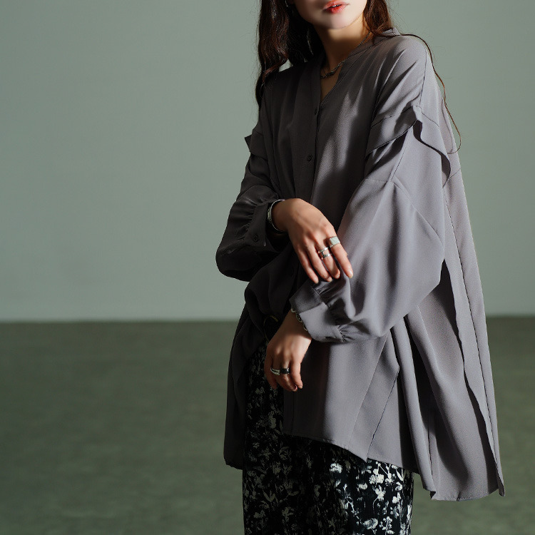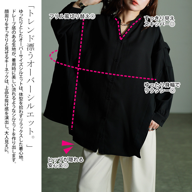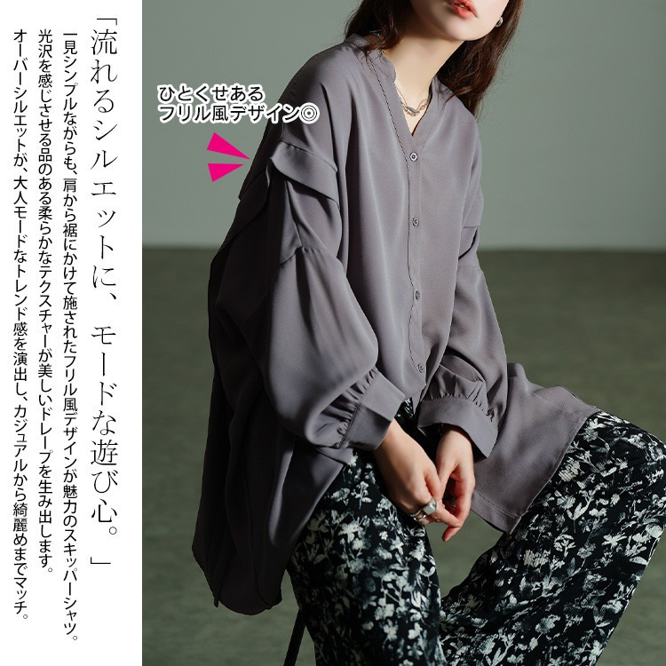 一見シンプルながらも、肩から裾にかけて施されたフリル風デザインが魅力のスキッパーシャツ。光沢を感じさせる品のある柔らかなテクスチャーが美しいドレープを生み出します。オーバーシルエットが、大人モードなトレンド感を演出し、カジュアルから綺麗めまでマッチ。