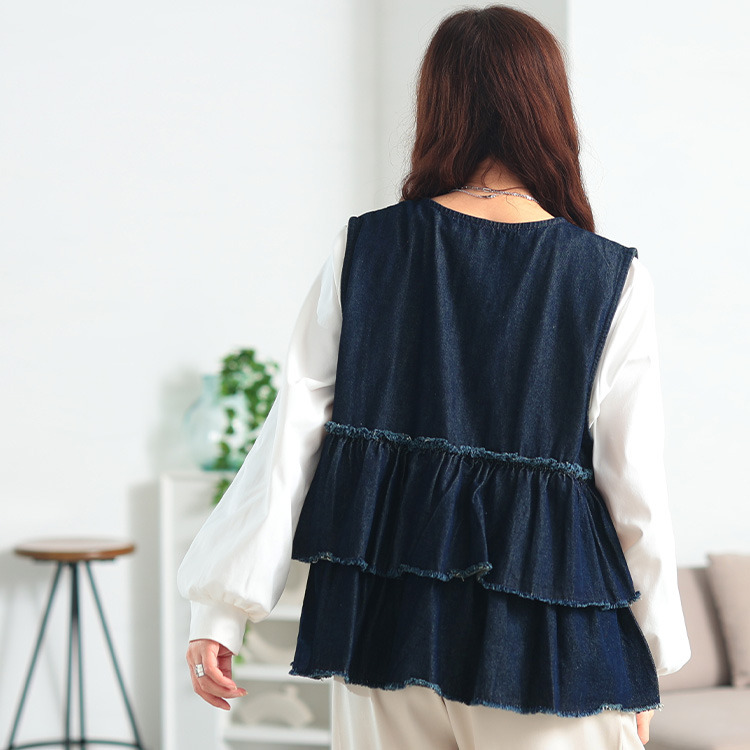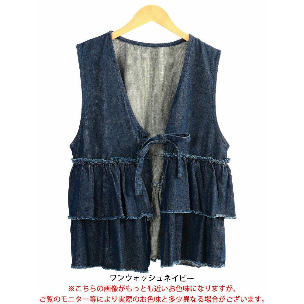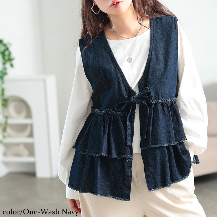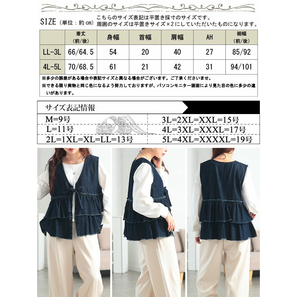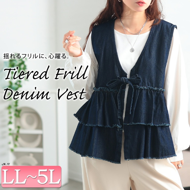 大きいサイズ レディース コットンデニムリボンティアードベスト