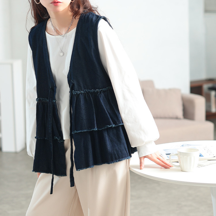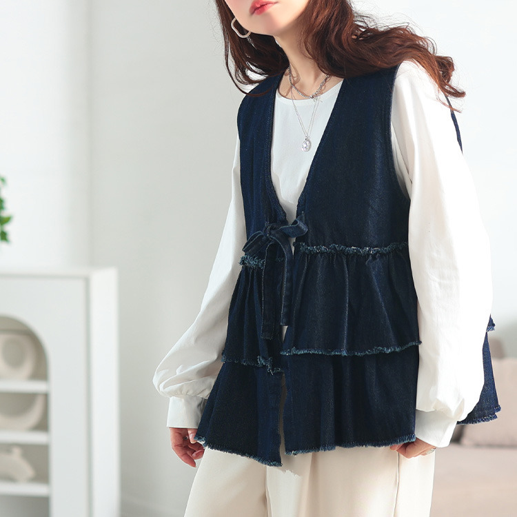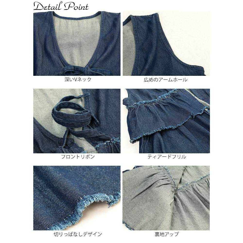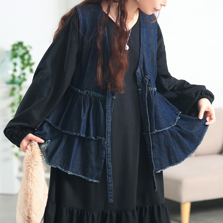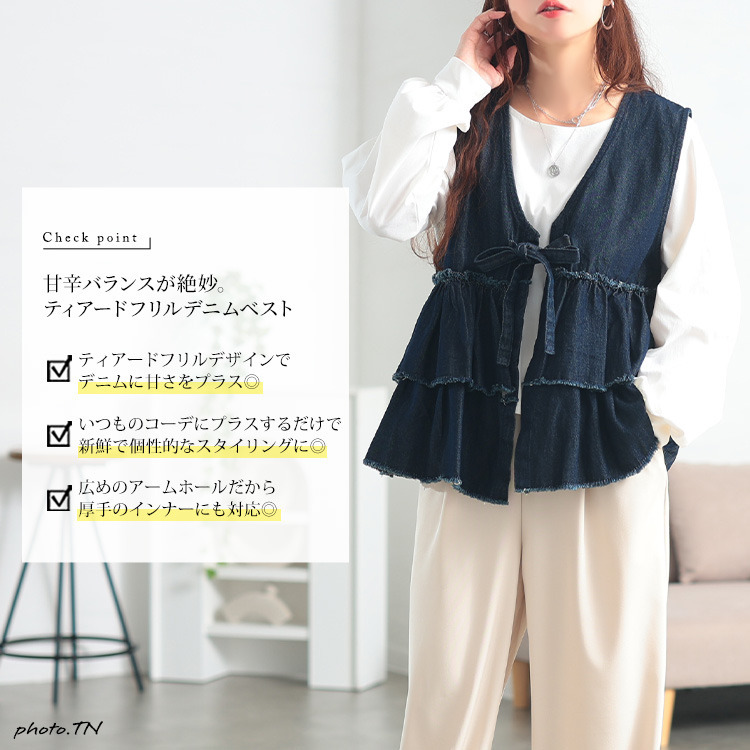 大きいサイズ レディース コットンデニムリボンティアードベスト