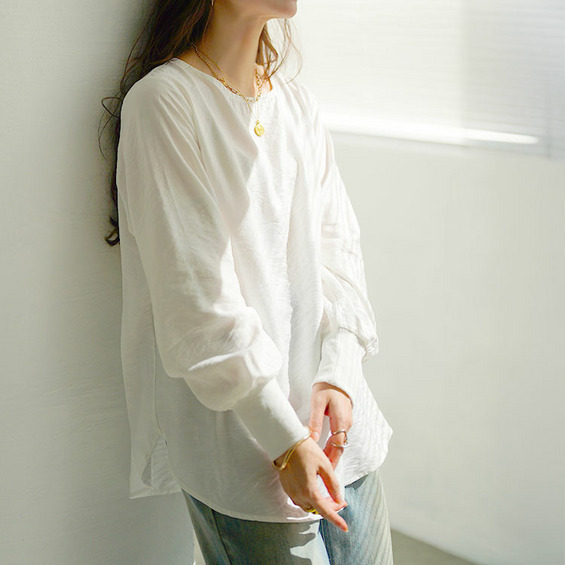 袖口の長めリブとほどよいボリューム袖が、気になる二の腕や肩まわりをやさしくカバー。