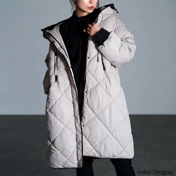 前はダイヤキルティング、後ろはパネル切り替えで膨らみがちな中綿コートをスッキリ見せ