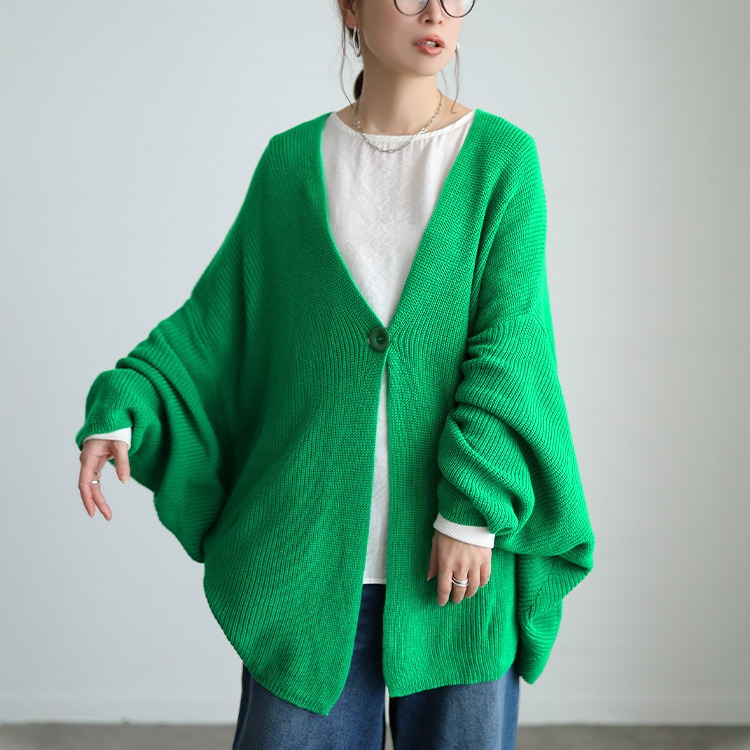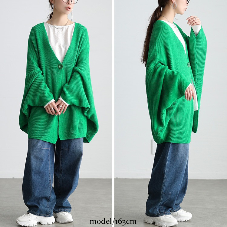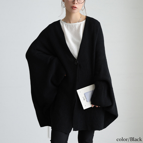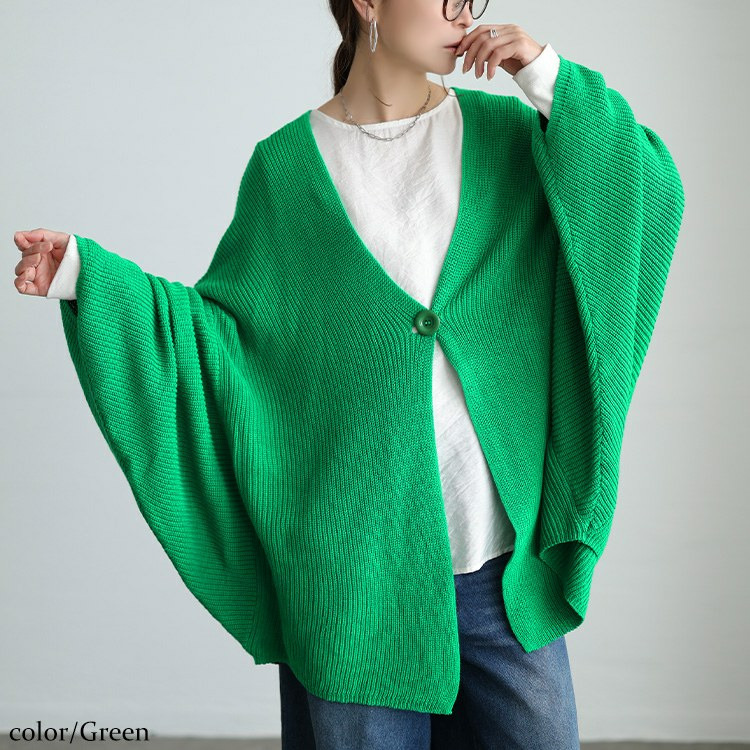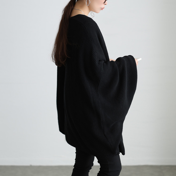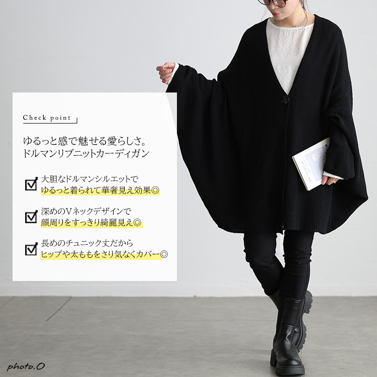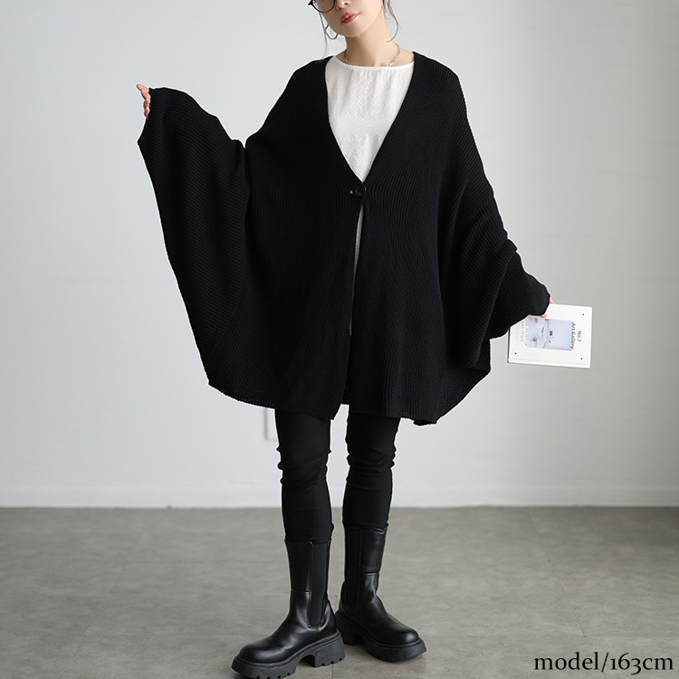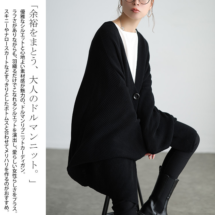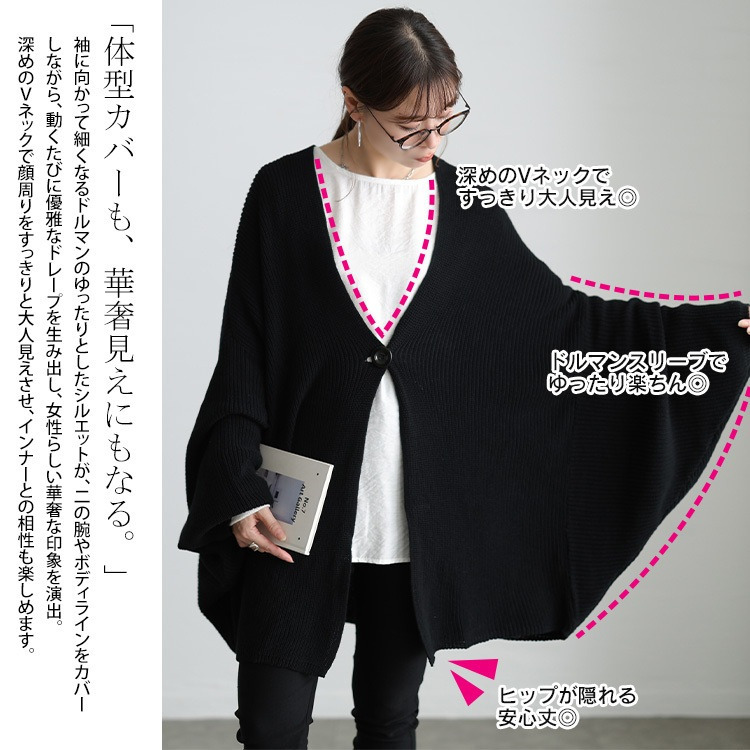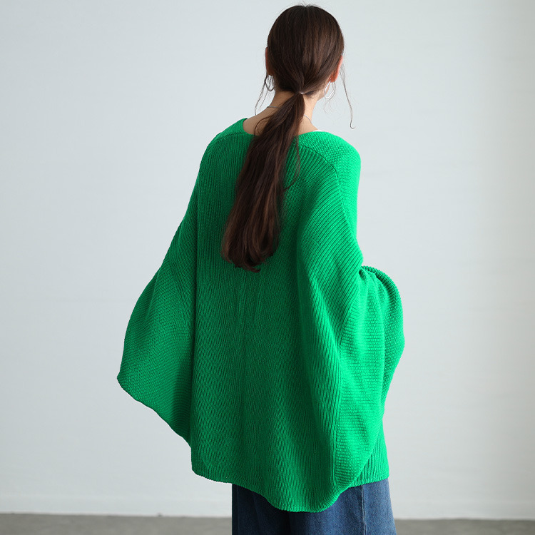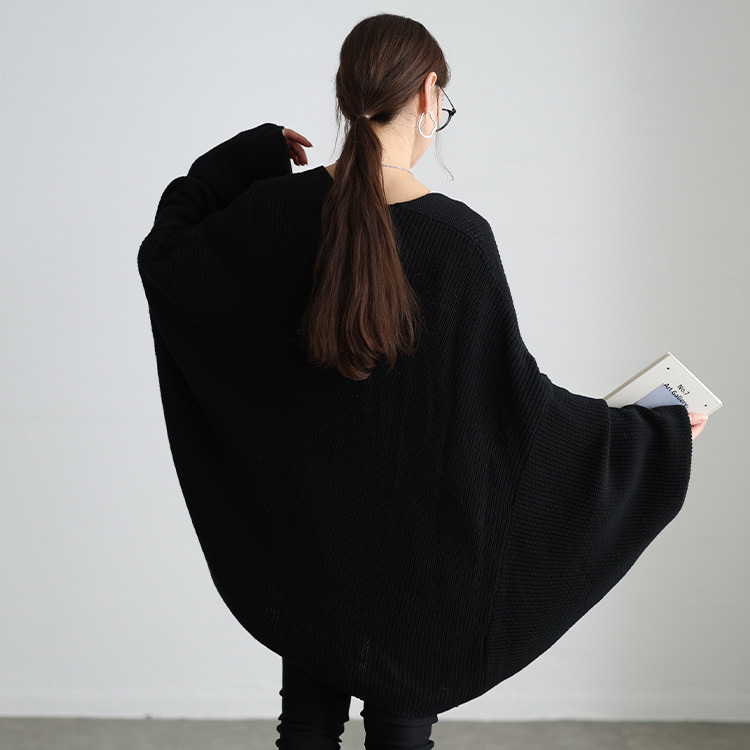 袖に向かって細くなるドルマンのゆったりとしたシルエットが、二の腕やボディラインをカバーしながら、動くたびに優雅なドレープを生み出し、女性らしい華奢な印象を演出。深めのVネックで顔周りをすっきりと大人見えさせ、インナーとの相性も楽しめます。