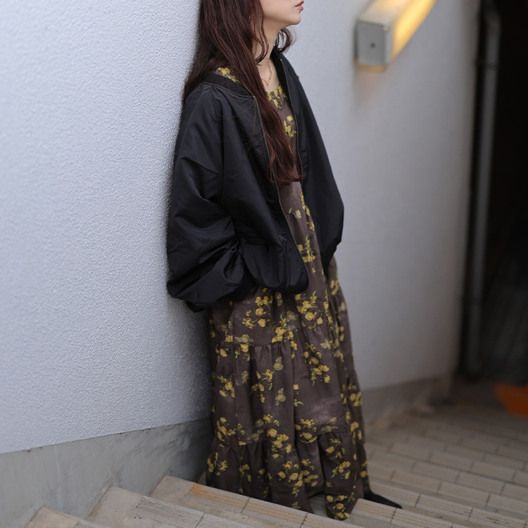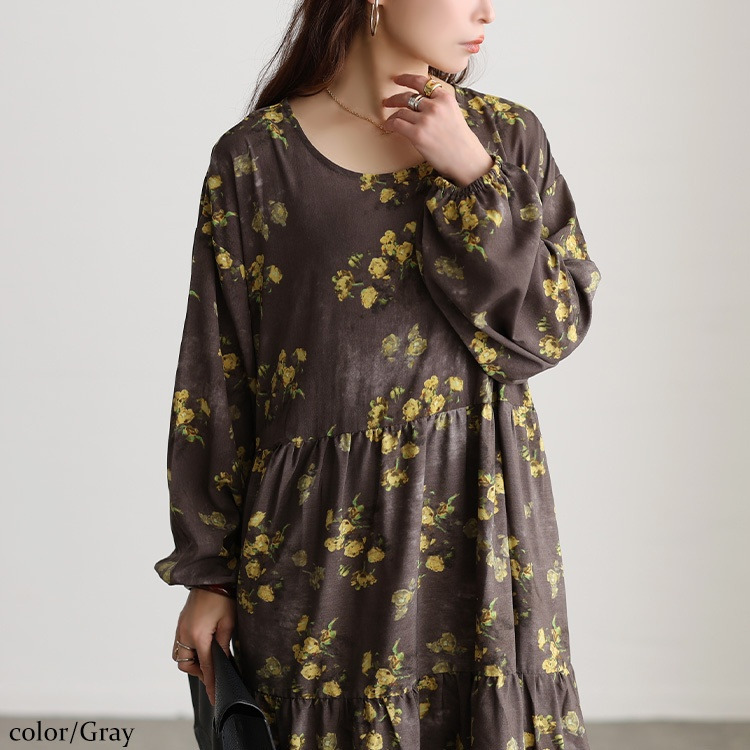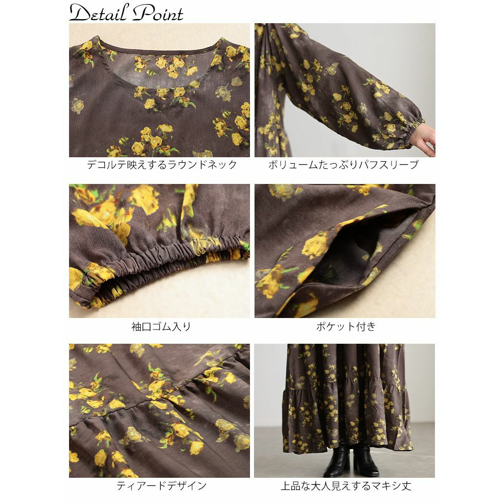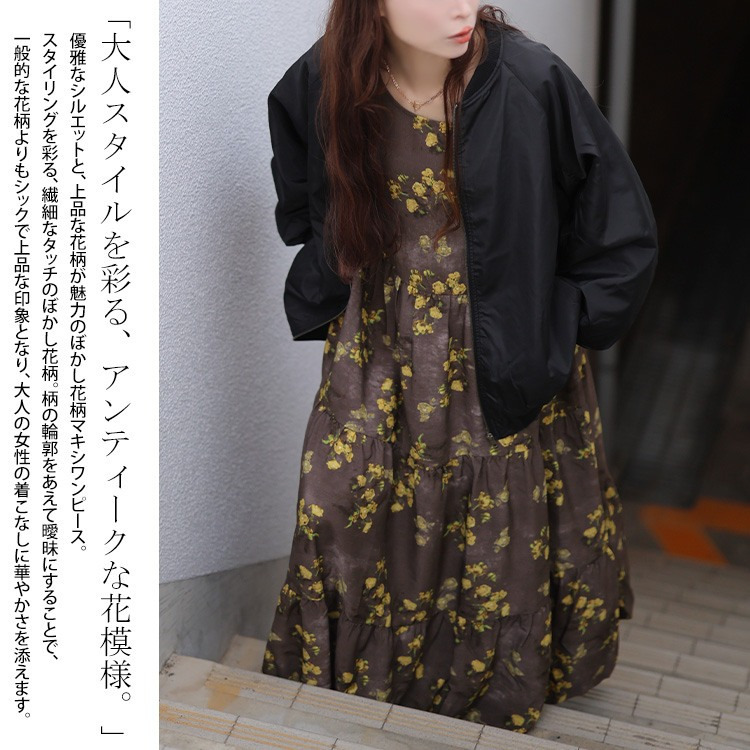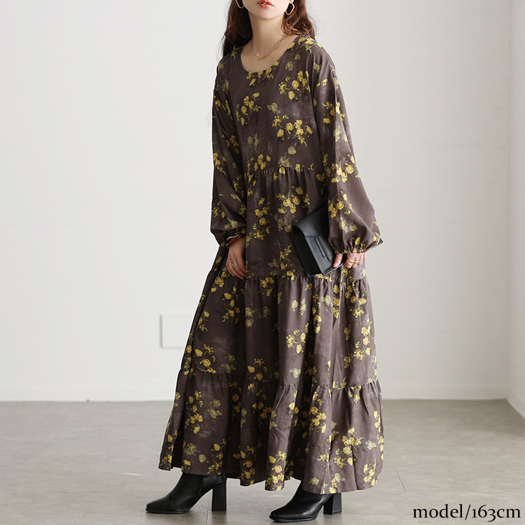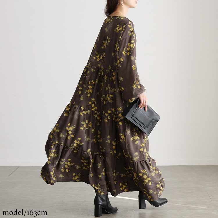 袖のボリュームが二の腕をカバーしつつ、手首を華奢に見せ、ティアードシルエットが歩くたびに優雅でドラマティックな揺れ感を生み出し、ゆったりサイズでボディラインを拾いません。マキシ丈が全体をエレガントにまとめ上げ、甘くなり過ぎず、洗練された雰囲気を演出します。