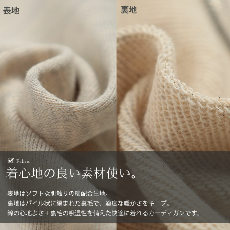 パーカーのラフさとカーディガンのきちんと感をバランスよく融合した一枚。