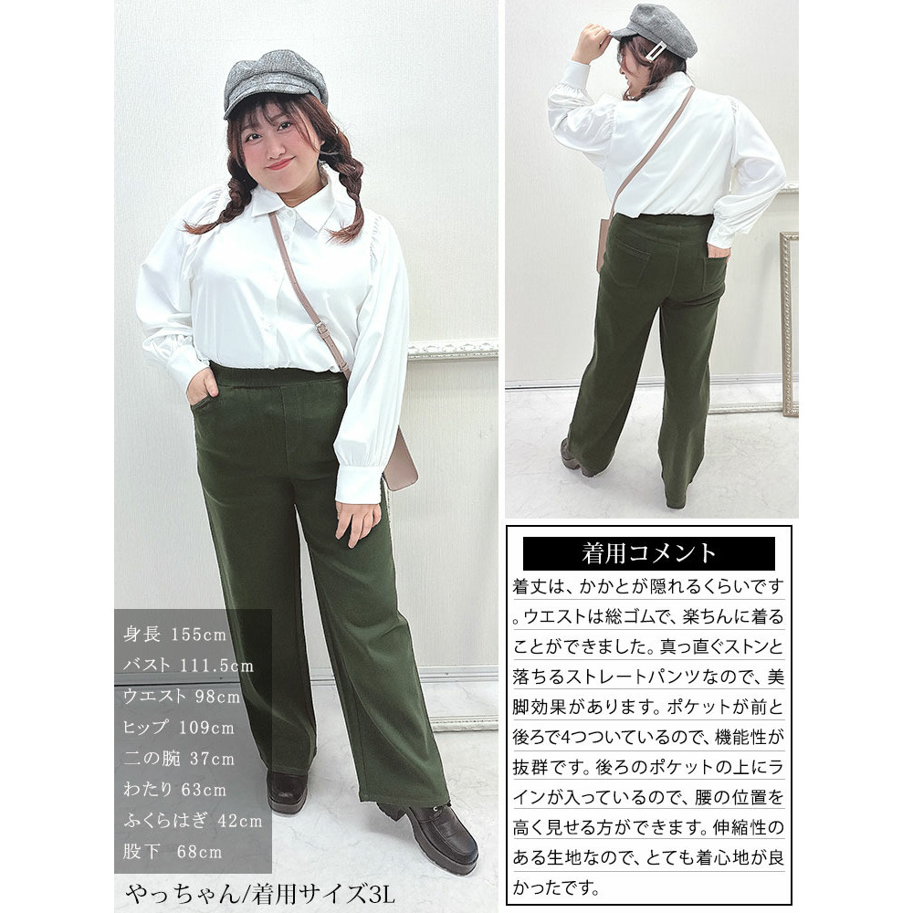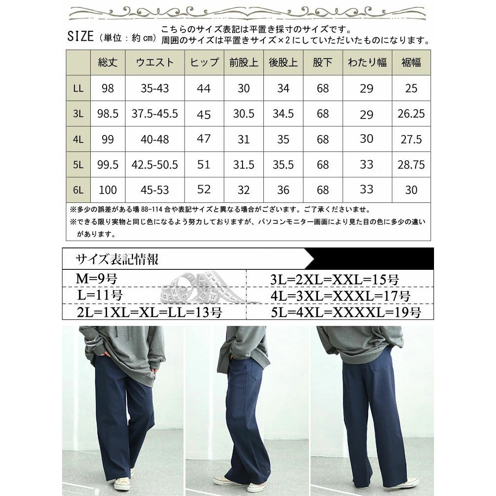 サイズ表記 LL 3L 4L 5L 6L 総丈 98cm 98.5cm 99cm 99.5cm 100cm ウエスト 35-43cm 37.5-45.5cm 40-48cm 42.5-50.5cm 45-53cm ヒップ 44cm 45cm 47cm 51cm 52cm 前股上 30cm 30.5cm 31cm 31.5cm 32cm 後股上 34cm 34.5cm 35cm 35.5cm 36cm 股下 68cm 68cm 68cm 68cm 68cm わたり幅 29cm 29cm 30cm 33cm 33cm 裾幅 25cm 26.25cm 27.5cm 28.75cm 30cm