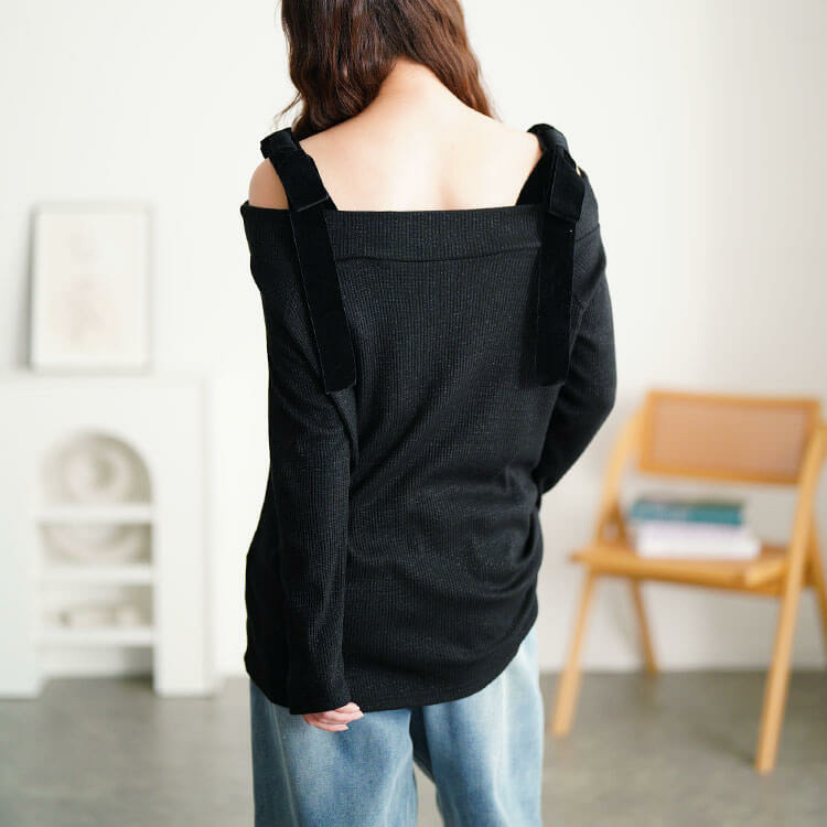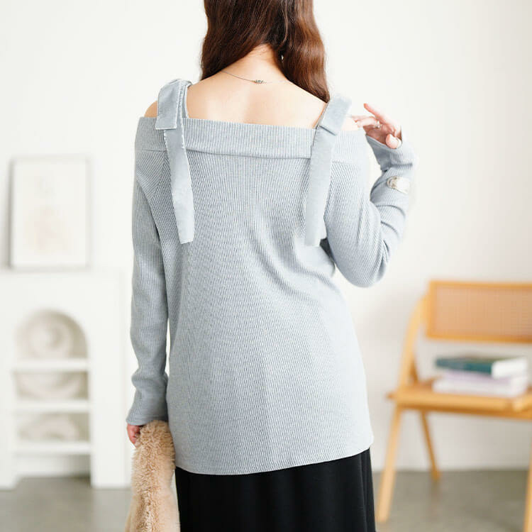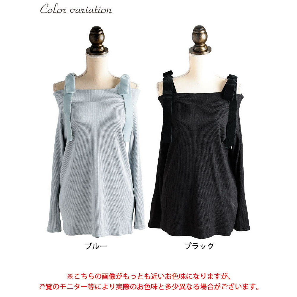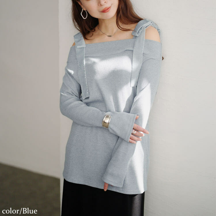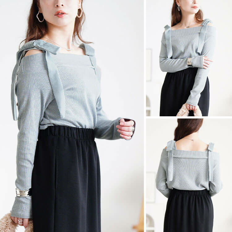 お顔まわりをスッキリ見せるオフショルダーとキュートなリボン肩紐で小顔効果抜群!