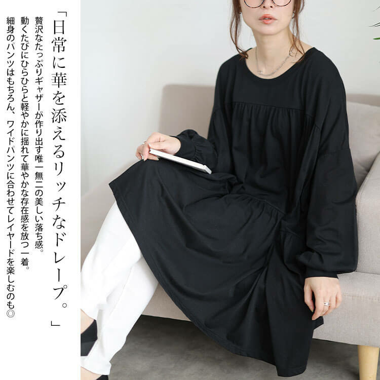 高めの胸元切り替え&たっぷりギャザーがぽっこりお腹・大きなお胸をふわりと包み込み愛らしく着痩せして見せてくれます◎